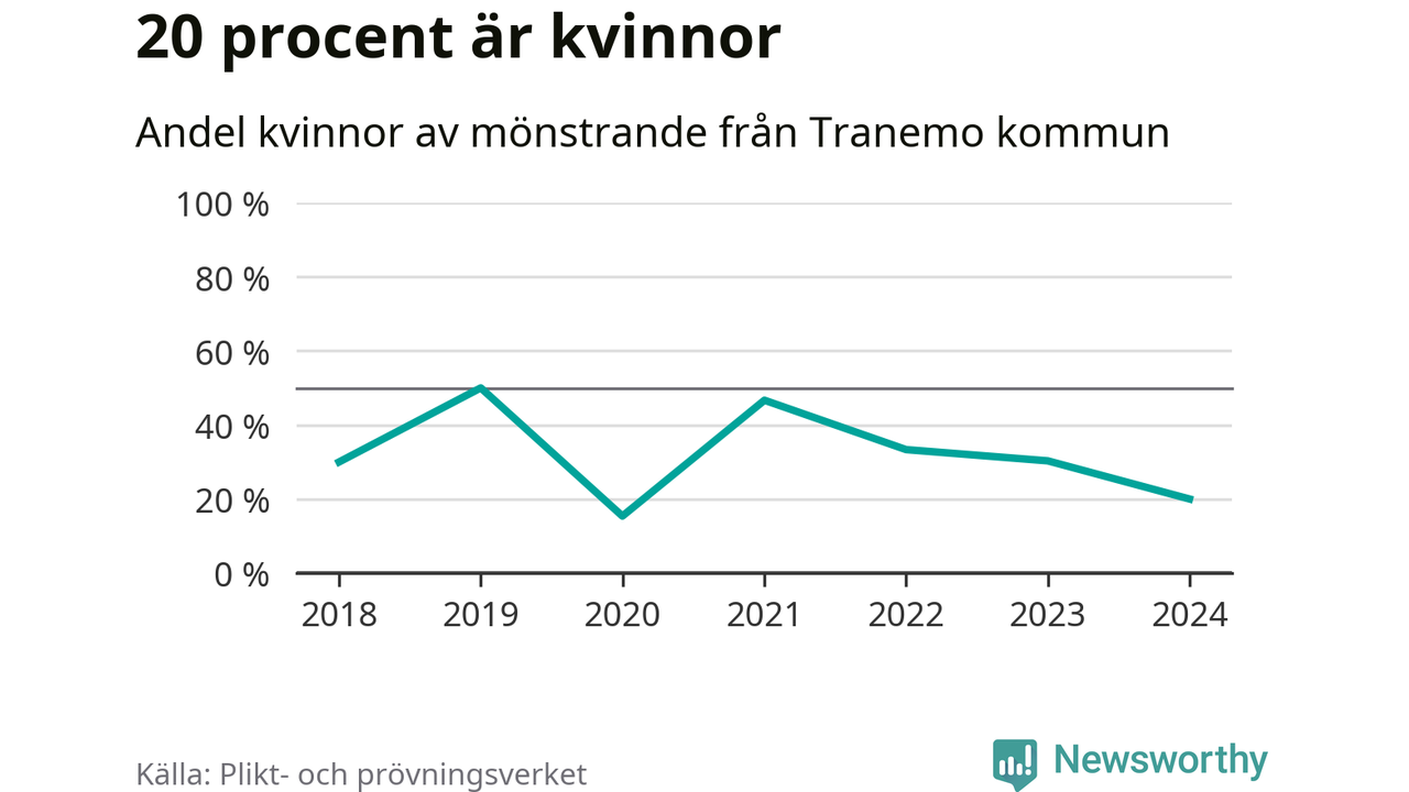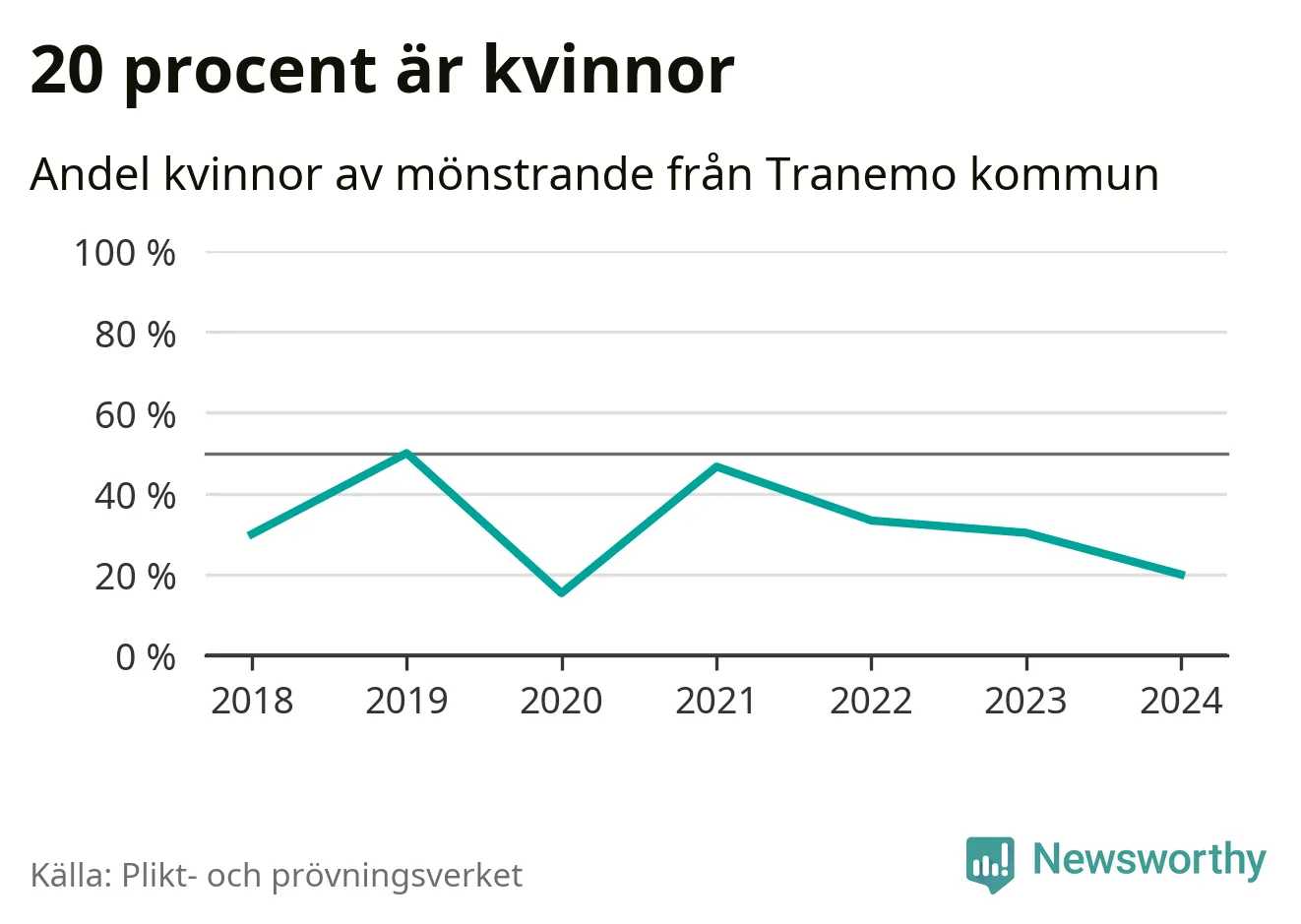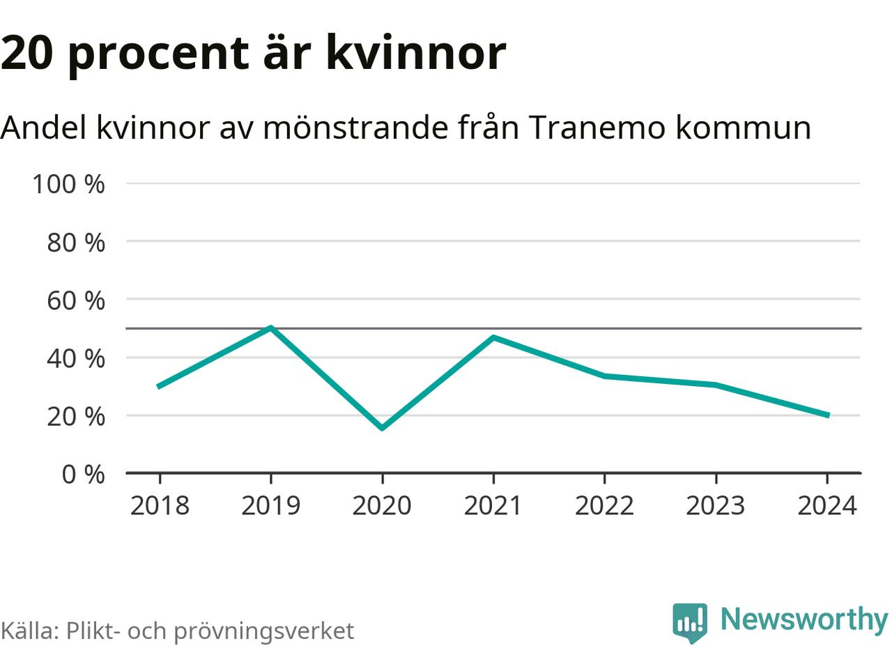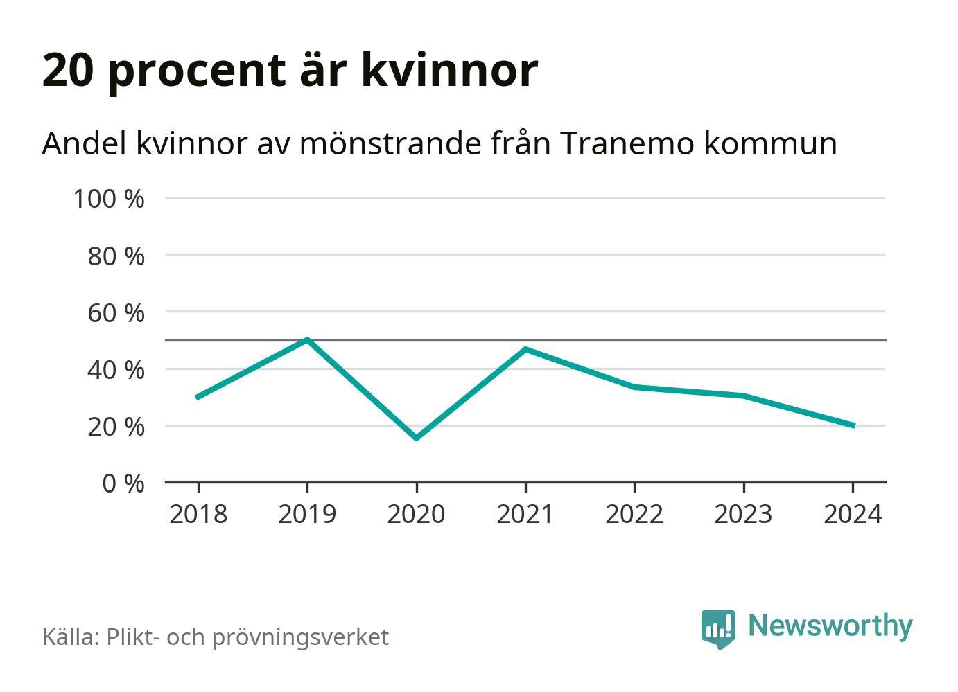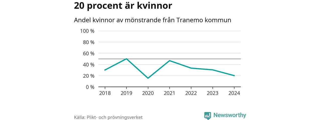 Åtta av de som kallats till mönstring från Tranemo är kvinnor, vilket motsvarar 20 procent av de mönstrande. Som mest har tio kvinnor kallats från kommunen (2023 och 2022). I riket som helhet är 30 procent av de mönstrande tjejer.
