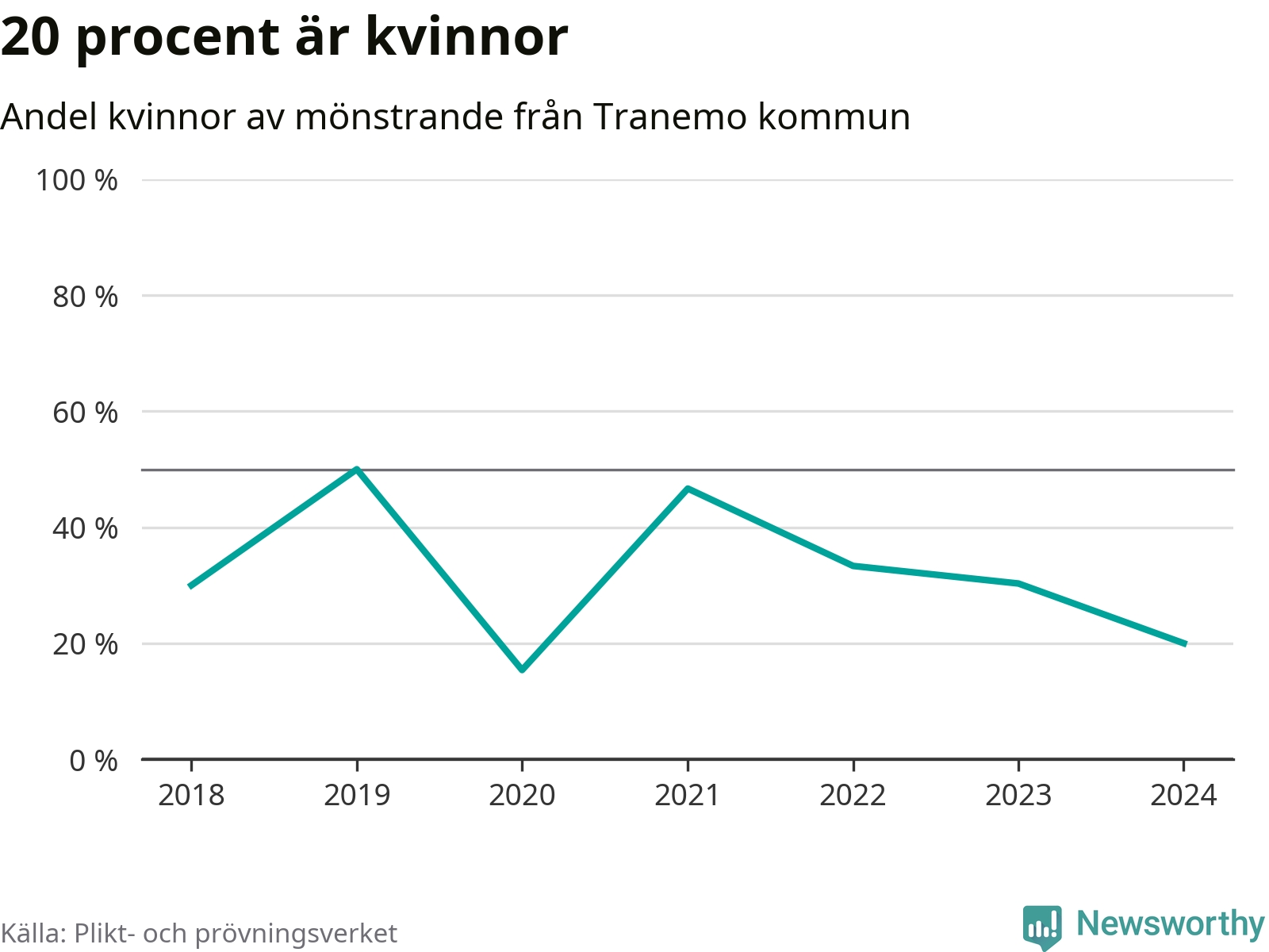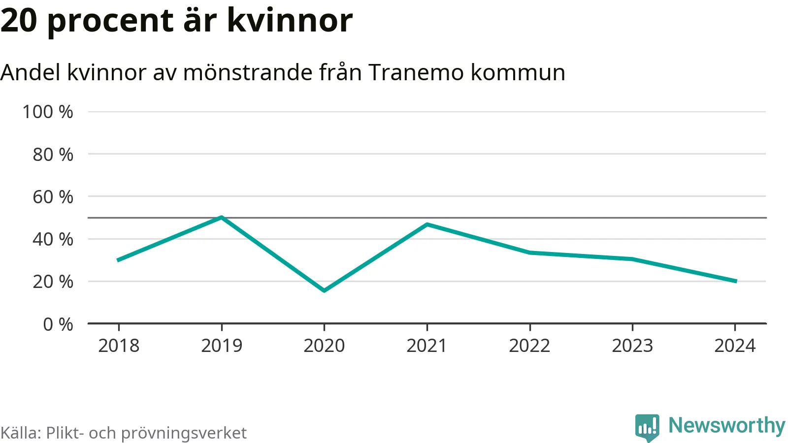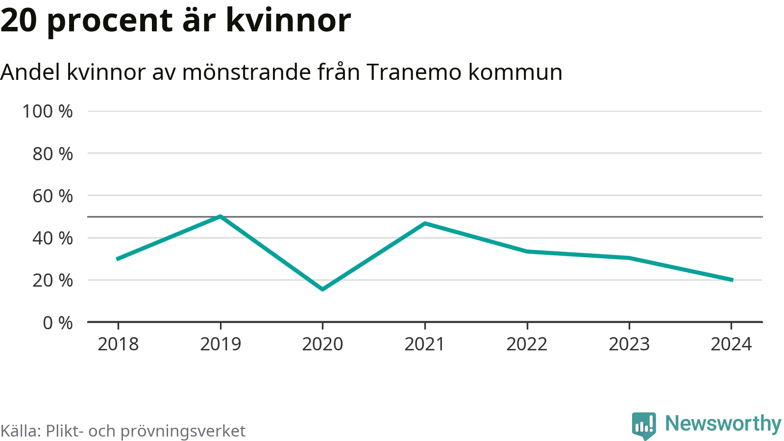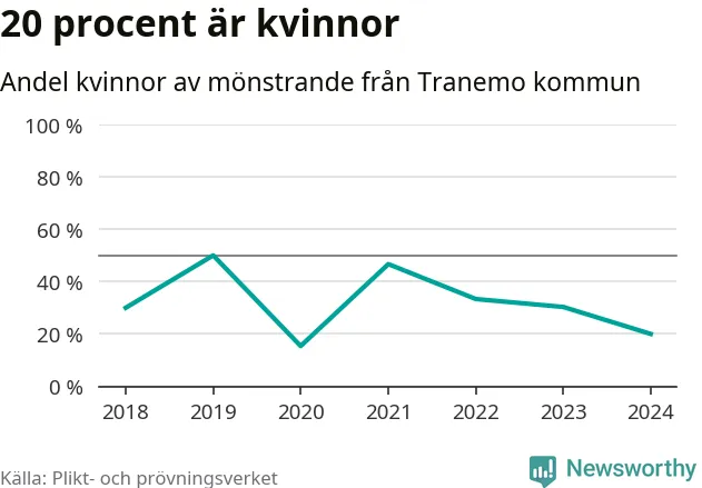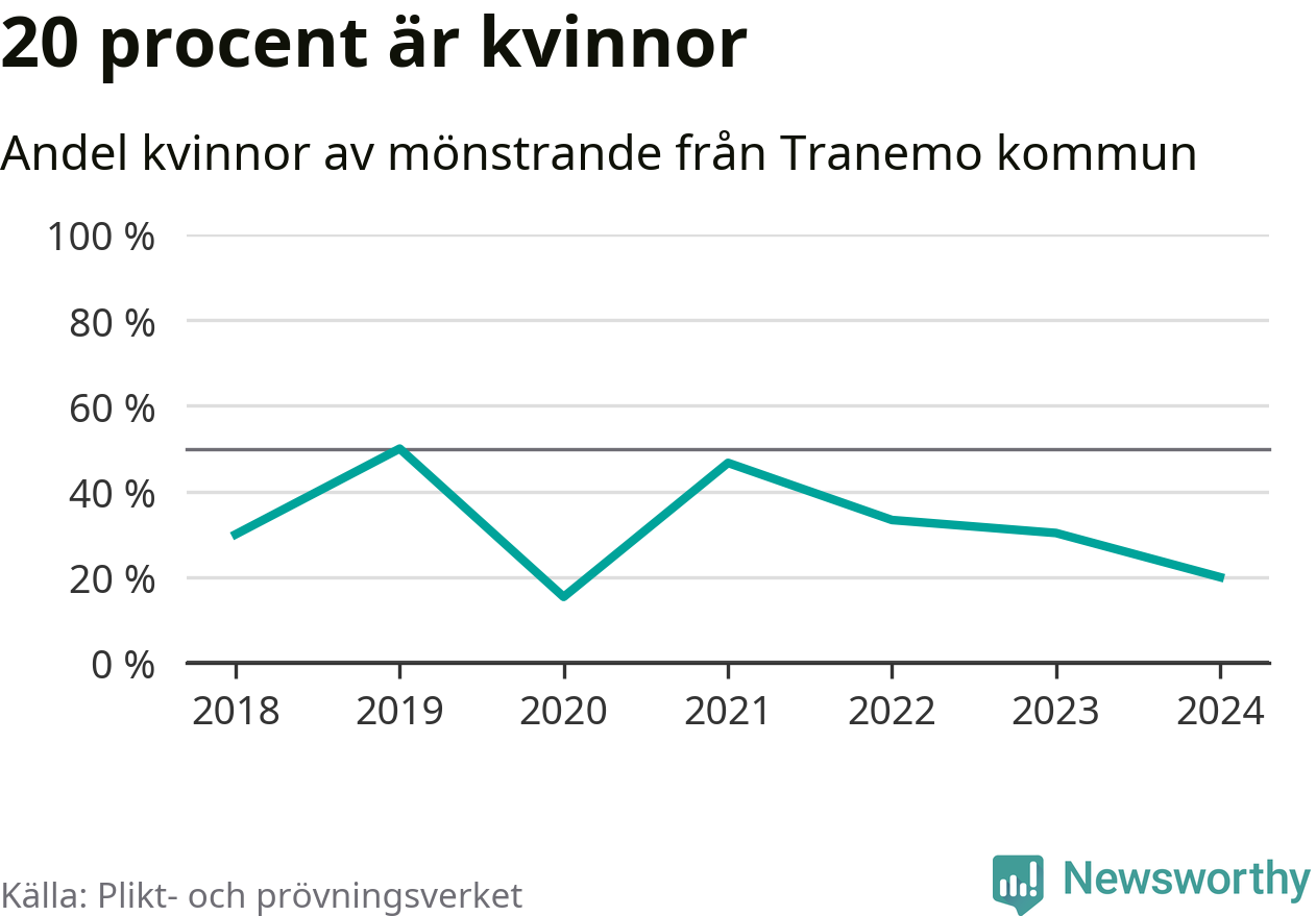 Åtta av de som kallats till mönstring från Tranemo är kvinnor, vilket motsvarar 20 procent av de mönstrande. Som mest har tio kvinnor kallats från kommunen (2023 och 2022). I riket som helhet är 30 procent av de mönstrande tjejer.