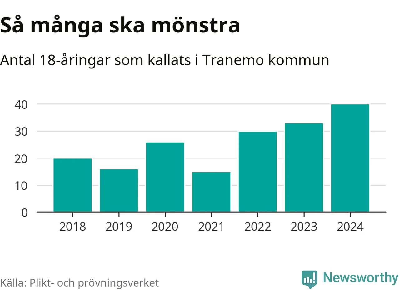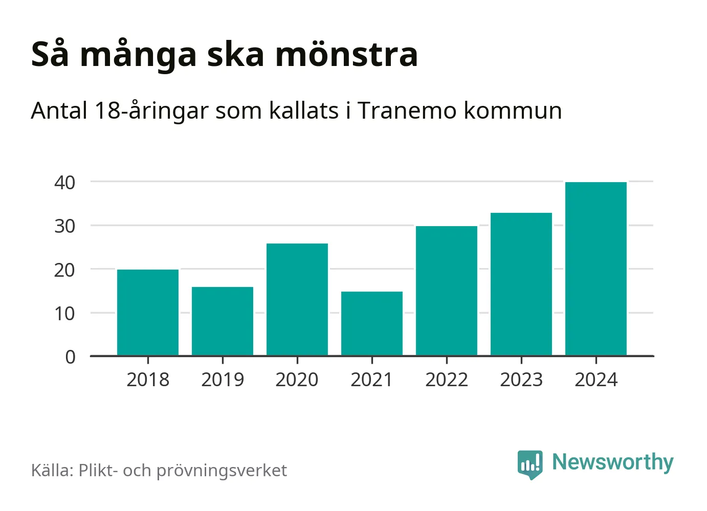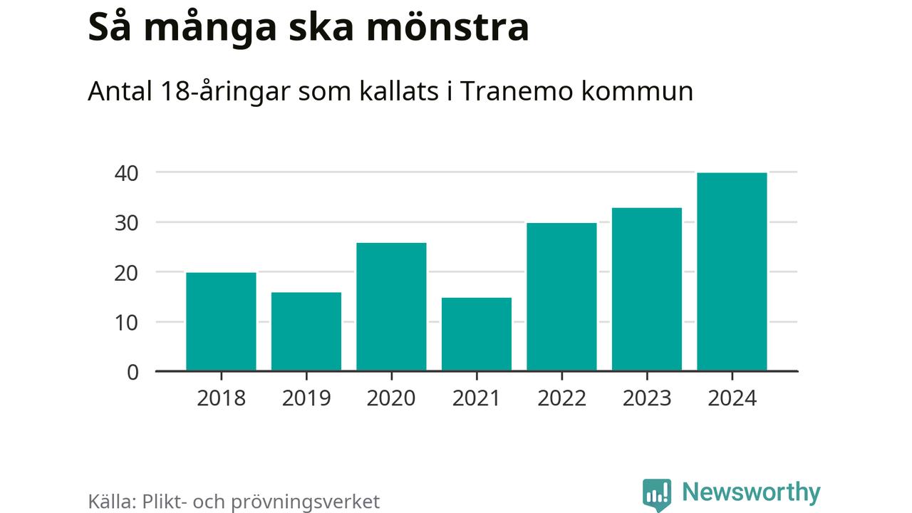 40 personer är det högsta antalet kallade i Tranemo sedan 2018, som är första året med statistik på kommunnivå (värnplikten återinfördes 2017), och sju mönstrande mer än 2023. 2018 kallades som jämförelse 20 artonåringar från Tranemo till mönstring. Det motsvarade ungefär 13 procent av årskullen född år 2000. Totalt från Västra Götalands län kallas 4 562 personer födda 2006 i år.