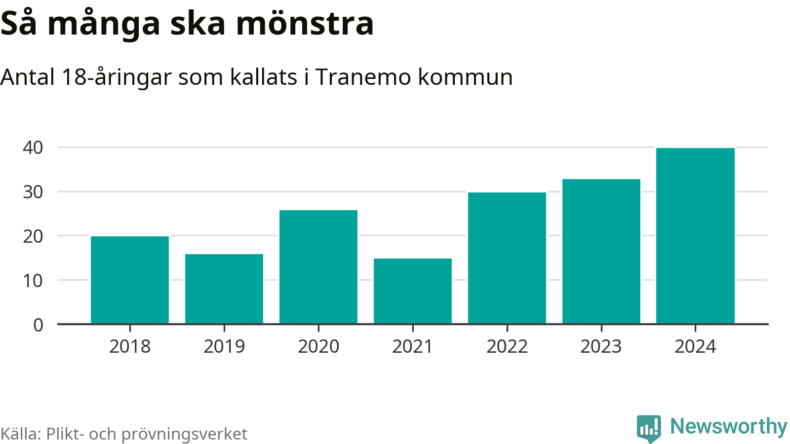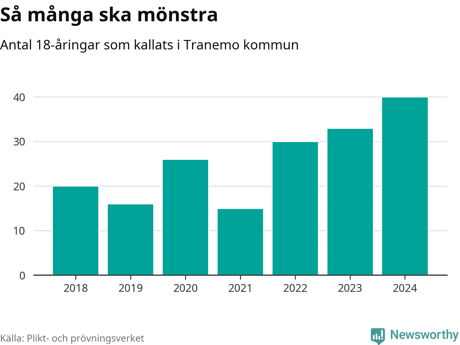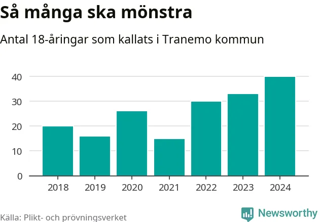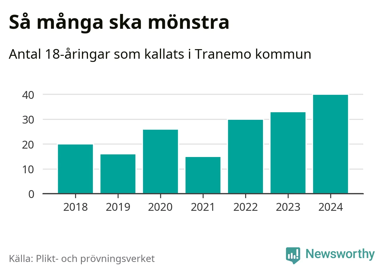 40 personer är det högsta antalet kallade i Tranemo sedan 2018, som är första året med statistik på kommunnivå (värnplikten återinfördes 2017), och sju mönstrande mer än 2023. 2018 kallades som jämförelse 20 artonåringar från Tranemo till mönstring. Det motsvarade ungefär 13 procent av årskullen född år 2000. Totalt från Västra Götalands län kallas 4 562 personer födda 2006 i år.