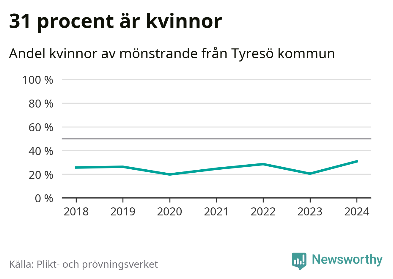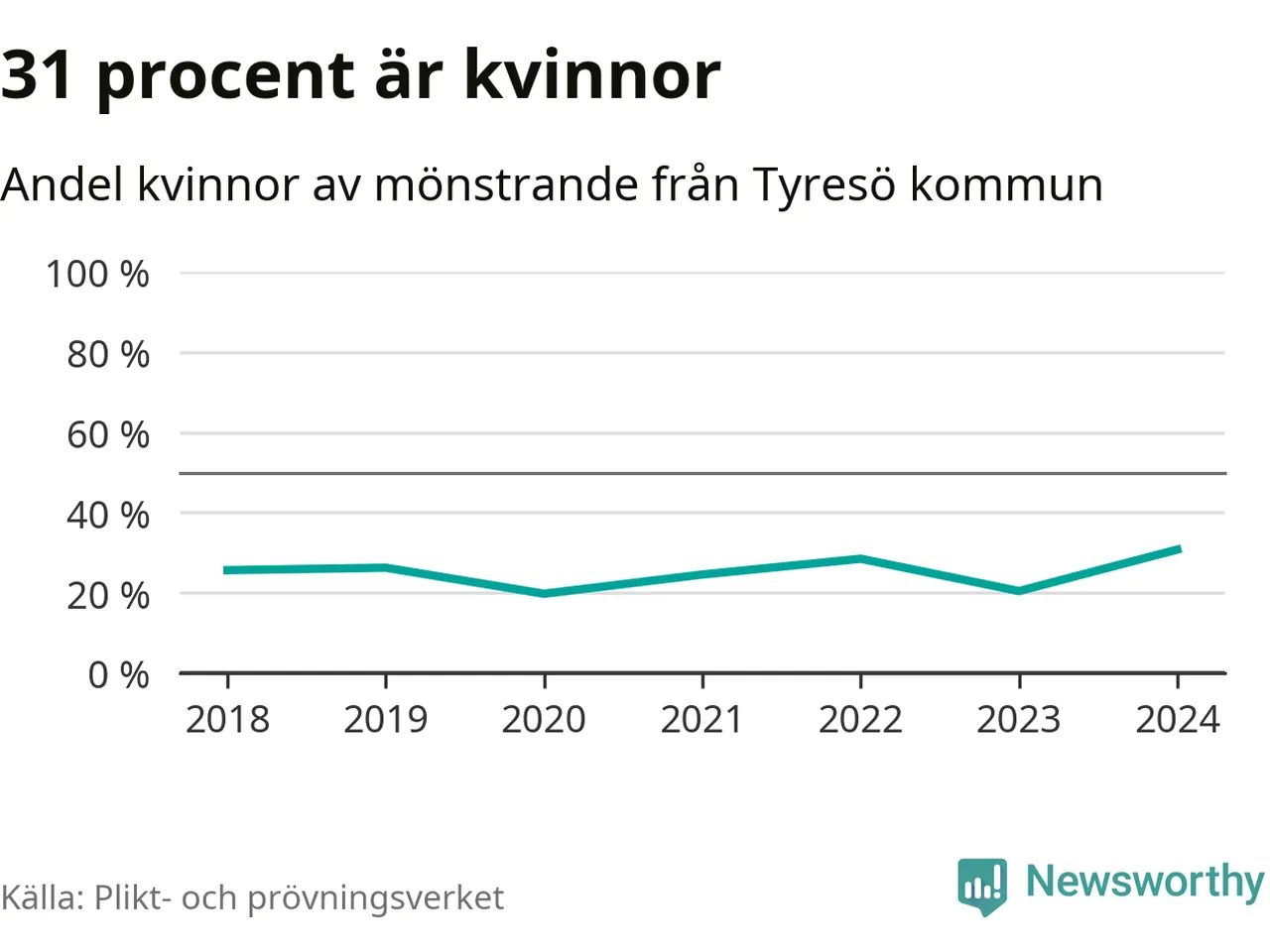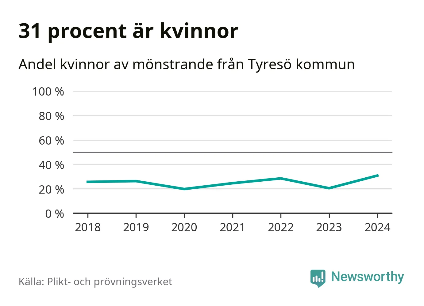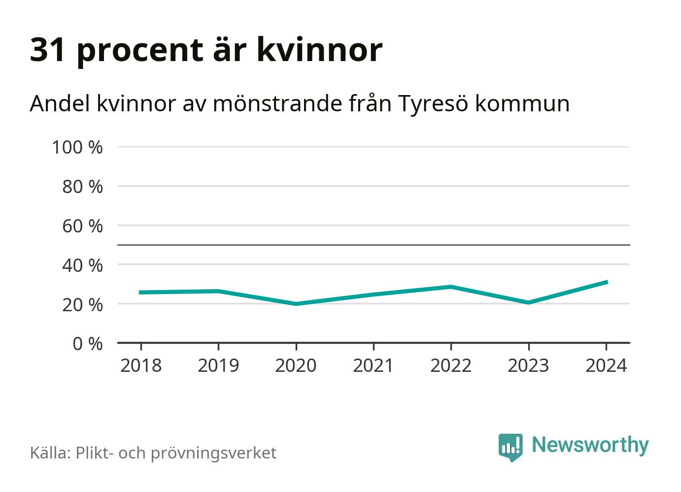 48 av de som kallats till mönstring från Tyresö är kvinnor, vilket motsvarar 31 procent av de mönstrande. Det är fler än något år sedan värnplikten återinfördes. I riket som helhet är 30 procent av de mönstrande tjejer.