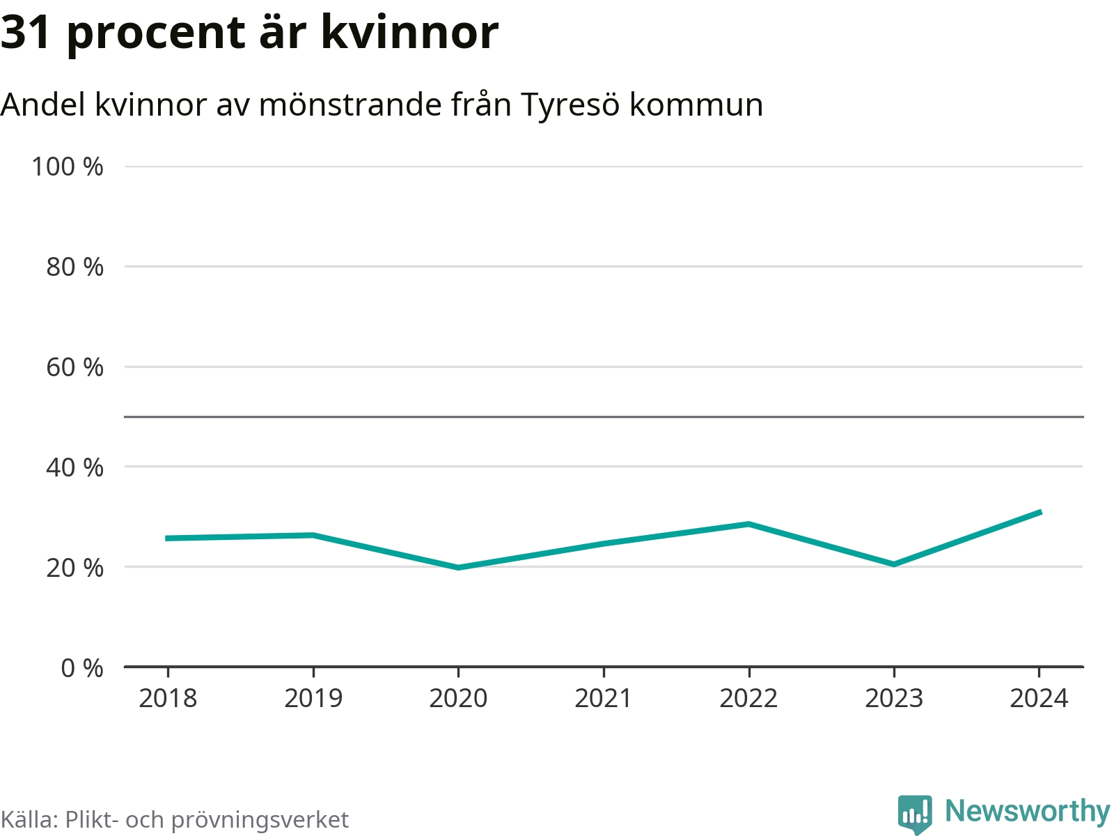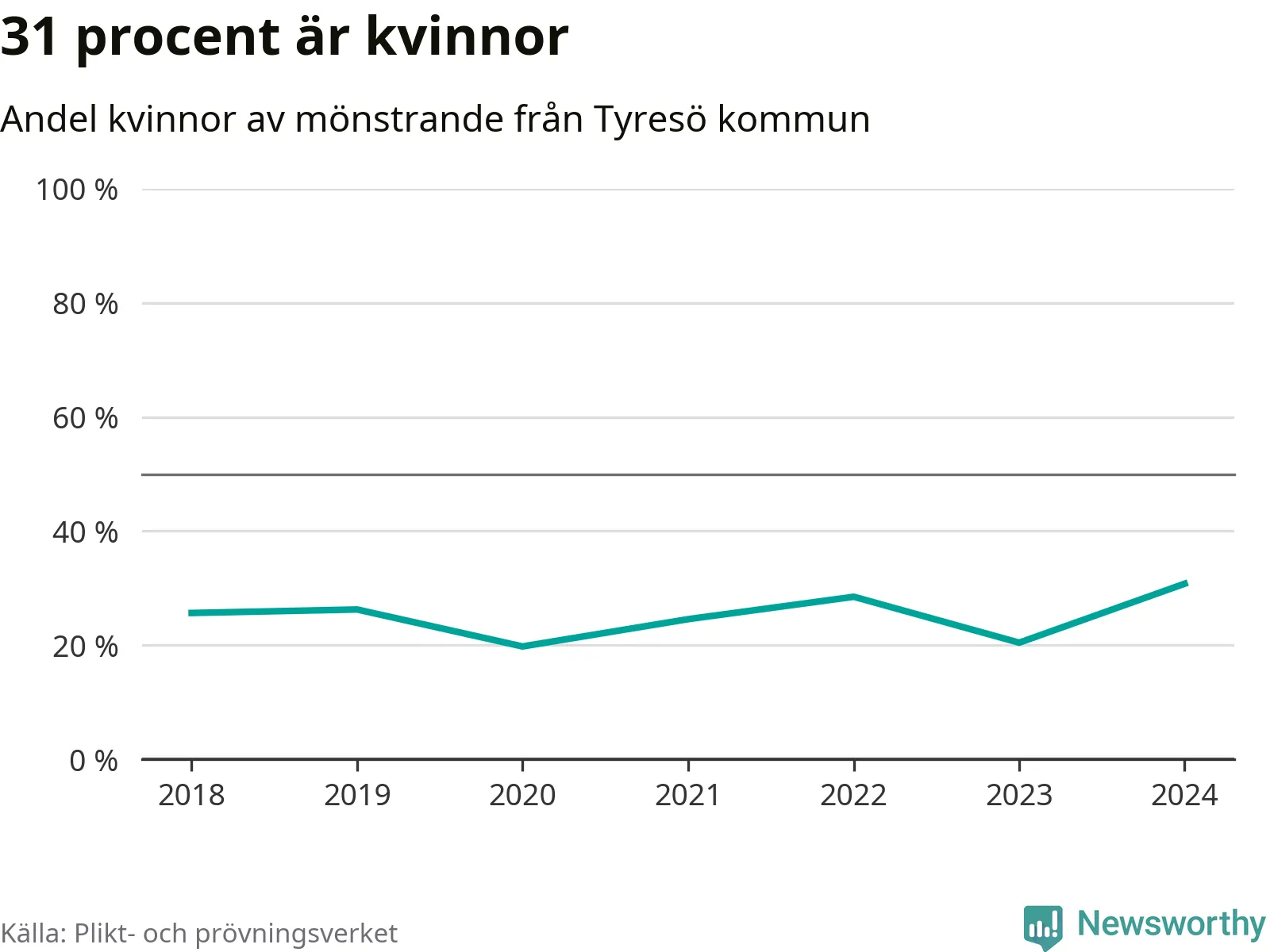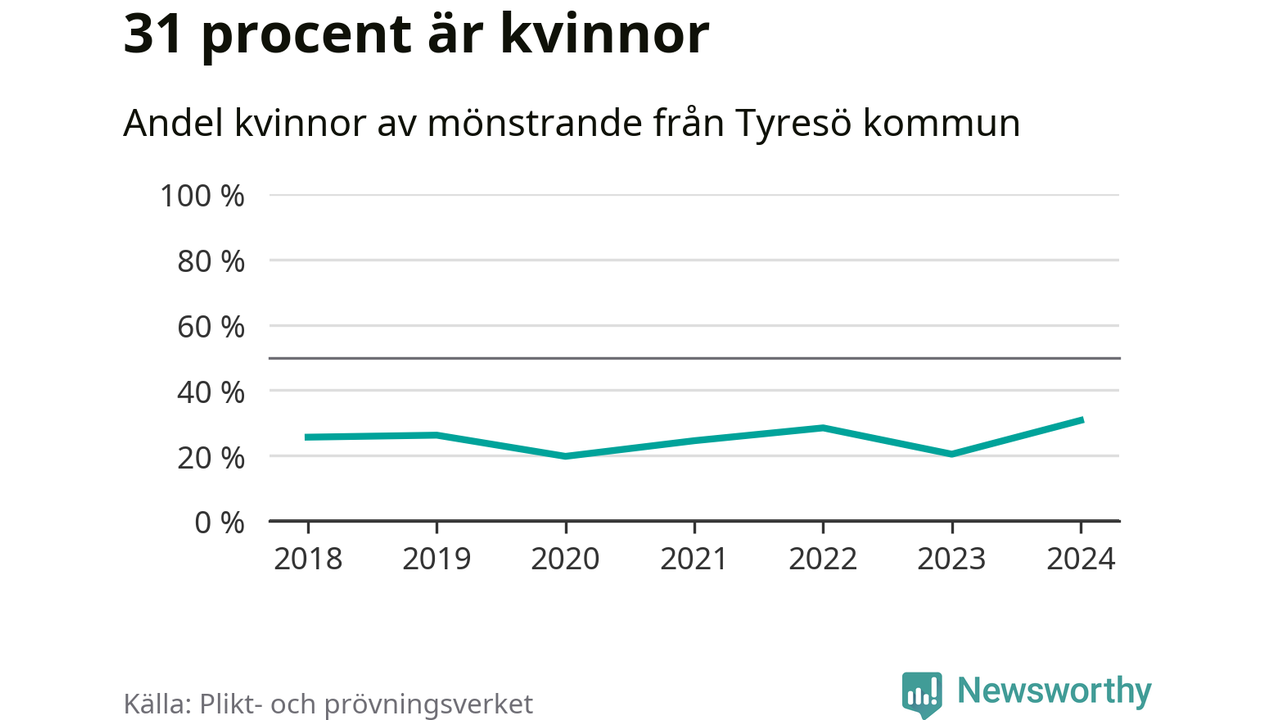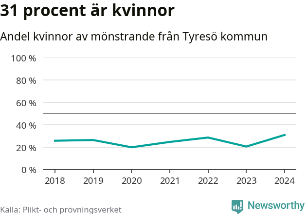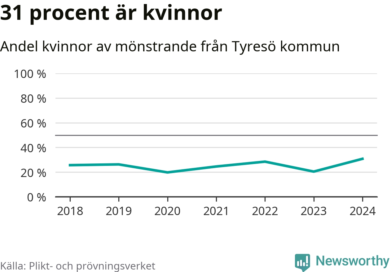 48 av de som kallats till mönstring från Tyresö är kvinnor, vilket motsvarar 31 procent av de mönstrande. Det är fler än något år sedan värnplikten återinfördes. I riket som helhet är 30 procent av de mönstrande tjejer.