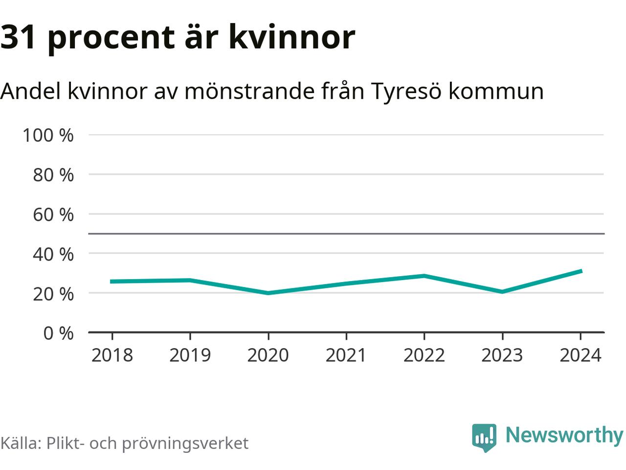 Av de som skrivits in till någon av Försvarmaktens grundutbildningar det senaste året, från juni 2023 till mars i år, kommer 56 (48 män och åtta kvinnor) från Tyresö. 49 av dessa antogs efter att ha kallats till mönstring.