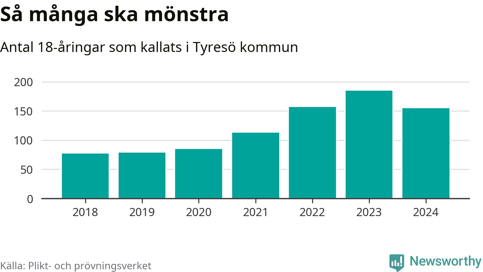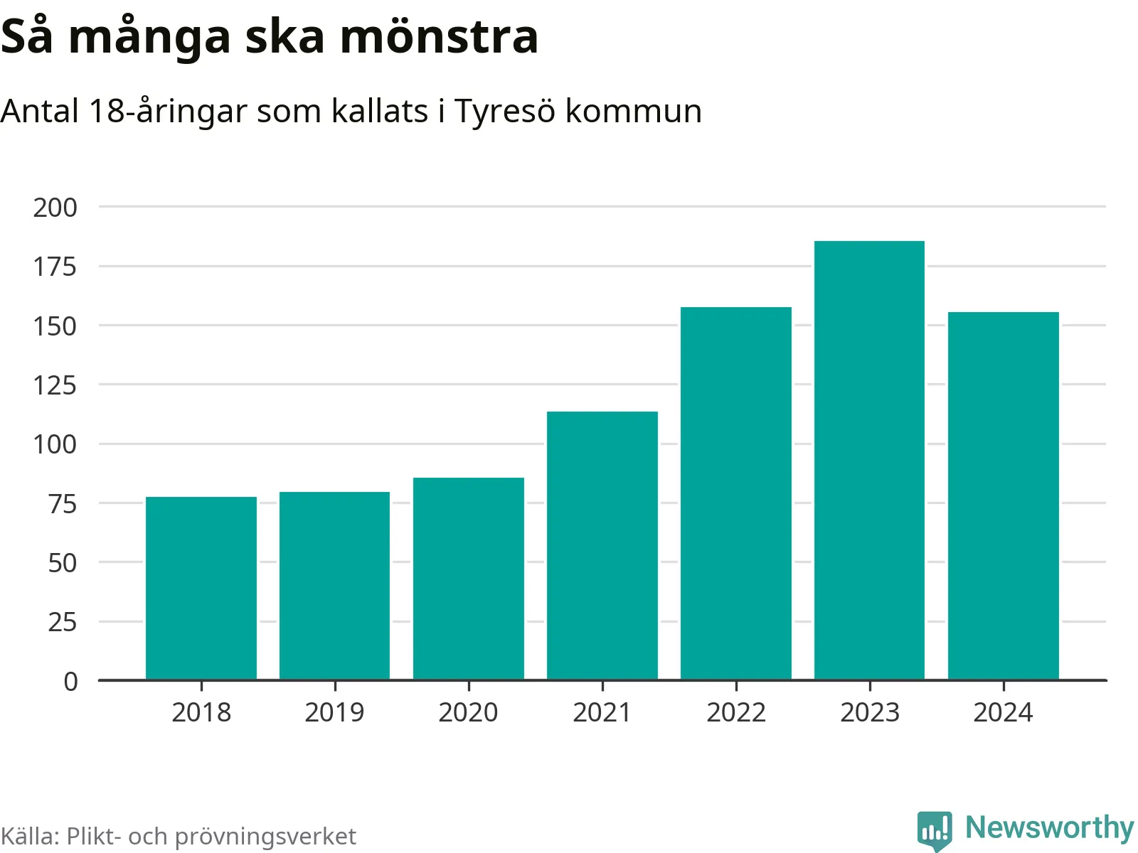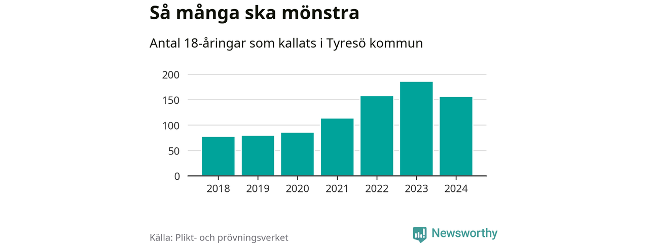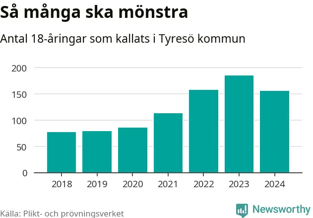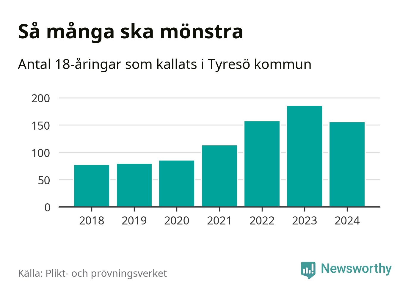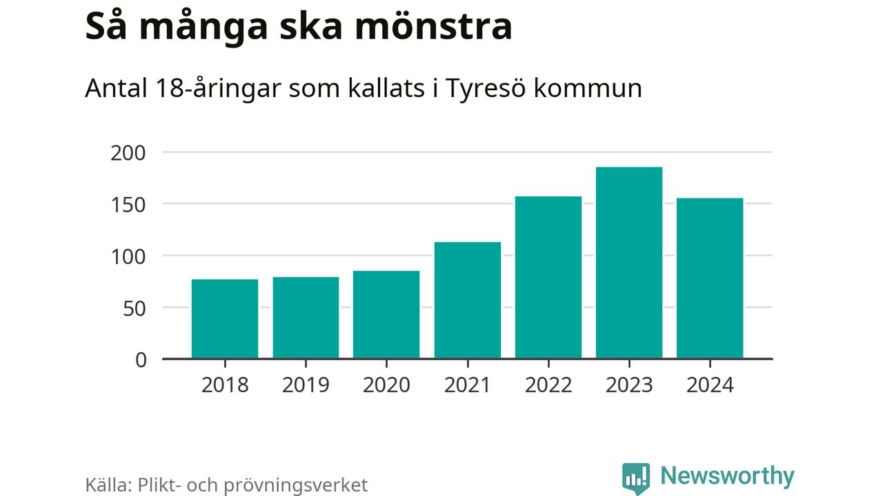 156 personer är 30 färre än 2023. 2018 kallades som jämförelse 78 artonåringar från Tyresö till mönstring. Det motsvarade ungefär 12 procent av årskullen född år 2000. Totalt från Stockholms län kallas 6 488 personer födda 2006 i år.