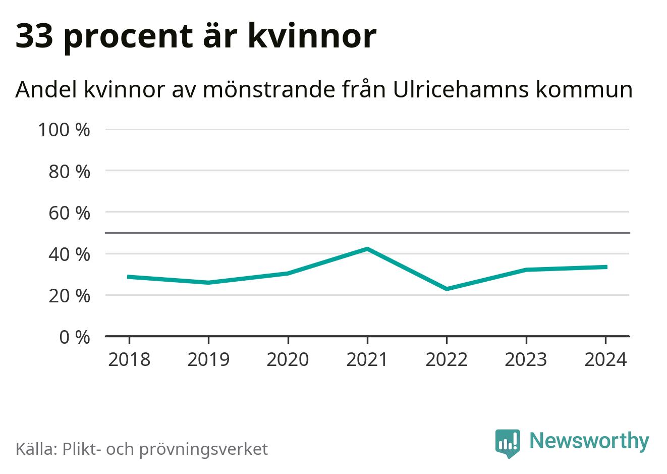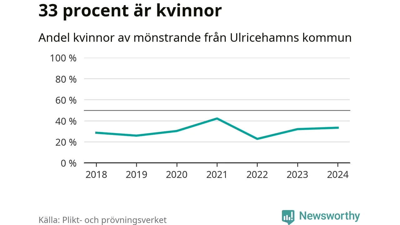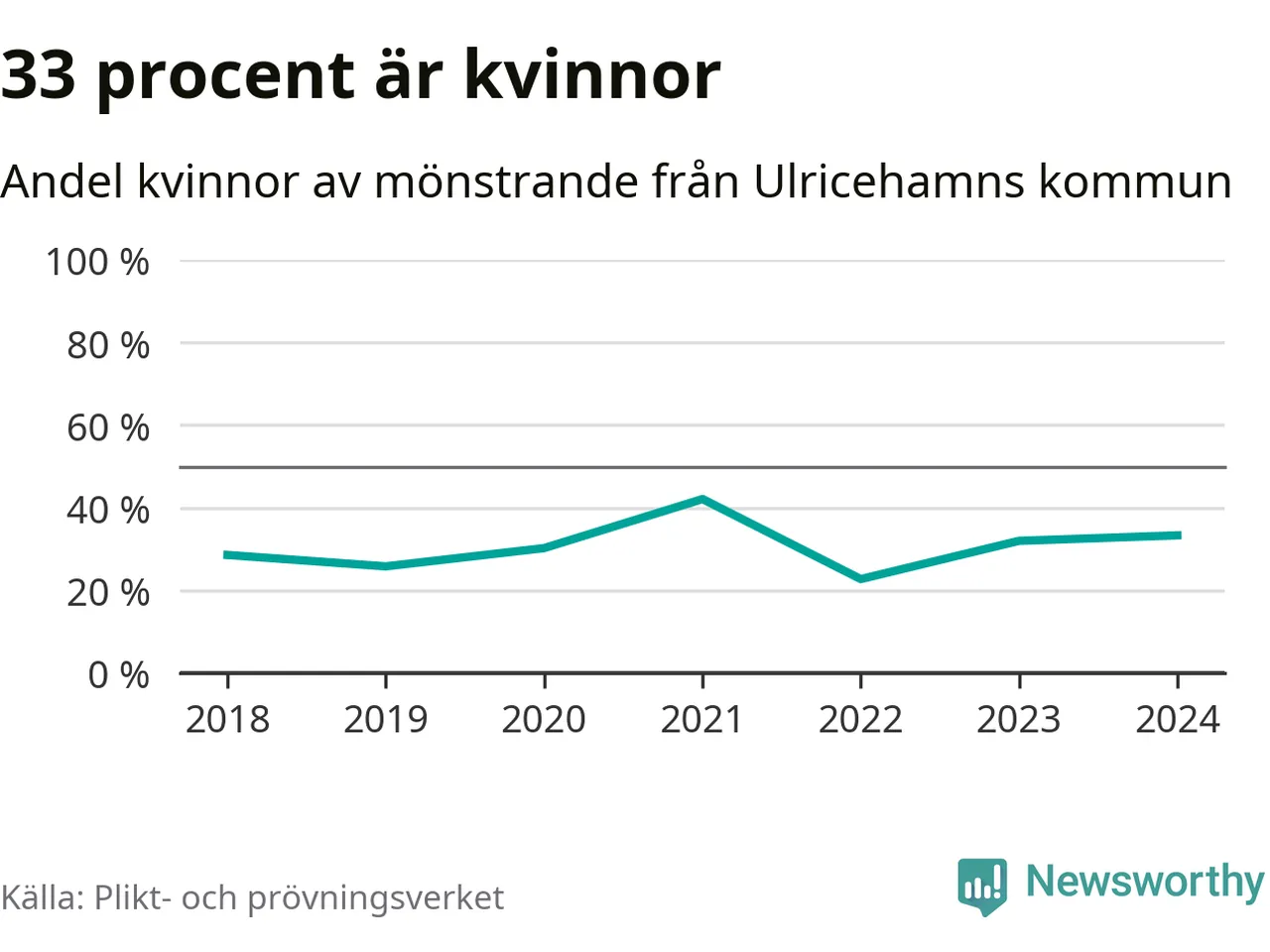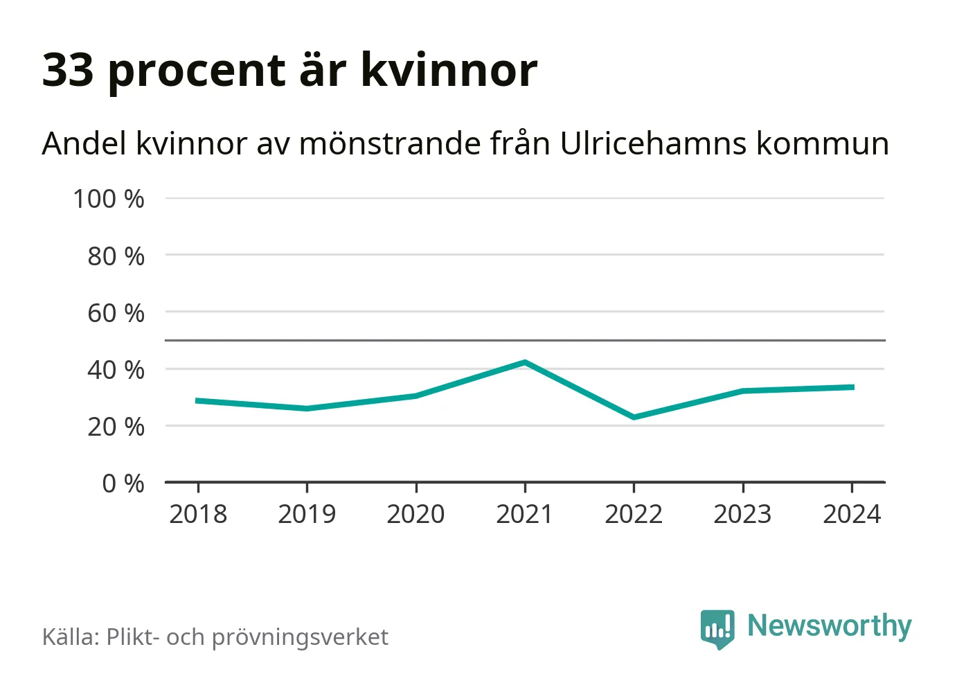 22 av de som kallats till mönstring från Ulricehamn är kvinnor, vilket motsvarar 33 procent av de mönstrande. I absoluta tal är det fler kvinnor än något år sedan värnplikten återinfördes, men 2021 var en större andel av de mönstrande från kommunen kvinnor (42 procent). I riket som helhet är 30 procent av de mönstrande tjejer.