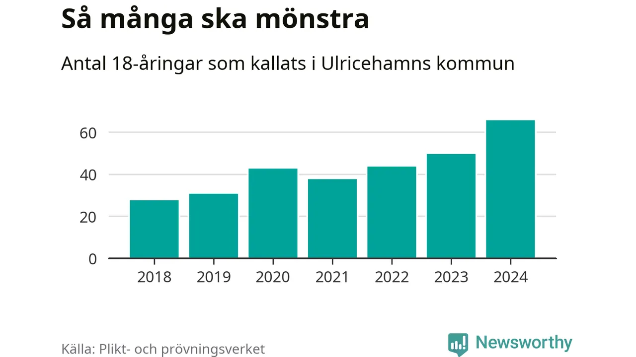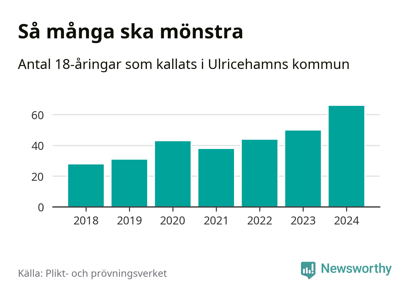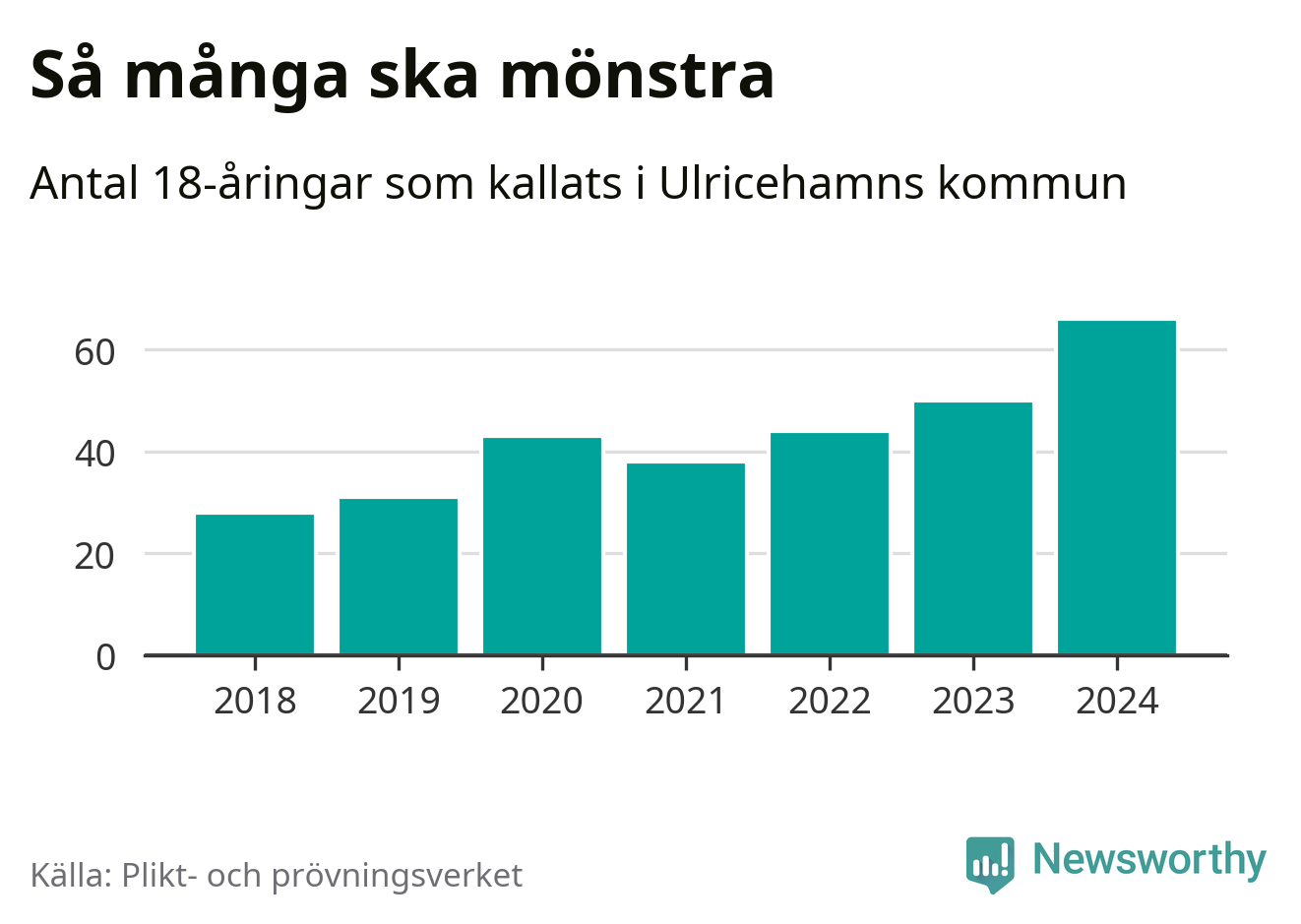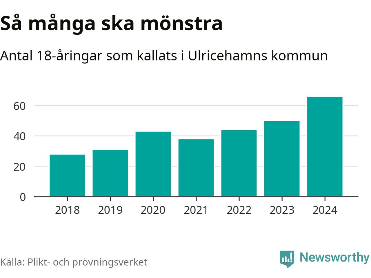66 personer är det högsta antalet kallade i Ulricehamn sedan 2018, som är första året med statistik på kommunnivå (värnplikten återinfördes 2017), och 16 mönstrande mer än 2023. 2018 kallades som jämförelse 28 artonåringar från Ulricehamn till mönstring. Det motsvarade ungefär 10 procent av årskullen född år 2000. Totalt från Västra Götalands län kallas 4 562 personer födda 2006 i år.