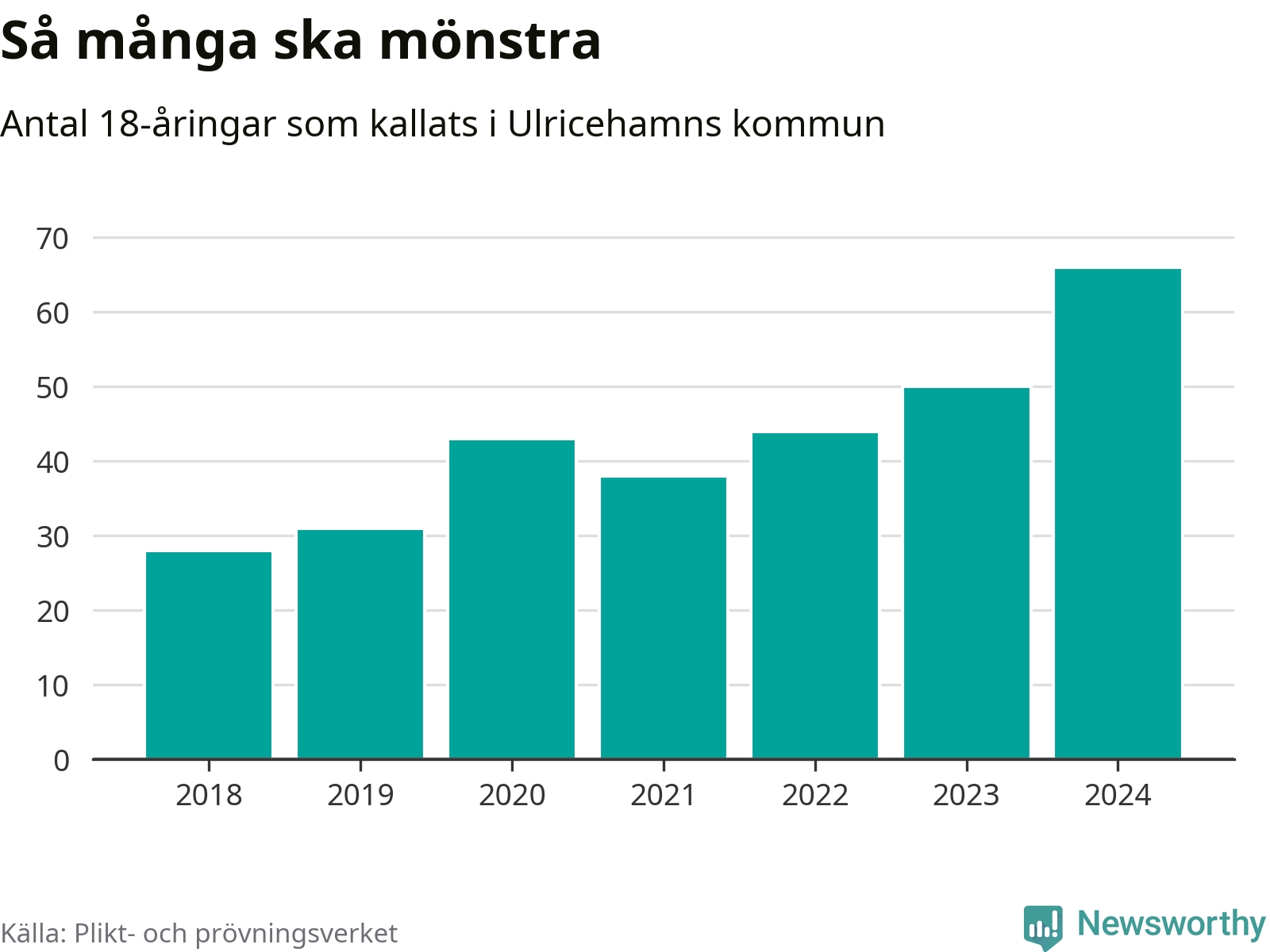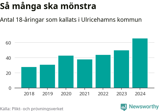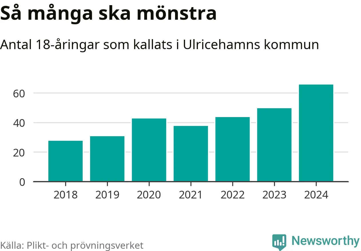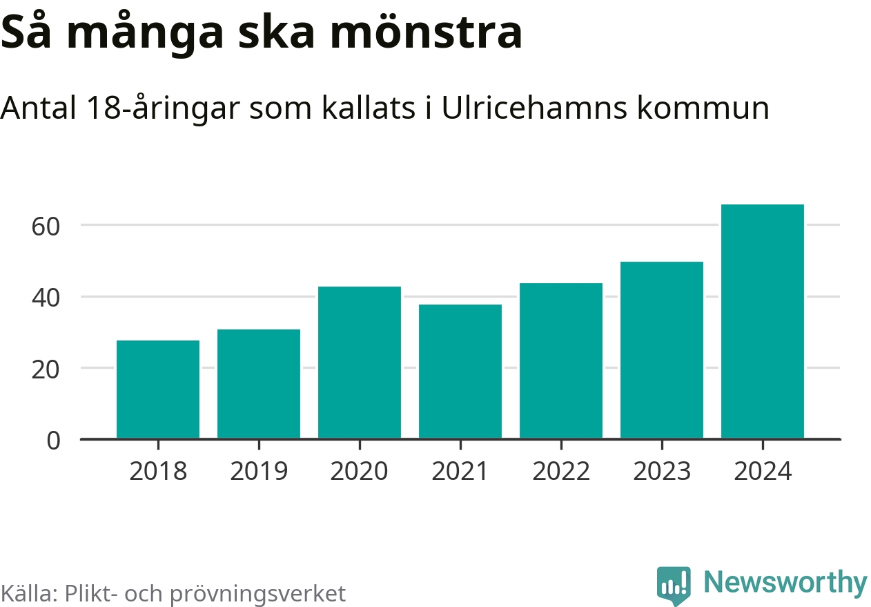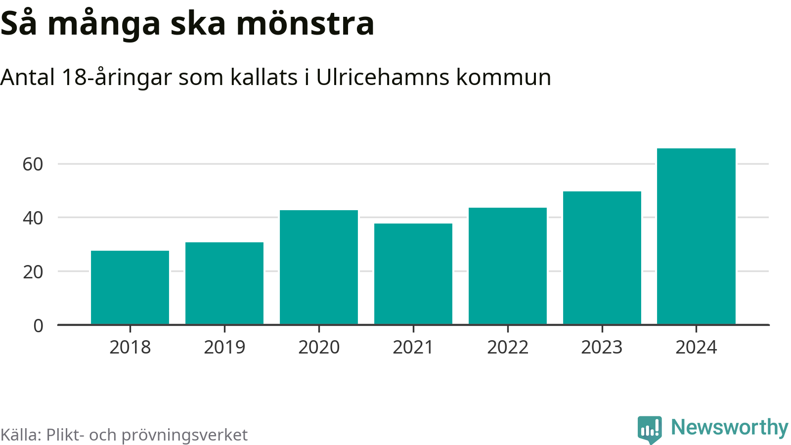 66 personer är det högsta antalet kallade i Ulricehamn sedan 2018, som är första året med statistik på kommunnivå (värnplikten återinfördes 2017), och 16 mönstrande mer än 2023. 2018 kallades som jämförelse 28 artonåringar från Ulricehamn till mönstring. Det motsvarade ungefär 10 procent av årskullen född år 2000. Totalt från Västra Götalands län kallas 4 562 personer födda 2006 i år.