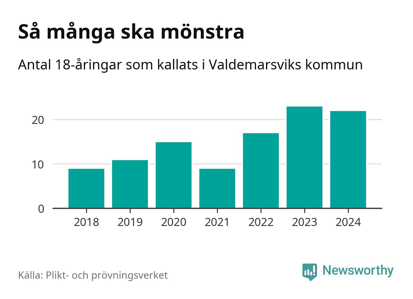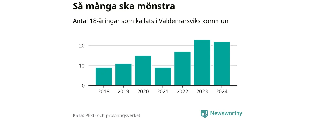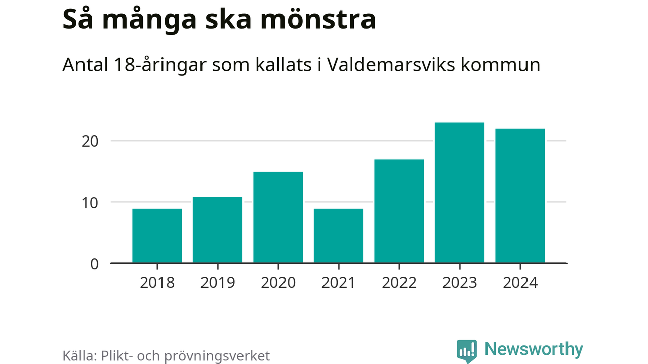 Nu kallas 27 900 svenskar födda 2006 till mönstring. Och 22 av dem kommer från Valdemarsvik, enligt ny statistik från Plikt- och prövningsverket. Det innebär att nästan var tredje invånare i åldersgruppen i kommunen kallas till mönstring. Det är en högre andel än i Östergötland totalt. I riket som helhet kallas nästan var fjärde person i årskullen.