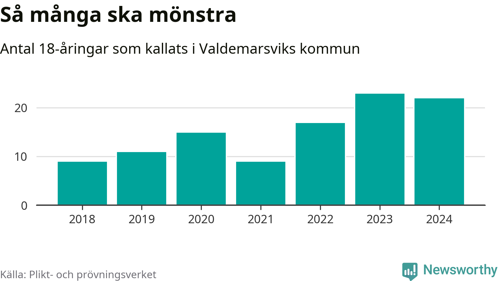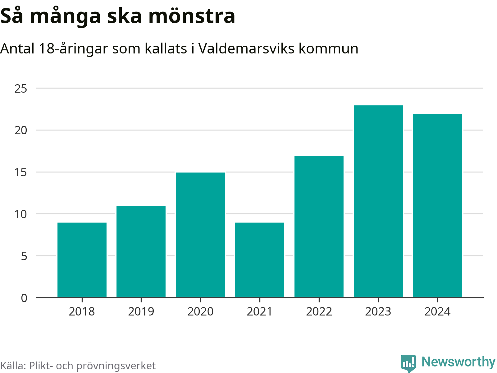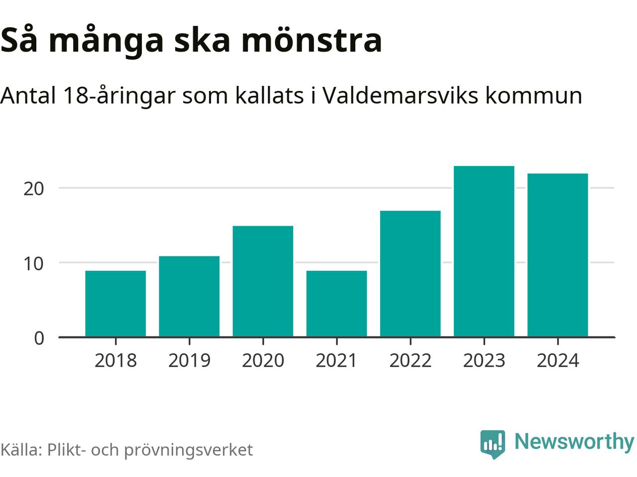 Nu kallas 27 900 svenskar födda 2006 till mönstring. Och 22 av dem kommer från Valdemarsvik, enligt ny statistik från Plikt- och prövningsverket. Det innebär att nästan var tredje invånare i åldersgruppen i kommunen kallas till mönstring. Det är en högre andel än i Östergötland totalt. I riket som helhet kallas nästan var fjärde person i årskullen.