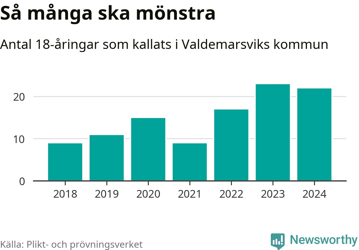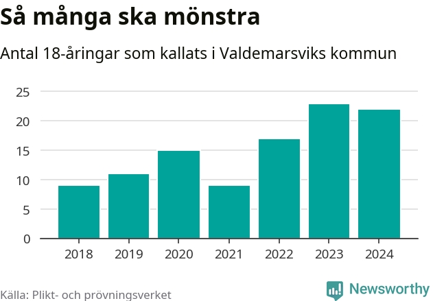 22 personer är en färre än 2023, men satt i relation till åldersgruppens storlek är det faktiskt en större andel som kallas i år. 2018 kallades som jämförelse nio 18-åringar från Valdemarsvik till mönstring. Det motsvarade ungefär 11 procent av årskullen född år 2000. Totalt från Östergötlands län kallas 1 251 personer födda 2006 i år.