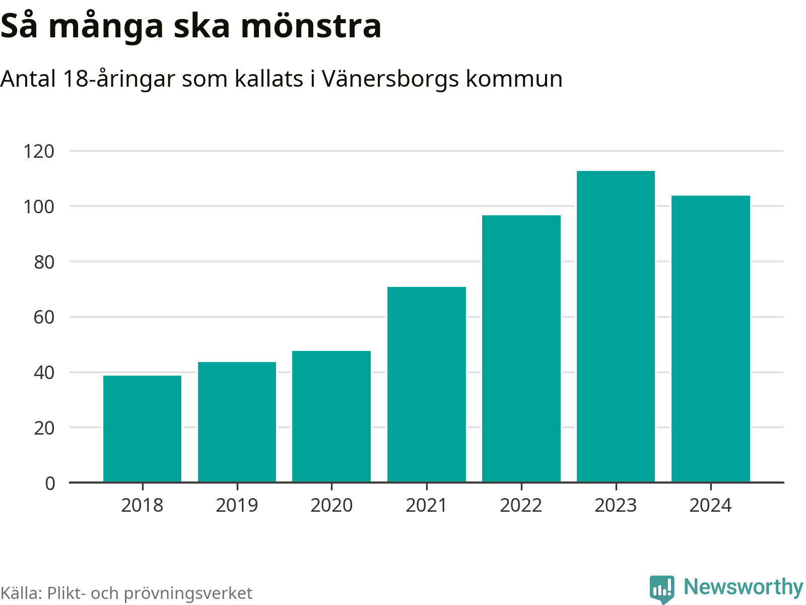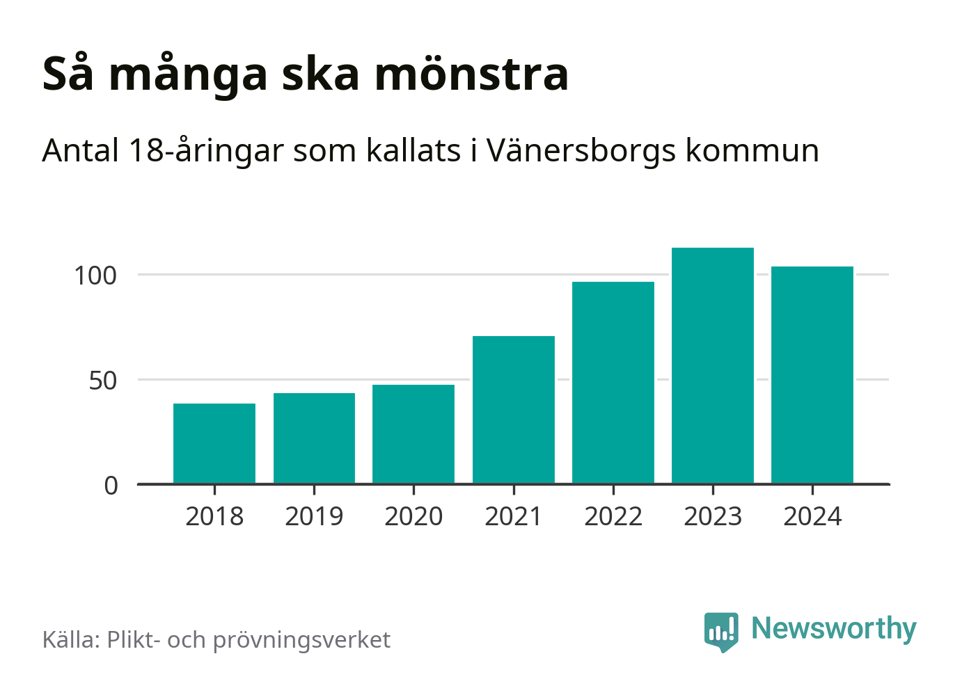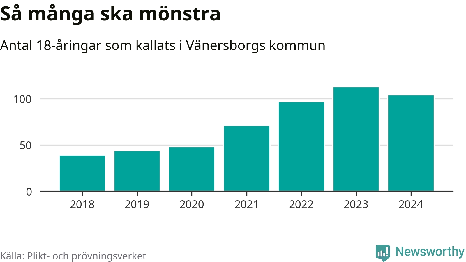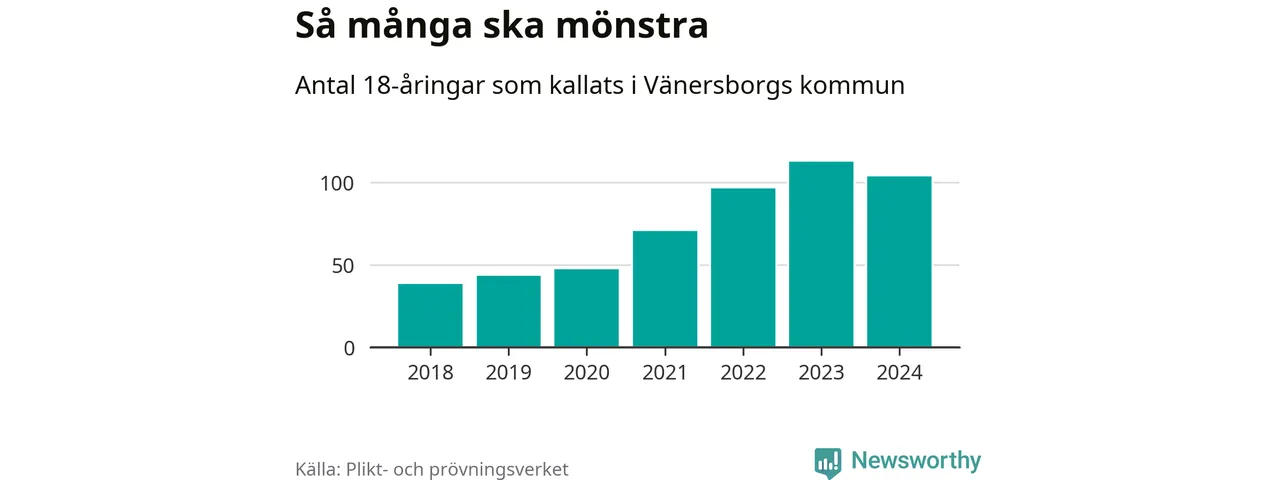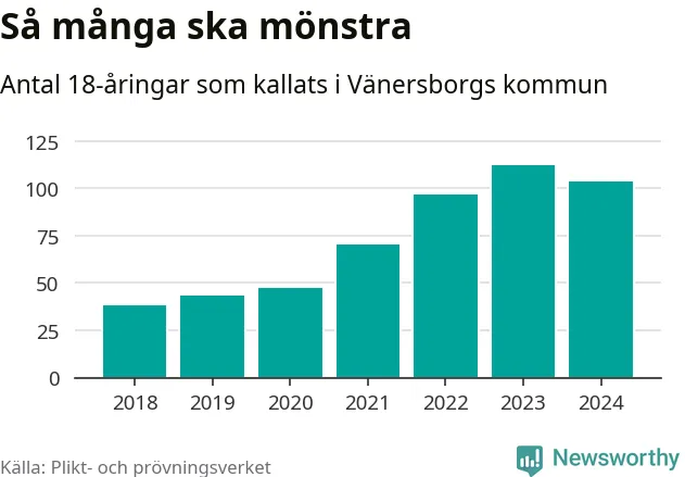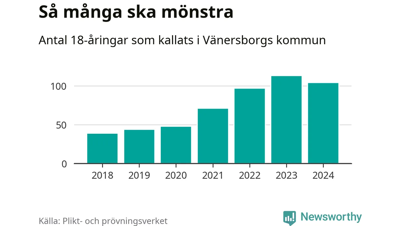 104 personer är nio färre än 2023, men sett som andel av respektive åldersgrupp är skillnaden liten. 2018 kallades som jämförelse 39 artonåringar från Vänersborg till mönstring. Det motsvarade ungefär 9 procent av årskullen född år 2000. Totalt från Västra Götalands län kallas 4 562 personer födda 2006 i år.