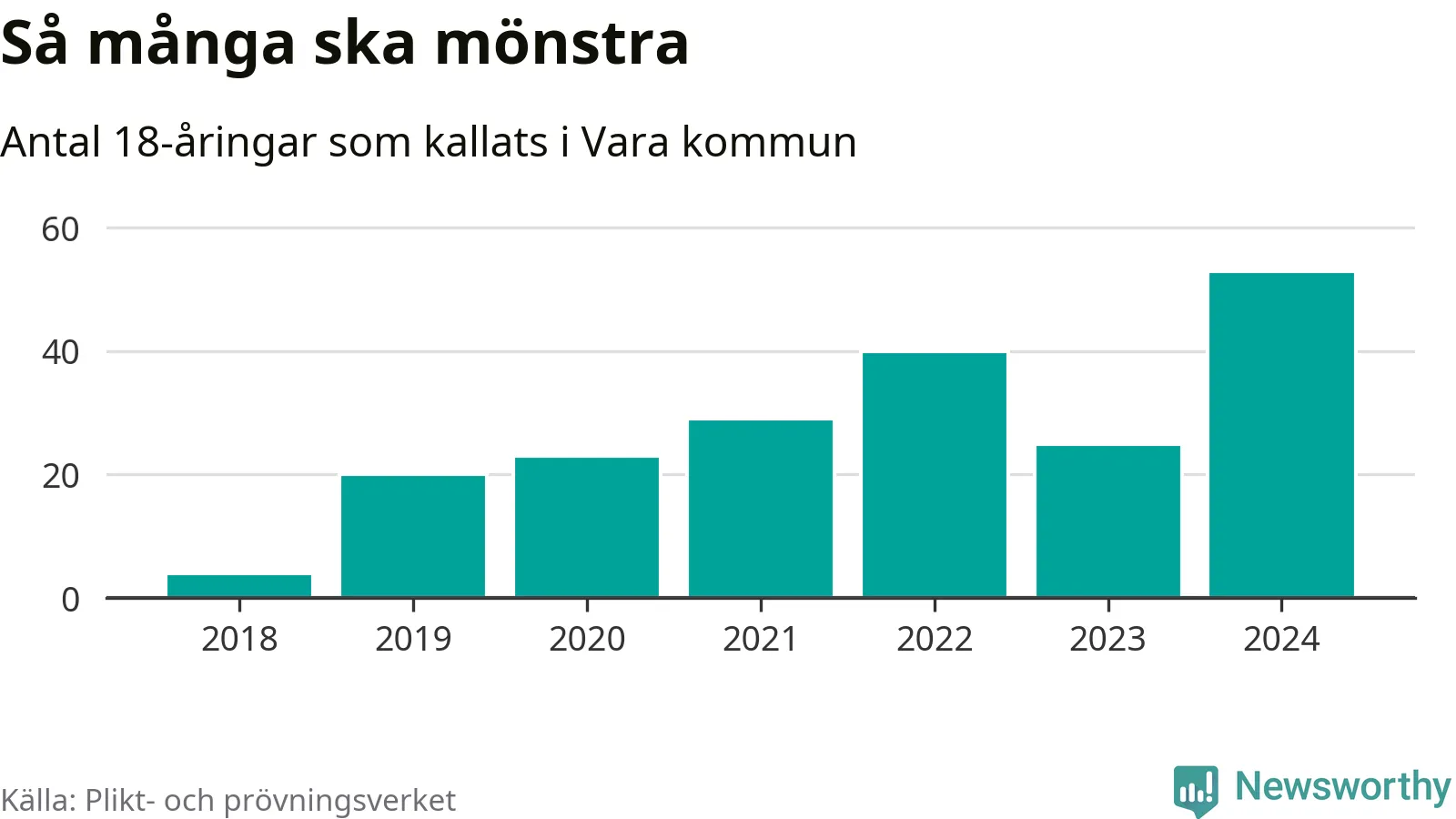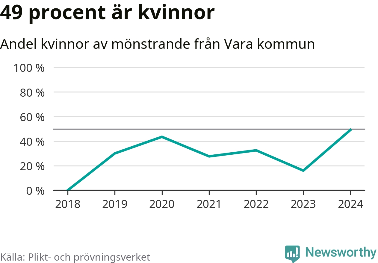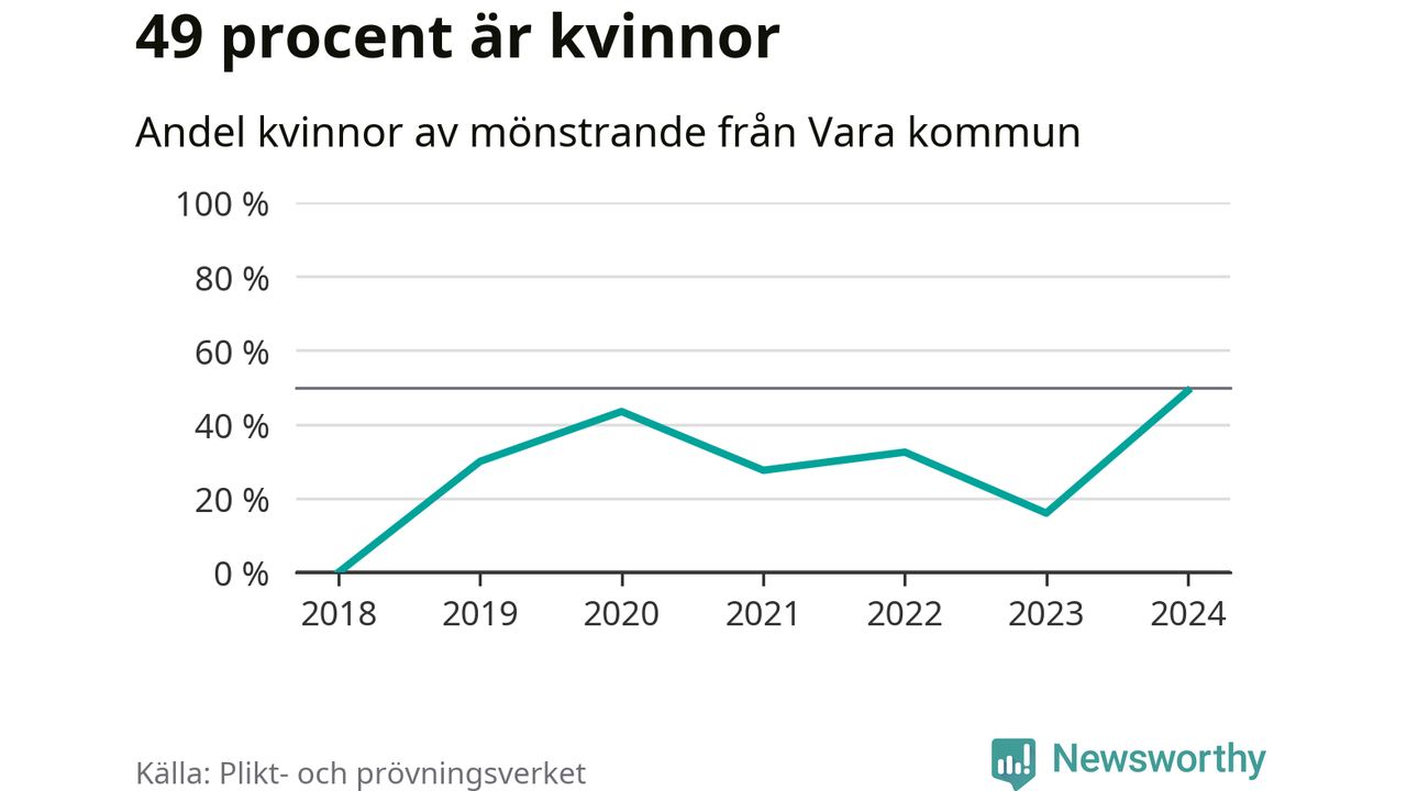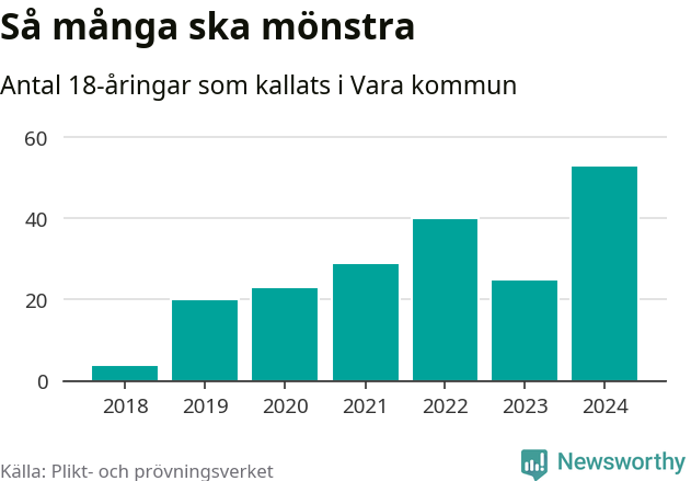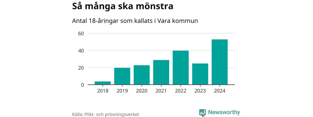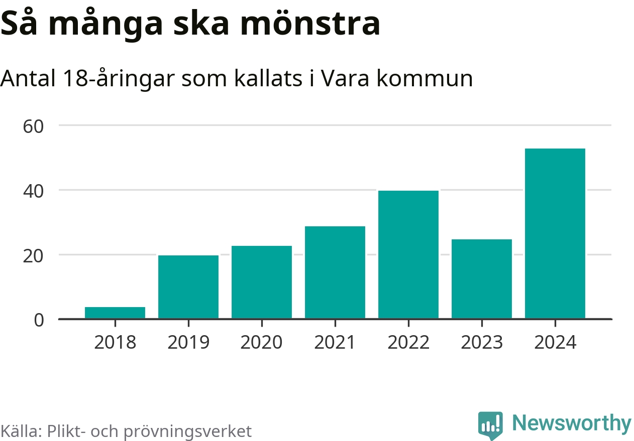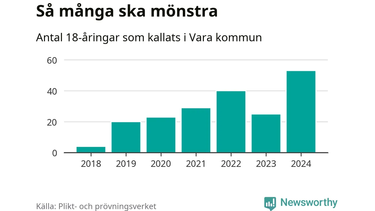 53 personer är det högsta antalet kallade i Vara sedan 2018, som är första året med statistik på kommunnivå (värnplikten återinfördes 2017), och 28 mönstrande mer än 2023. 2018 kallades som jämförelse fyra 18-åringar från Vara till mönstring. Det motsvarade ungefär 3 procent av årskullen född år 2000. Totalt från Västra Götalands län kallas 4 562 personer födda 2006 i år.
