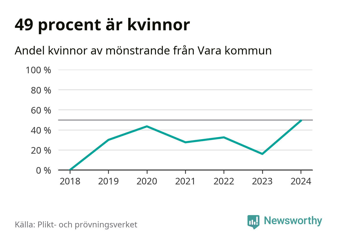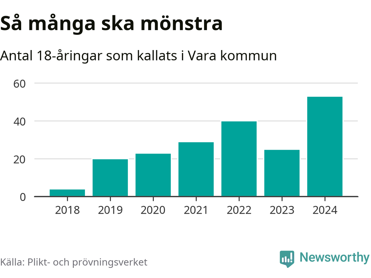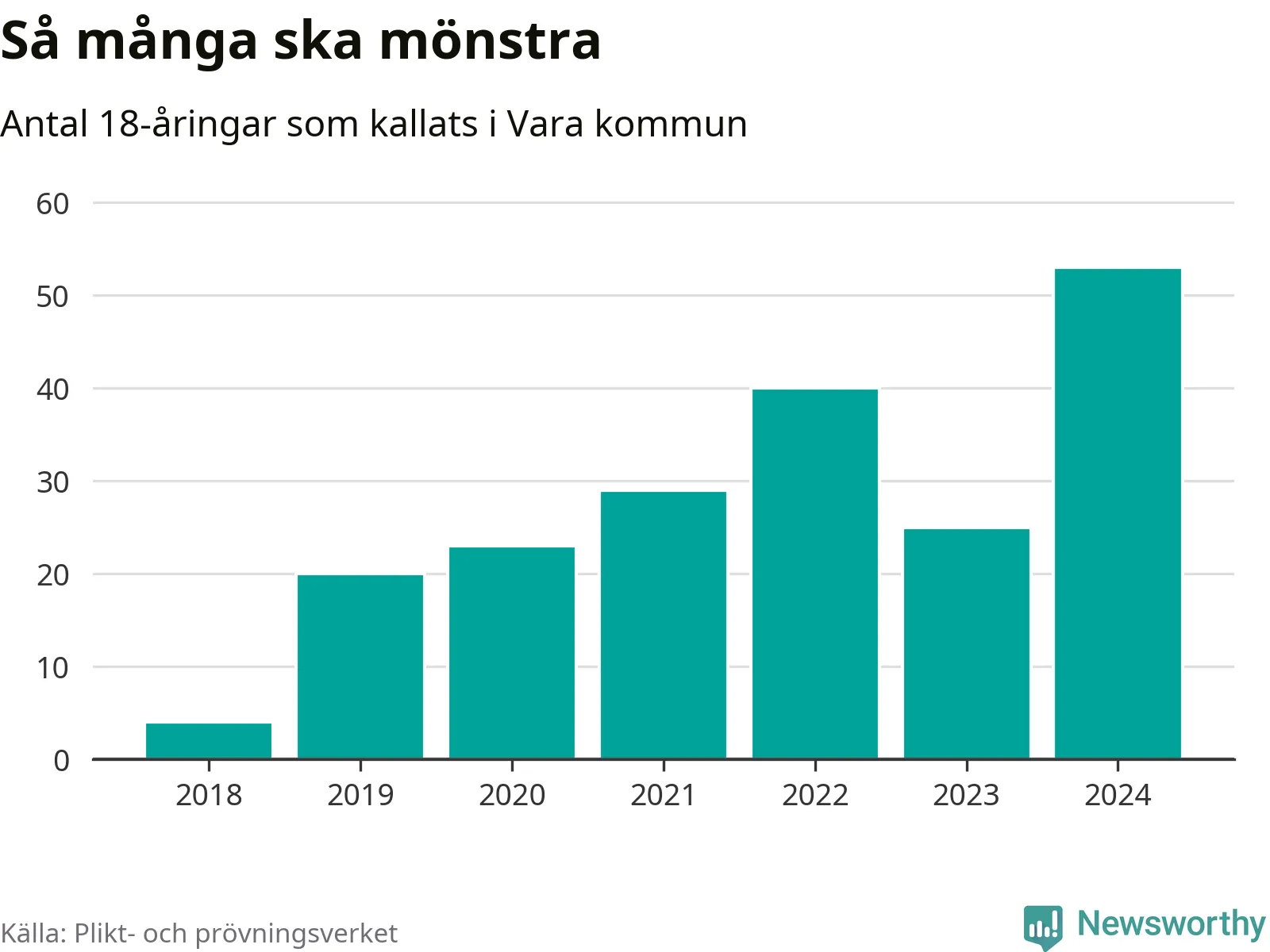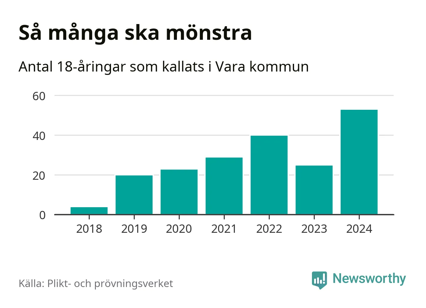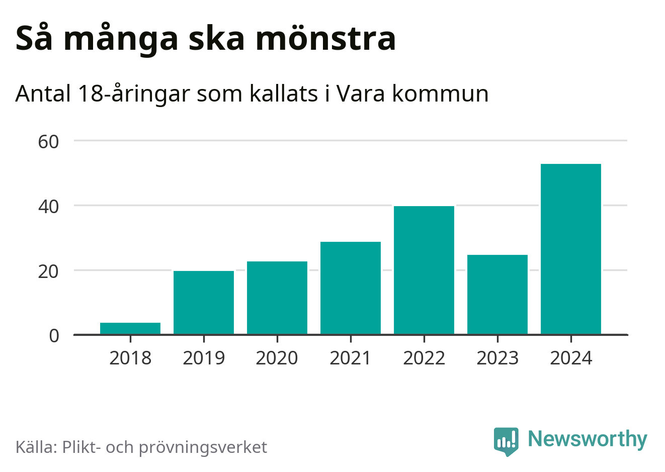 53 personer är det högsta antalet kallade i Vara sedan 2018, som är första året med statistik på kommunnivå (värnplikten återinfördes 2017), och 28 mönstrande mer än 2023. 2018 kallades som jämförelse fyra 18-åringar från Vara till mönstring. Det motsvarade ungefär 3 procent av årskullen född år 2000. Totalt från Västra Götalands län kallas 4 562 personer födda 2006 i år.