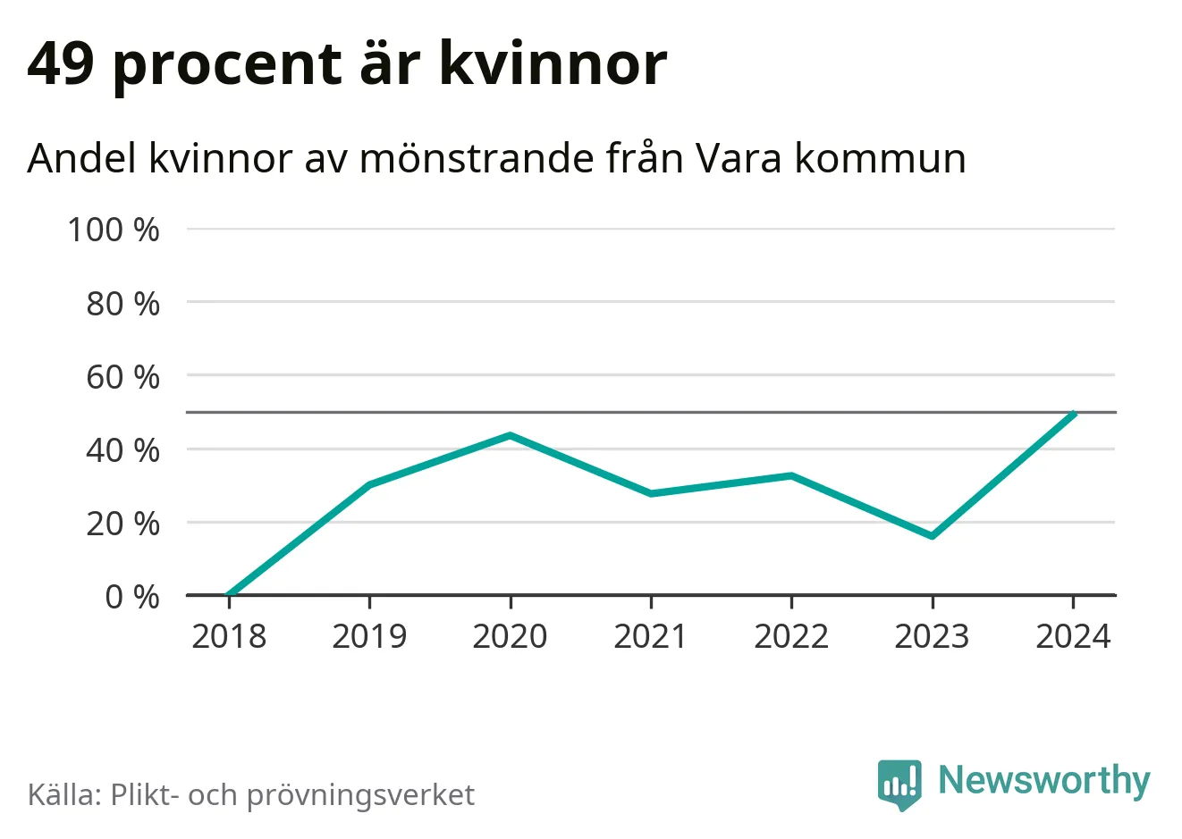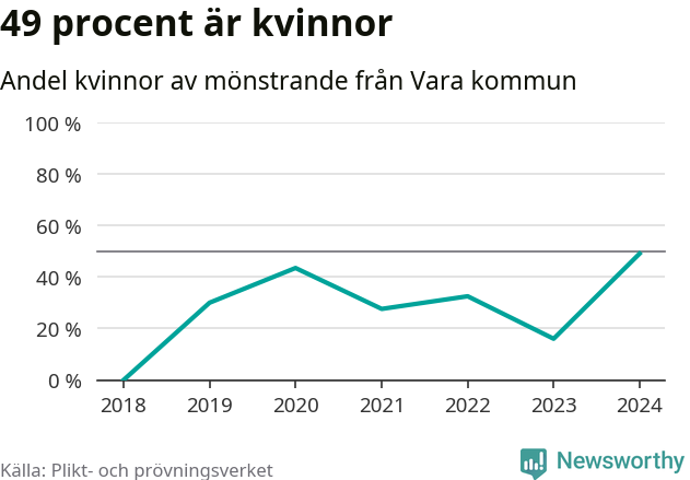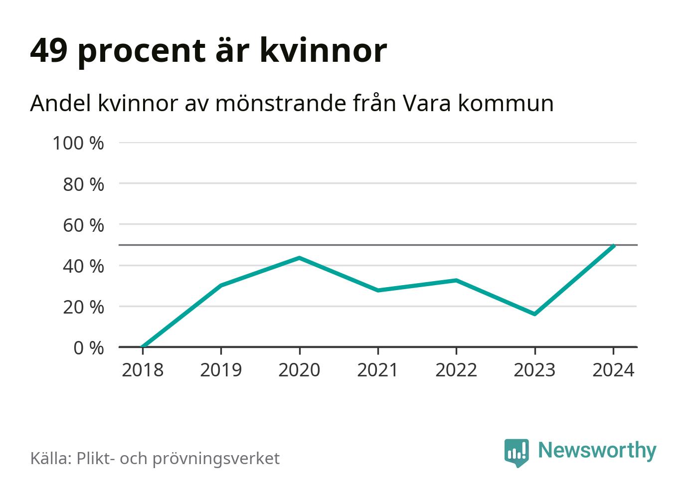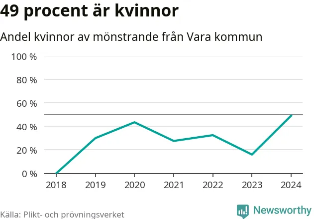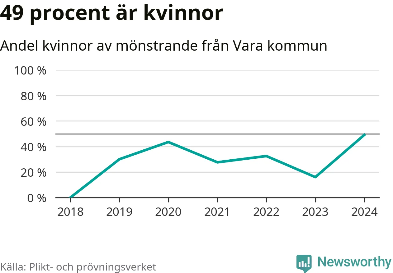 26 av de som kallats till mönstring från Vara är kvinnor, vilket motsvarar 49 procent av de mönstrande. Det är fler än något år sedan värnplikten återinfördes. I riket som helhet är 30 procent av de mönstrande tjejer.