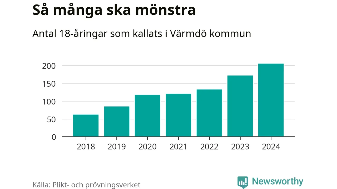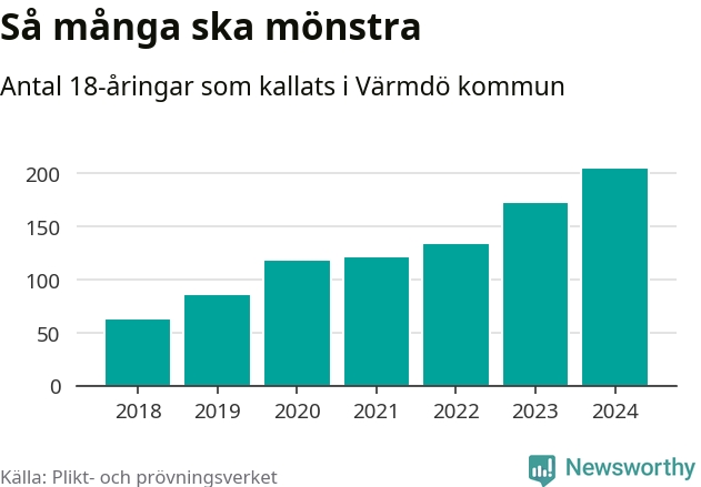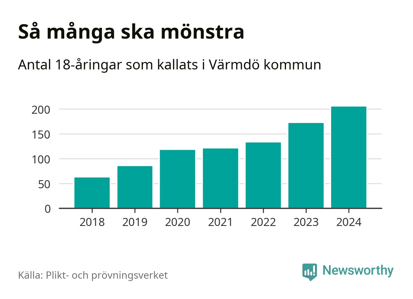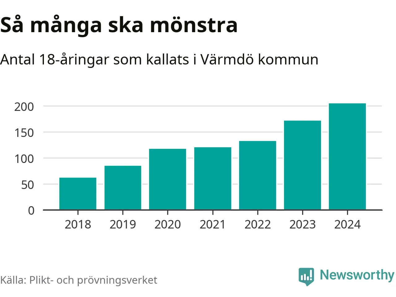 Antalet kallade i Värmdö har ökat varje år sedan 2018, som är första året med statistik på kommunnivå (värnplikten återinfördes 2017), och jämfört med 2023 är det 33 fler i år. 2018 kallades som jämförelse 63 artonåringar från Värmdö till mönstring. Det motsvarade ungefär 12 procent av årskullen född år 2000. Totalt från Stockholms län kallas 6 488 personer födda 2006 i år.