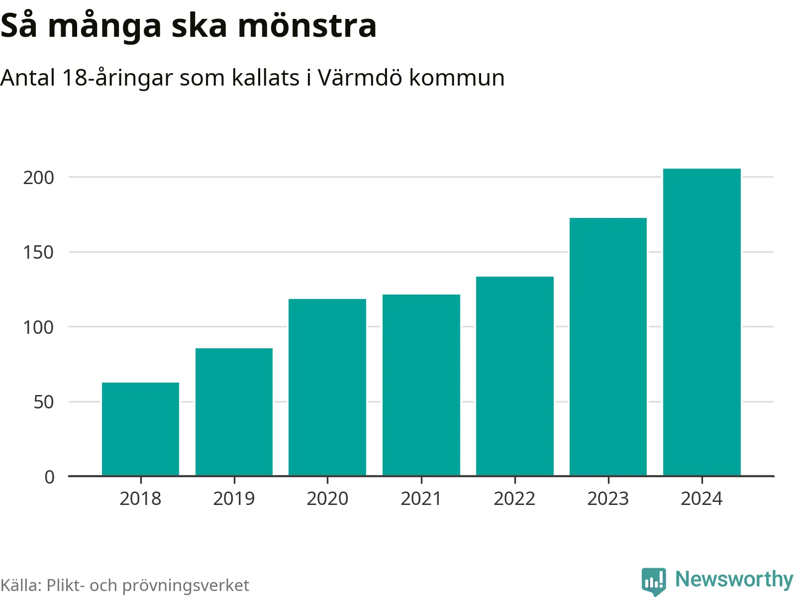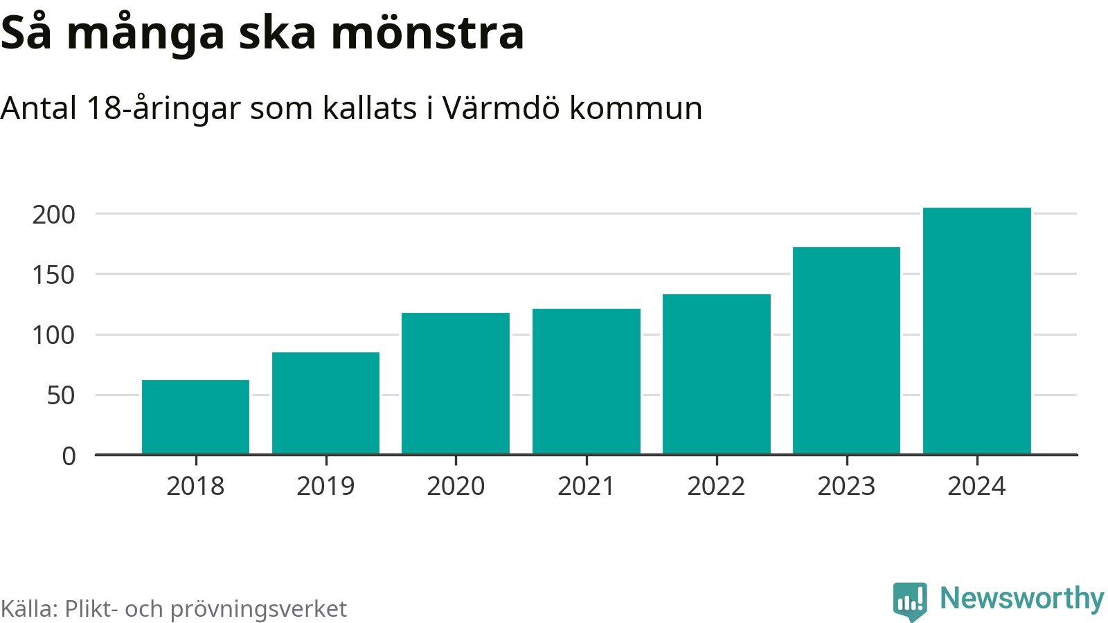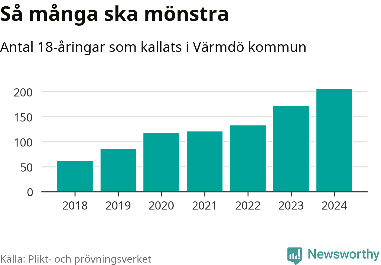 Antalet kallade i Värmdö har ökat varje år sedan 2018, som är första året med statistik på kommunnivå (värnplikten återinfördes 2017), och jämfört med 2023 är det 33 fler i år. 2018 kallades som jämförelse 63 artonåringar från Värmdö till mönstring. Det motsvarade ungefär 12 procent av årskullen född år 2000. Totalt från Stockholms län kallas 6 488 personer födda 2006 i år.