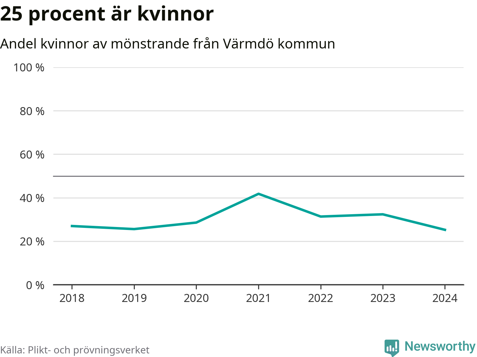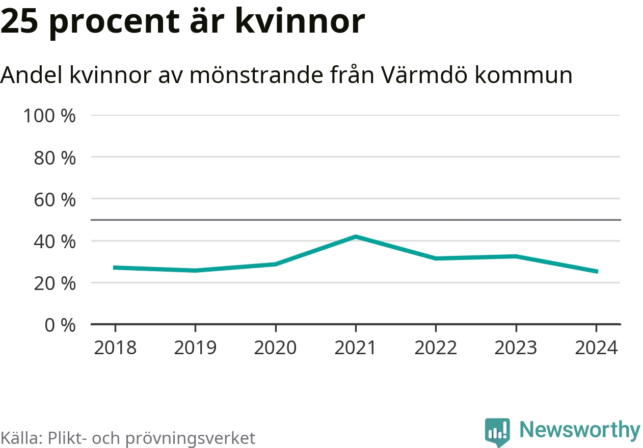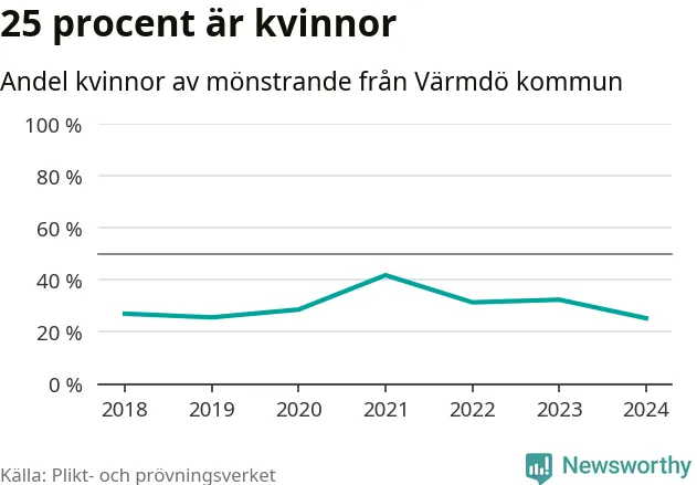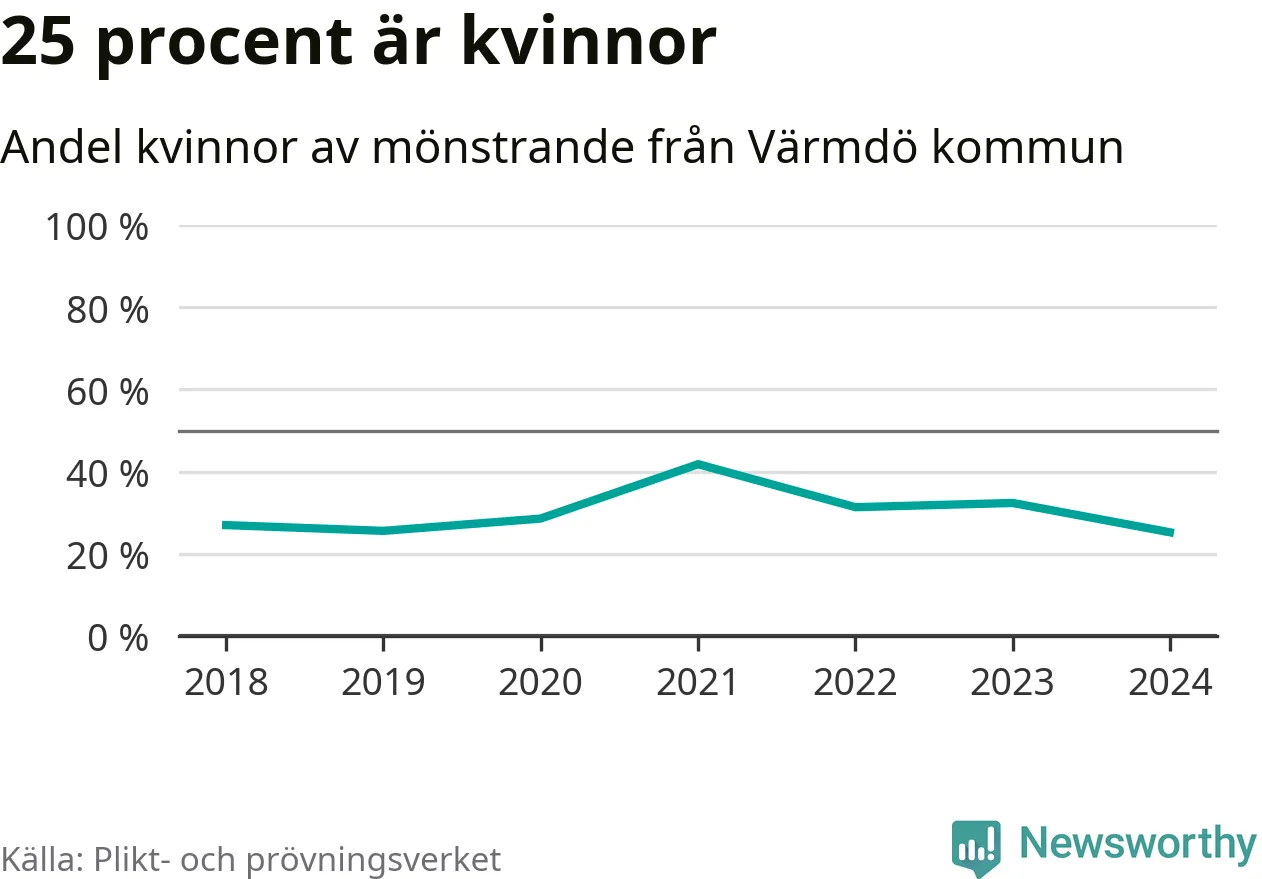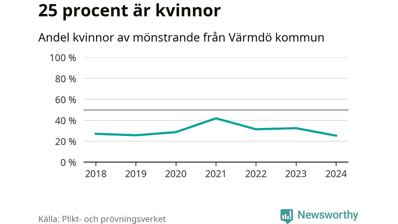 52 av de som kallats till mönstring från Värmdö är kvinnor, vilket motsvarar 25 procent av de mönstrande. Som mest har 56 kvinnor kallats från kommunen (2023). I riket som helhet är 30 procent av de mönstrande tjejer.