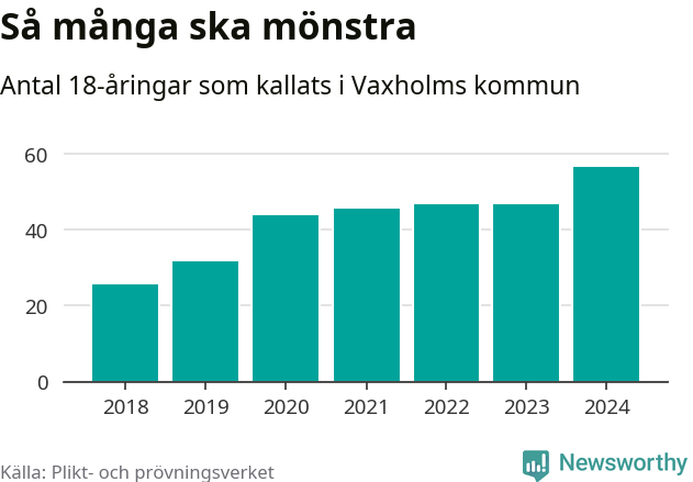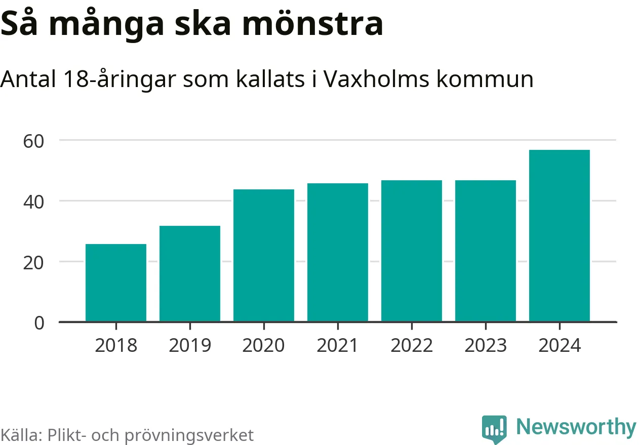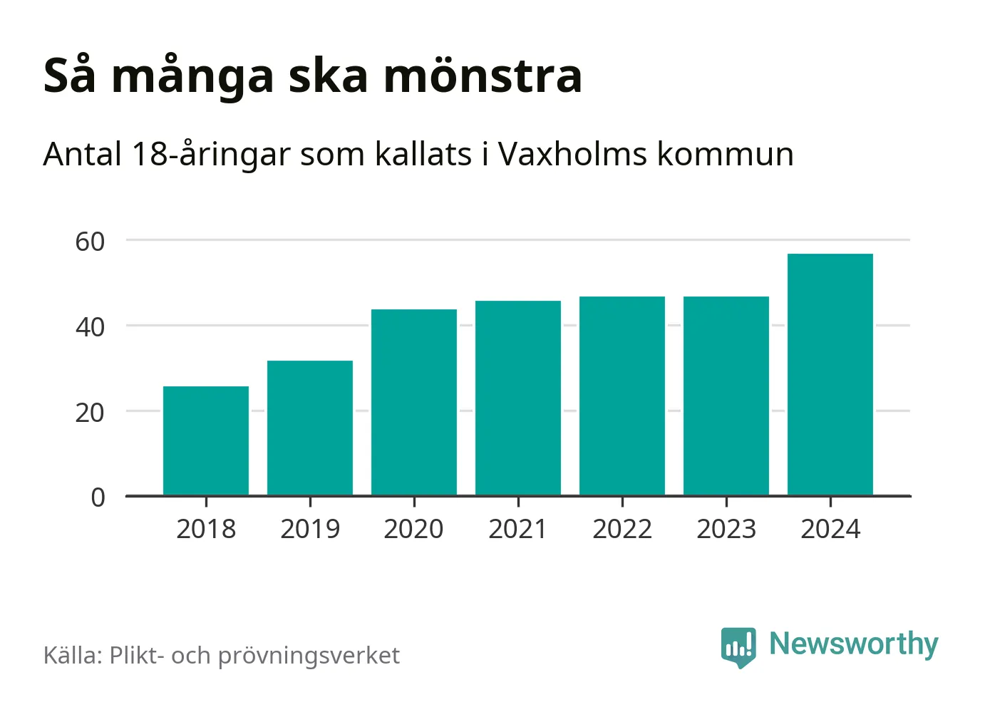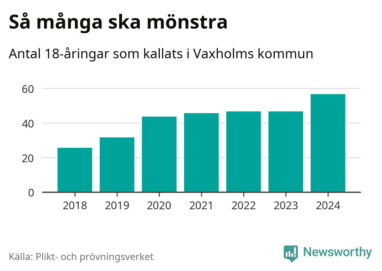 57 personer är det högsta antalet kallade i Vaxholm sedan 2018, som är första året med statistik på kommunnivå (värnplikten återinfördes 2017), och tio mönstrande mer än 2023. 2018 kallades som jämförelse 26 artonåringar från Vaxholm till mönstring. Det motsvarade ungefär 15 procent av årskullen född år 2000. Totalt från Stockholms län kallas 6 488 personer födda 2006 i år.