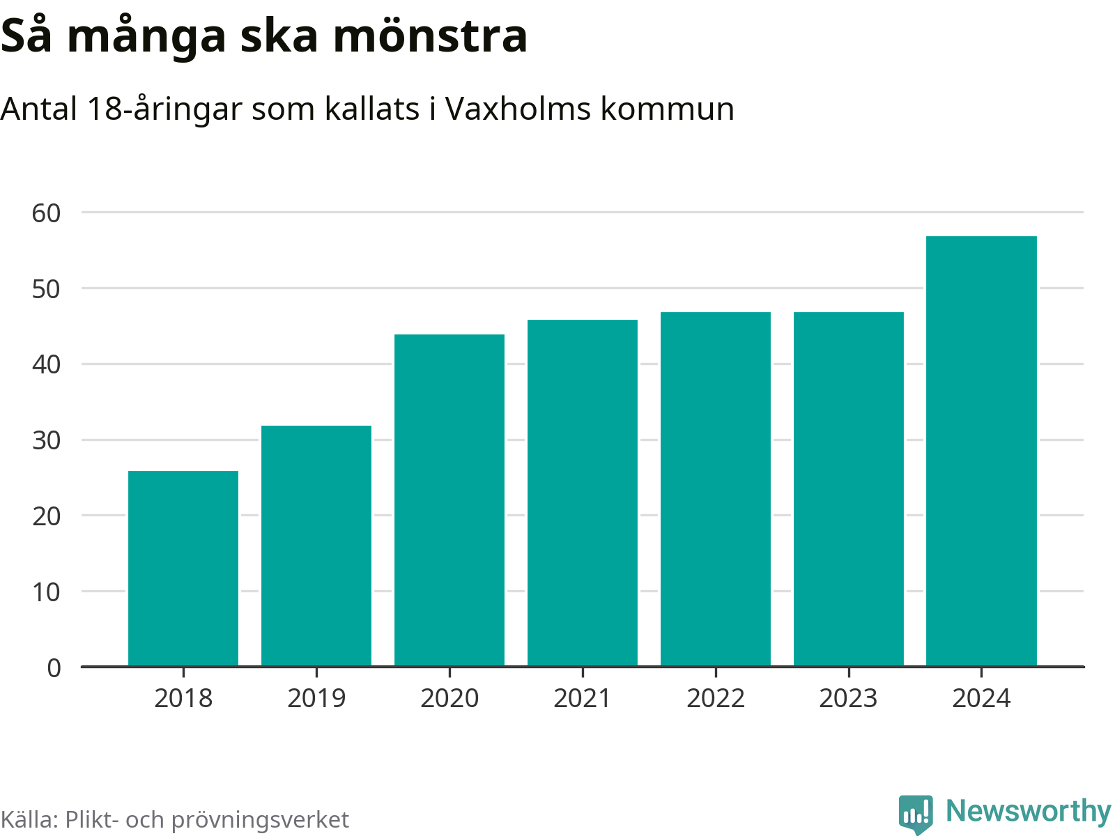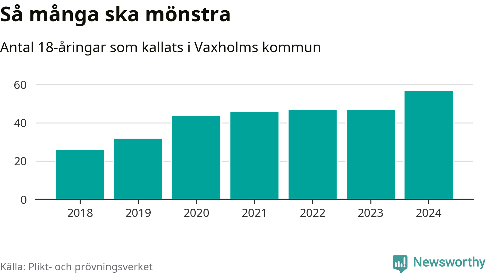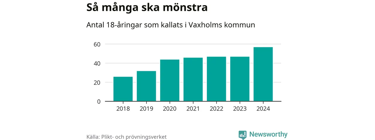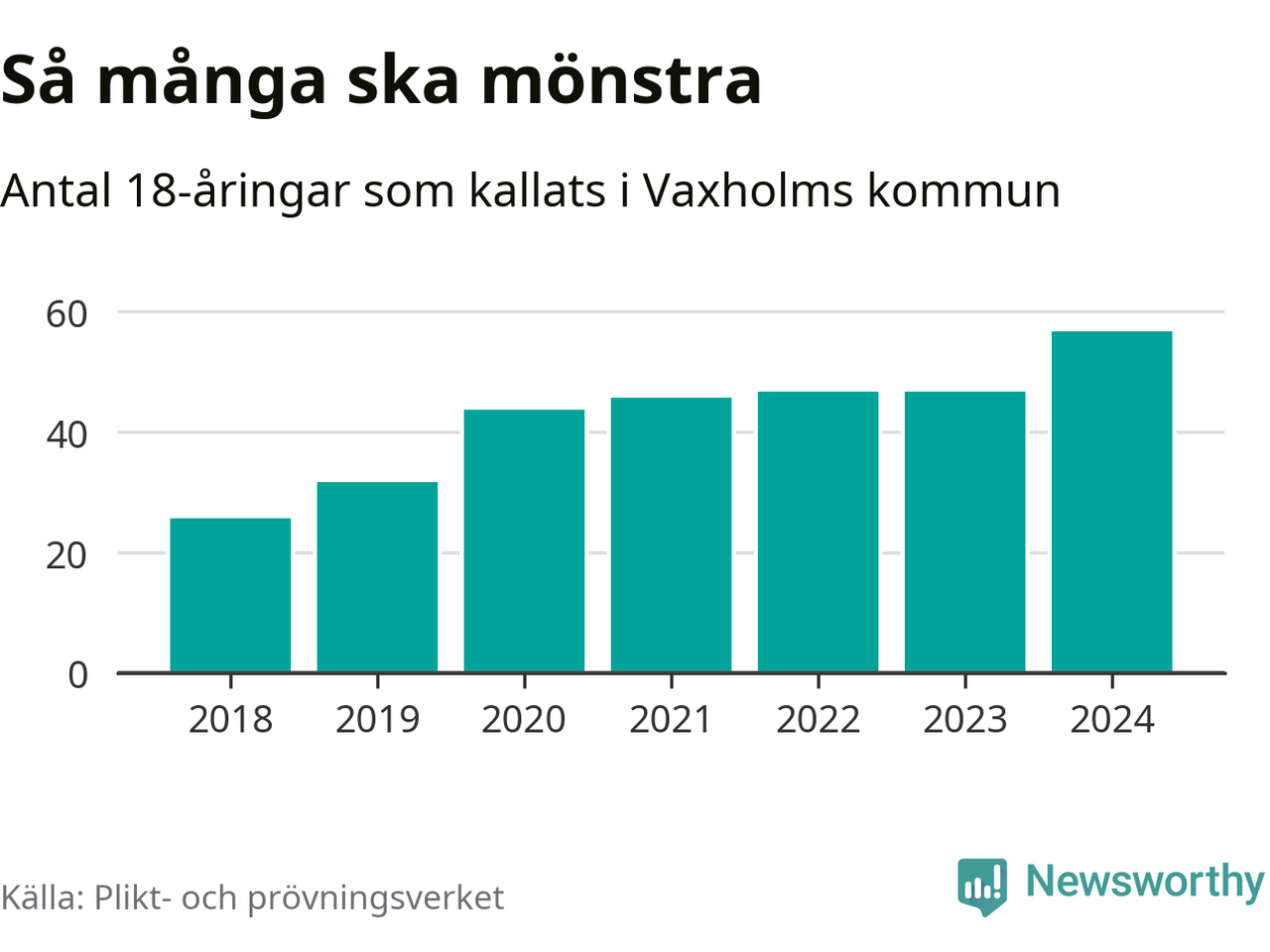 57 personer är det högsta antalet kallade i Vaxholm sedan 2018, som är första året med statistik på kommunnivå (värnplikten återinfördes 2017), och tio mönstrande mer än 2023. 2018 kallades som jämförelse 26 artonåringar från Vaxholm till mönstring. Det motsvarade ungefär 15 procent av årskullen född år 2000. Totalt från Stockholms län kallas 6 488 personer födda 2006 i år.