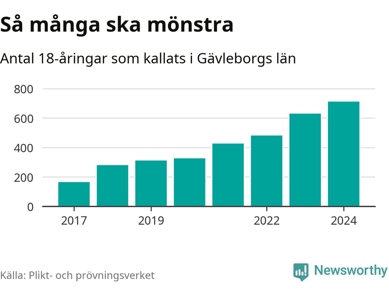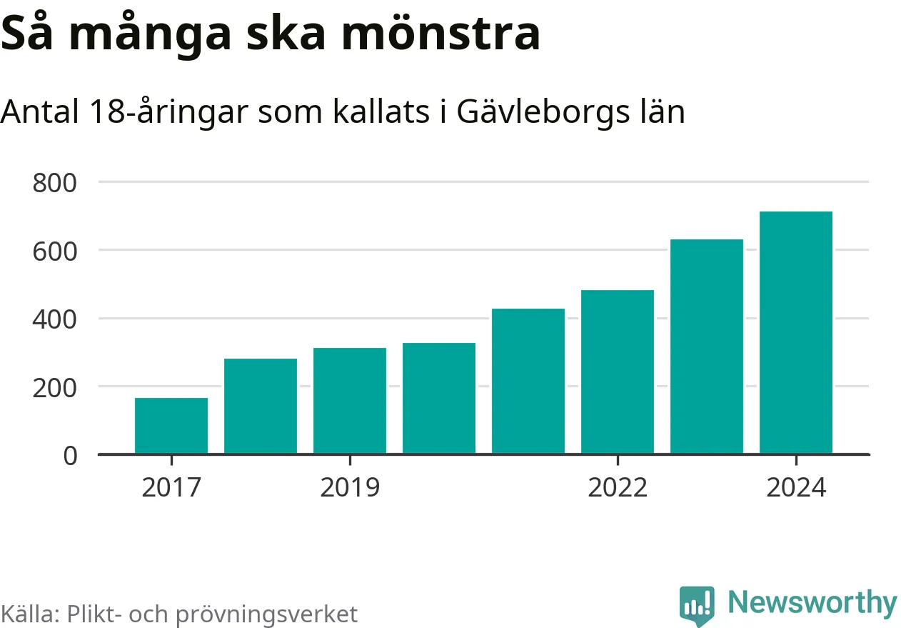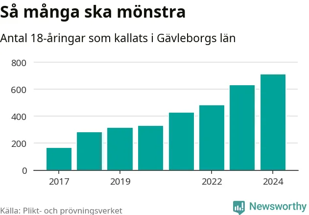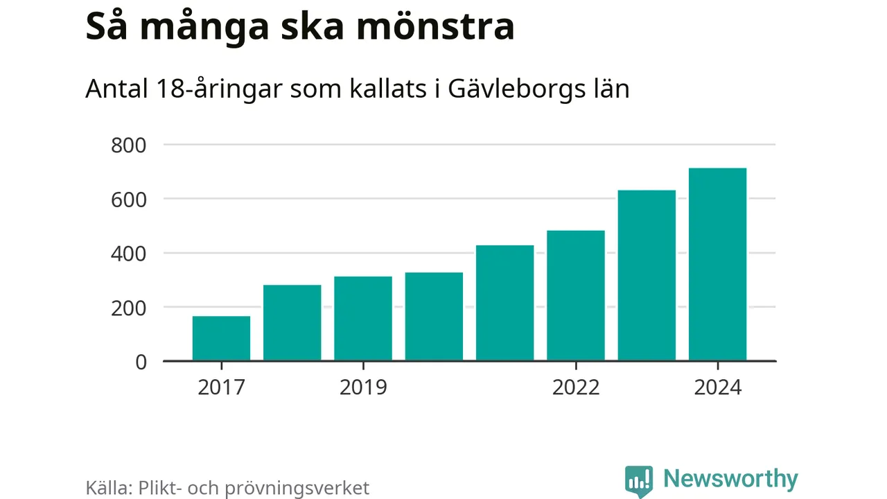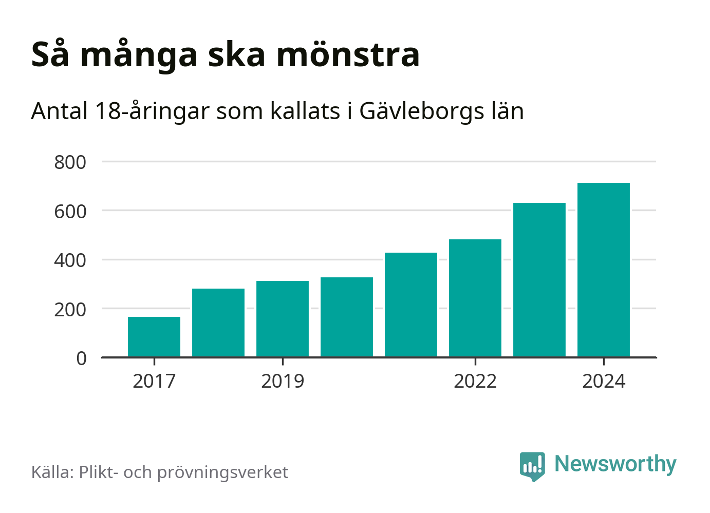 Antalet kallade i Gävleborg har ökat varje år sedan värnplikten infördes 2017 och jämfört med 2023 är det 82 fler i år. 2017 kallades som jämförelse 169 artonåringar från Gävleborg till mönstring. Det motsvarade ungefär 6 procent av årskullen född år 1999.