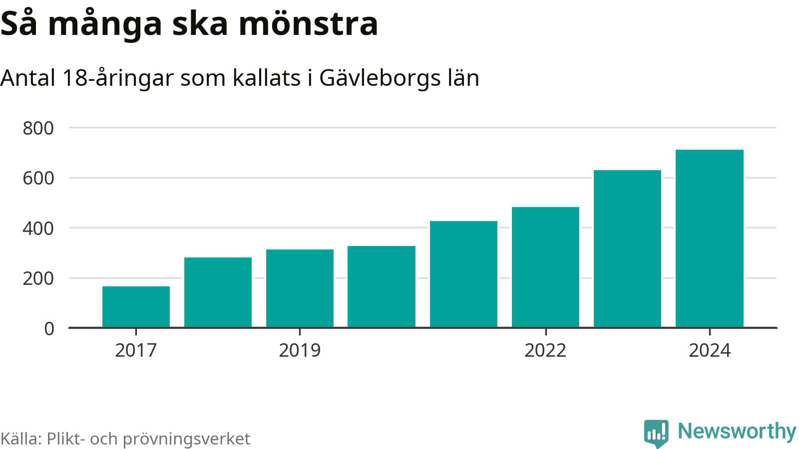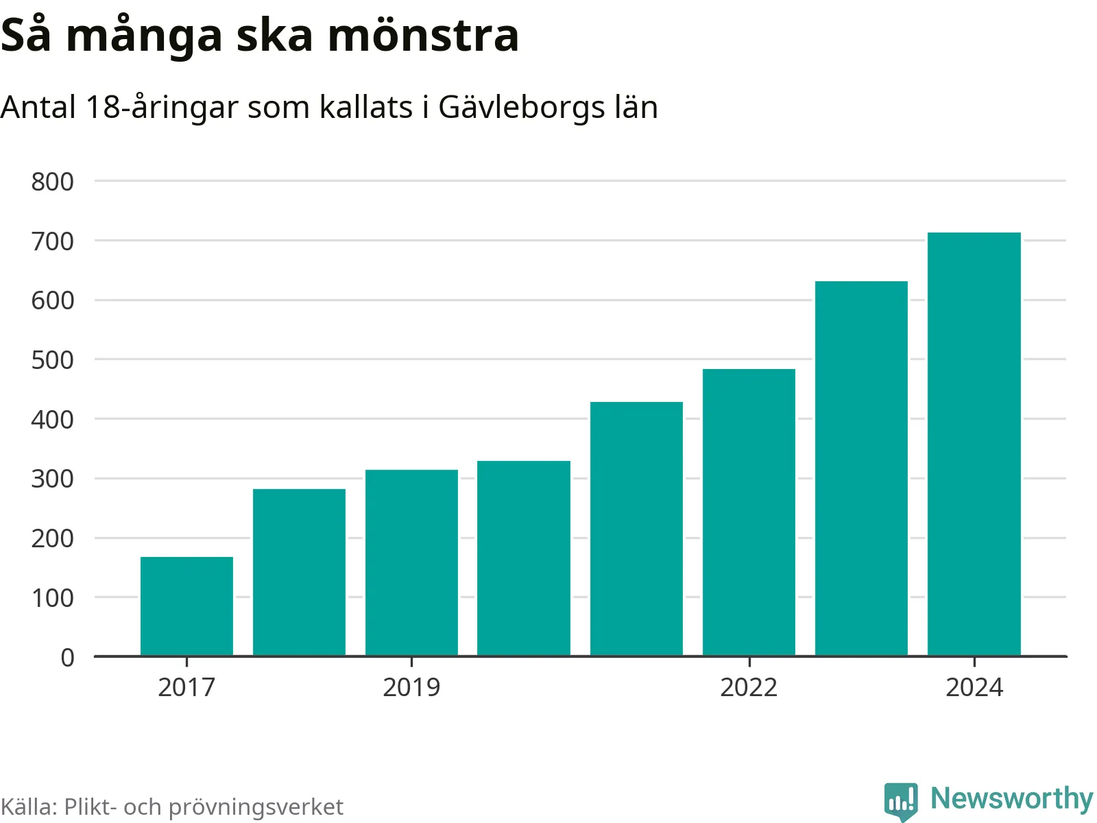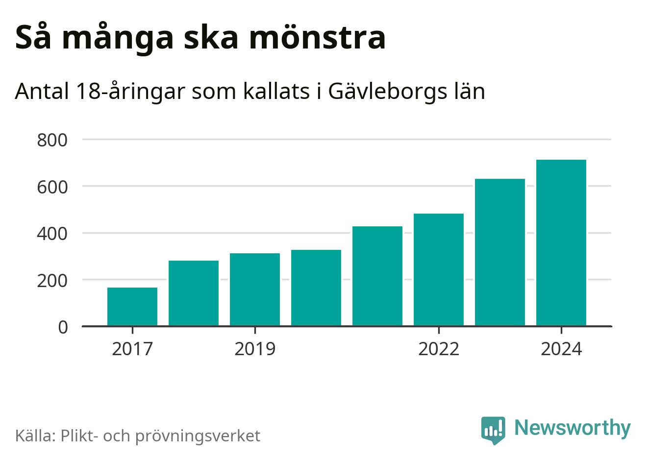 Antalet kallade i Gävleborg har ökat varje år sedan värnplikten infördes 2017 och jämfört med 2023 är det 82 fler i år. 2017 kallades som jämförelse 169 artonåringar från Gävleborg till mönstring. Det motsvarade ungefär 6 procent av årskullen född år 1999.