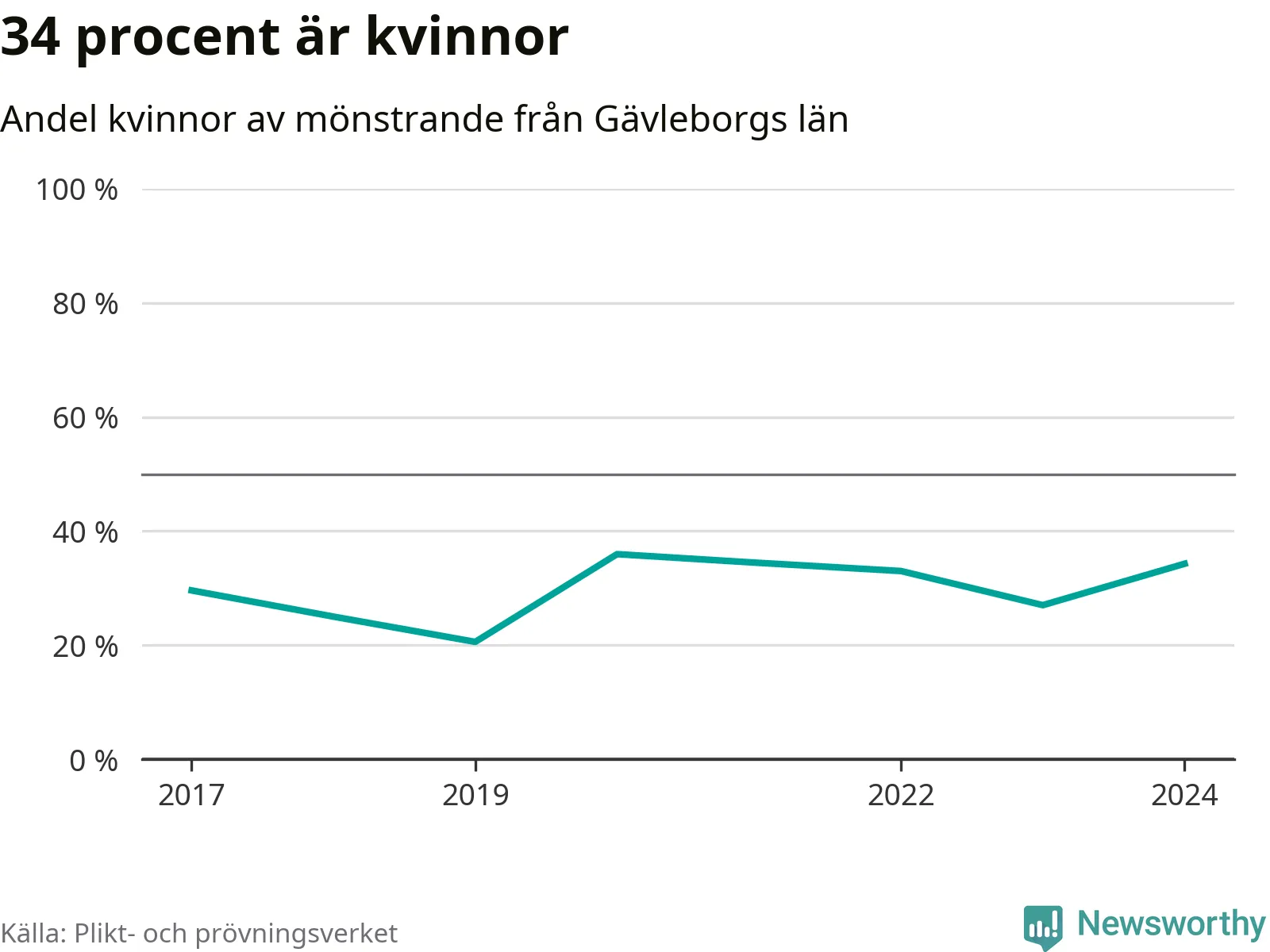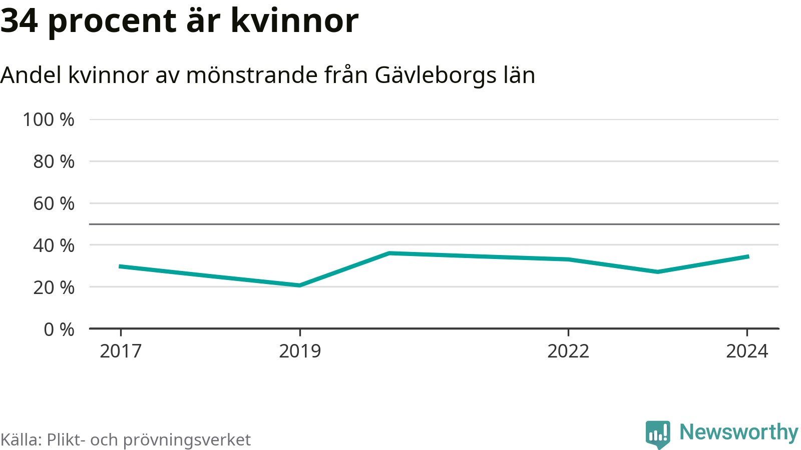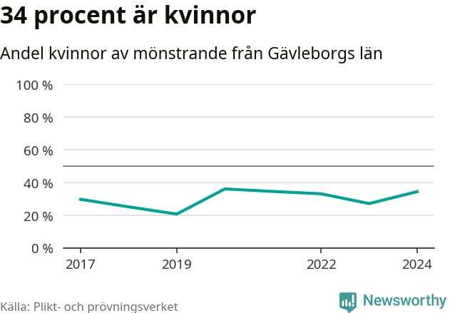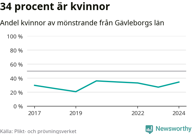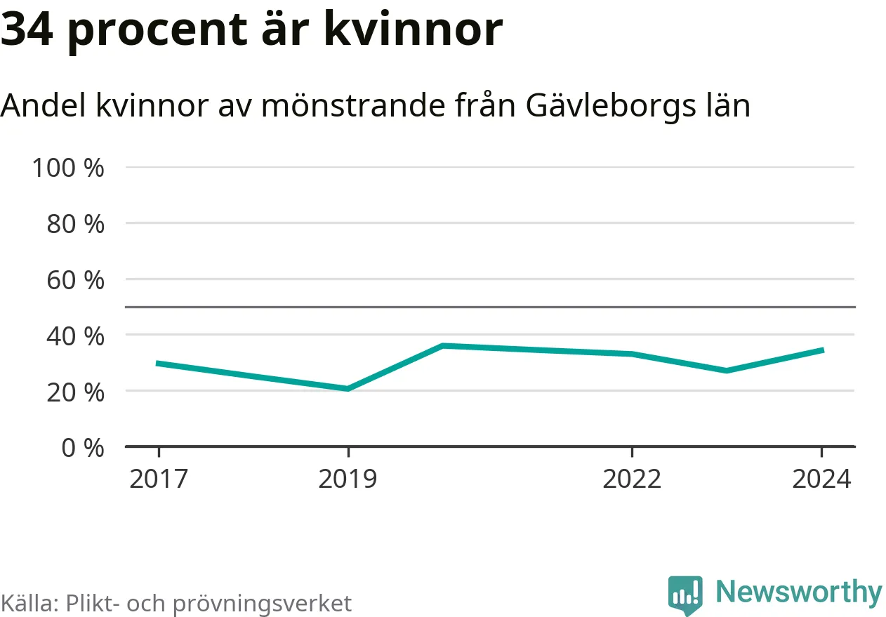 245 av de som kallats till mönstring från Gävleborg är kvinnor, vilket motsvarar 34 procent av de mönstrande. I absoluta tal är det fler kvinnor än något år sedan värnplikten återinfördes, men 2020 var en större andel av de mönstrande från länet kvinnor (36 procent). I riket som helhet är 30 procent av de mönstrande tjejer.