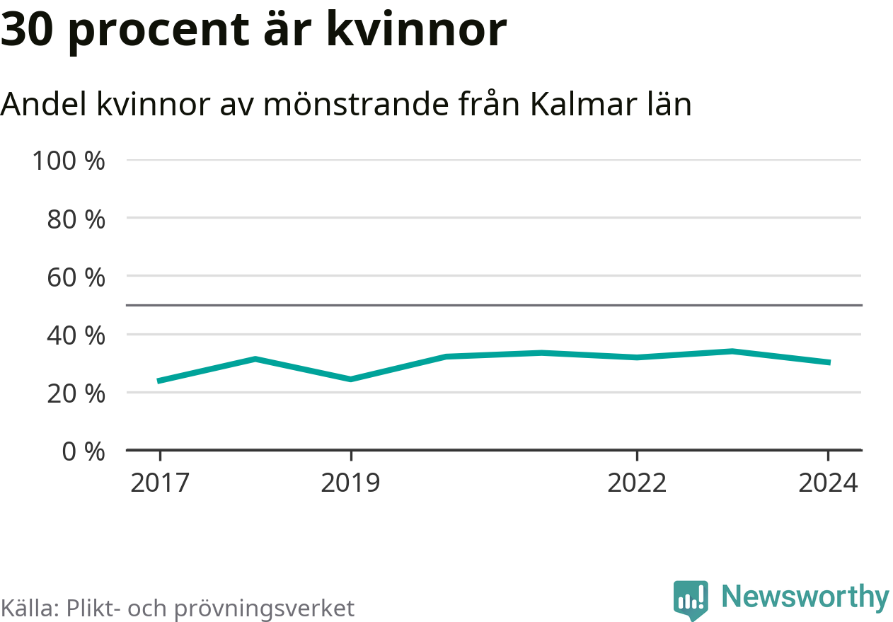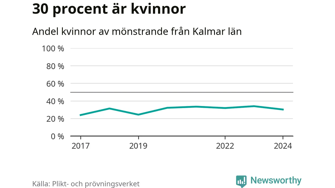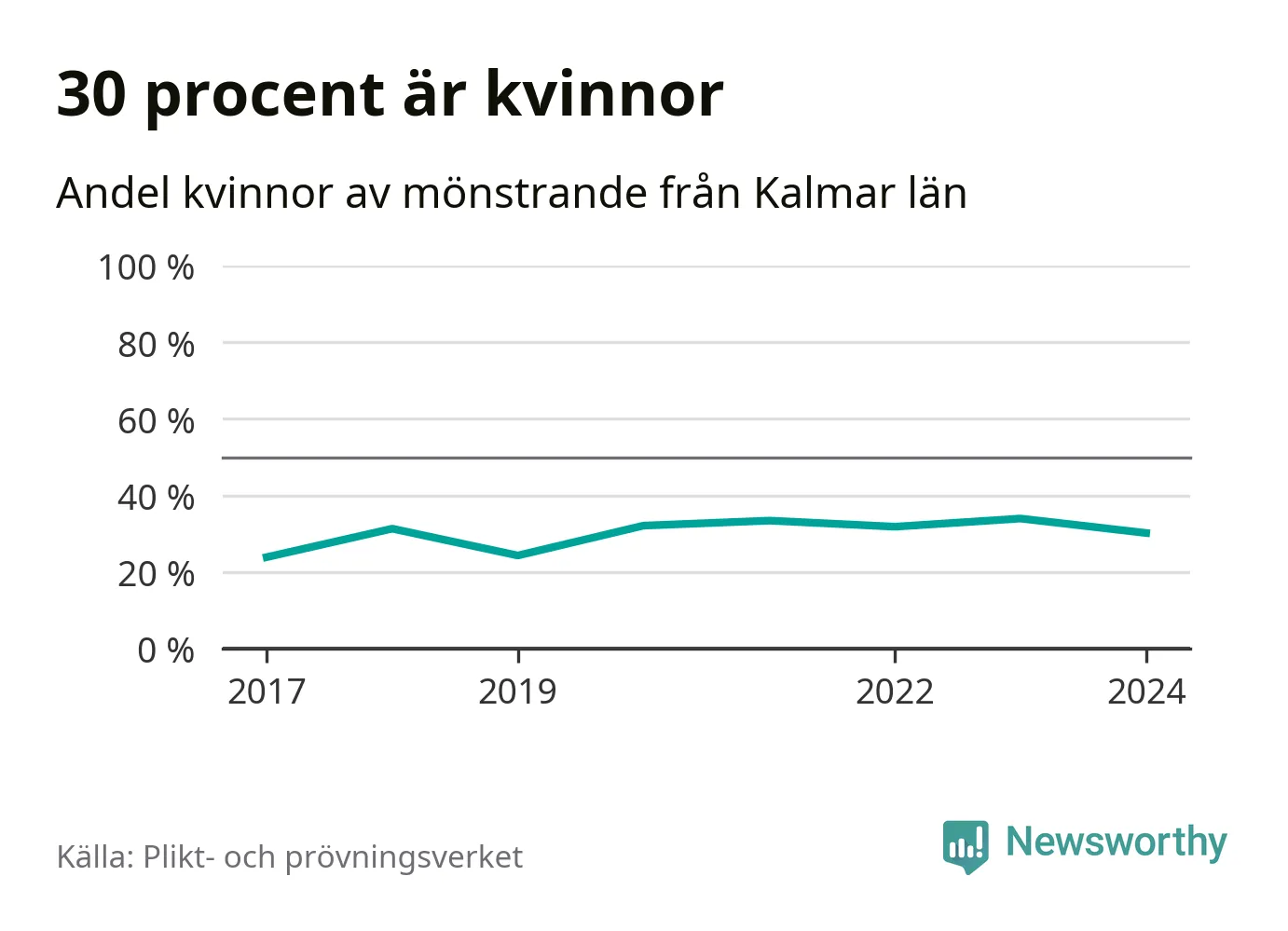 192 av de som kallats till mönstring från Kalmar län är kvinnor, vilket motsvarar 30 procent av de mönstrande. Som mest har 199 kvinnor kallats från kommunen (2023). I riket som helhet är 30 procent av de mönstrande tjejer.