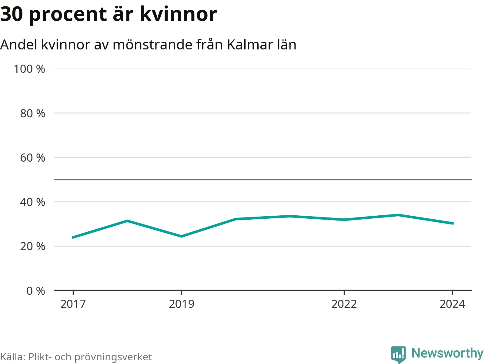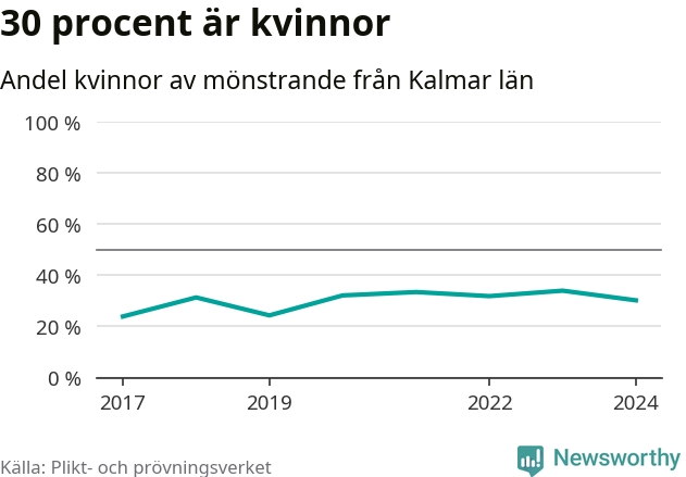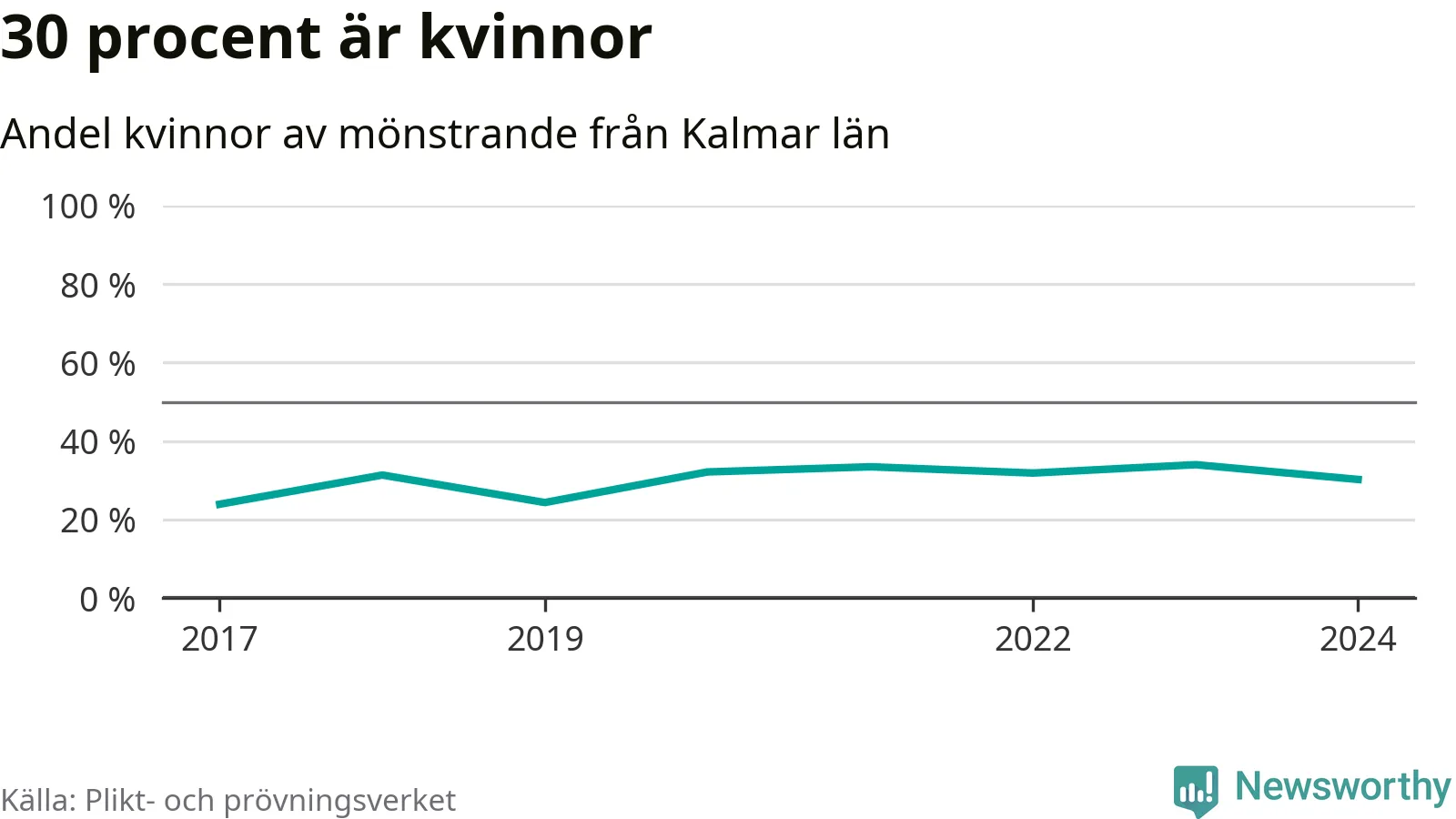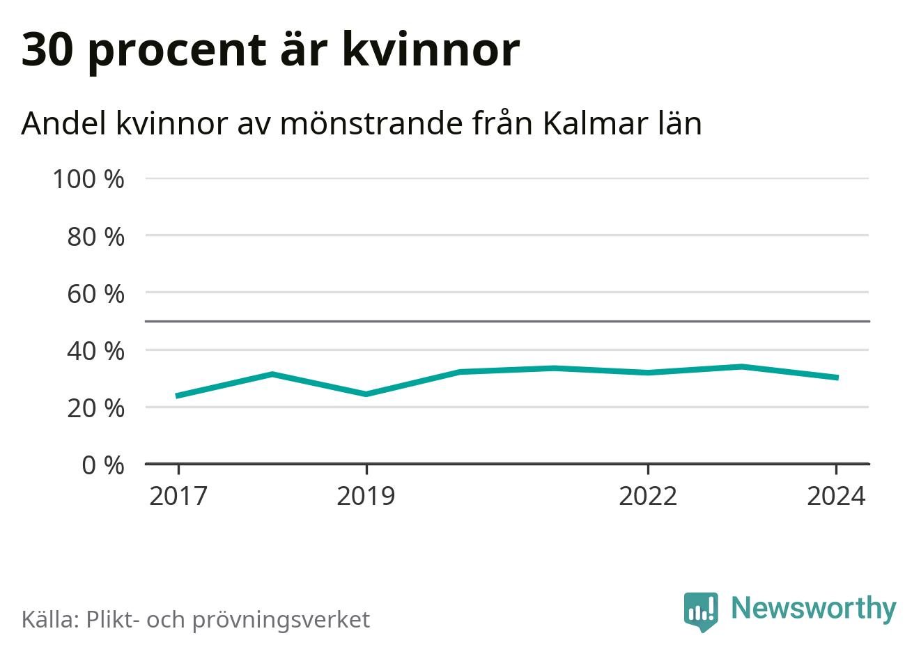 192 av de som kallats till mönstring från Kalmar län är kvinnor, vilket motsvarar 30 procent av de mönstrande. Som mest har 199 kvinnor kallats från kommunen (2023). I riket som helhet är 30 procent av de mönstrande tjejer.