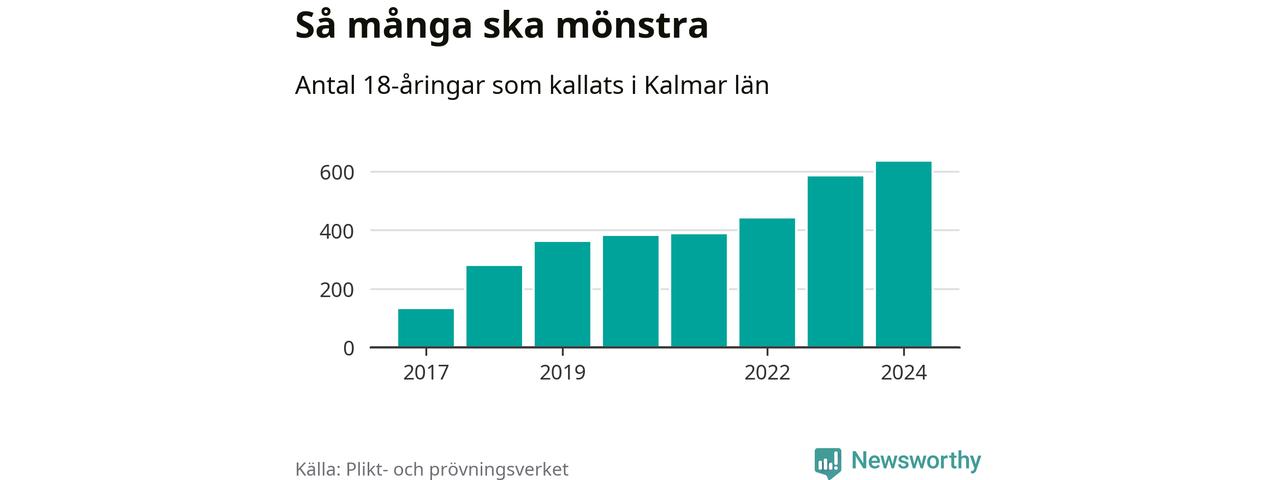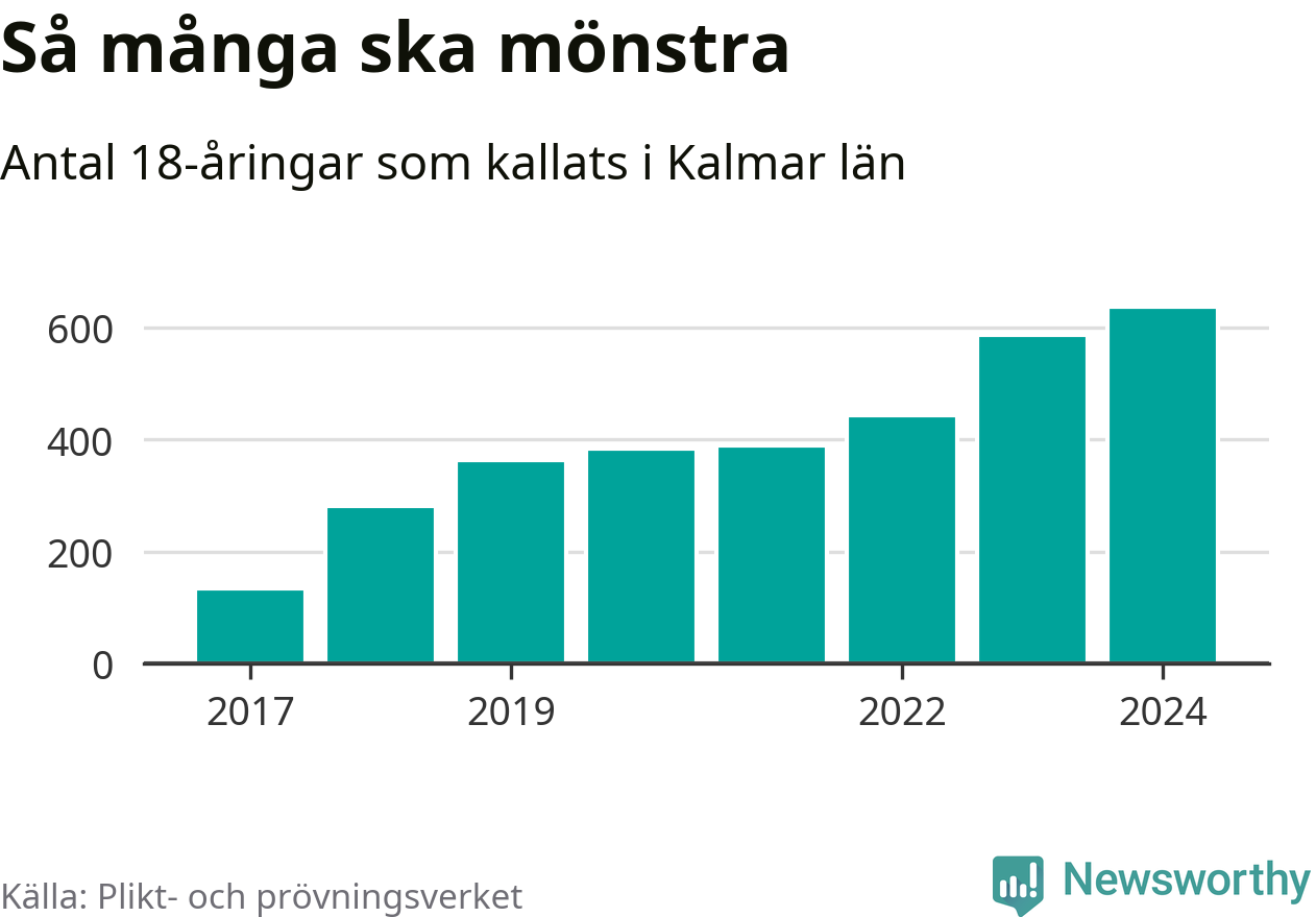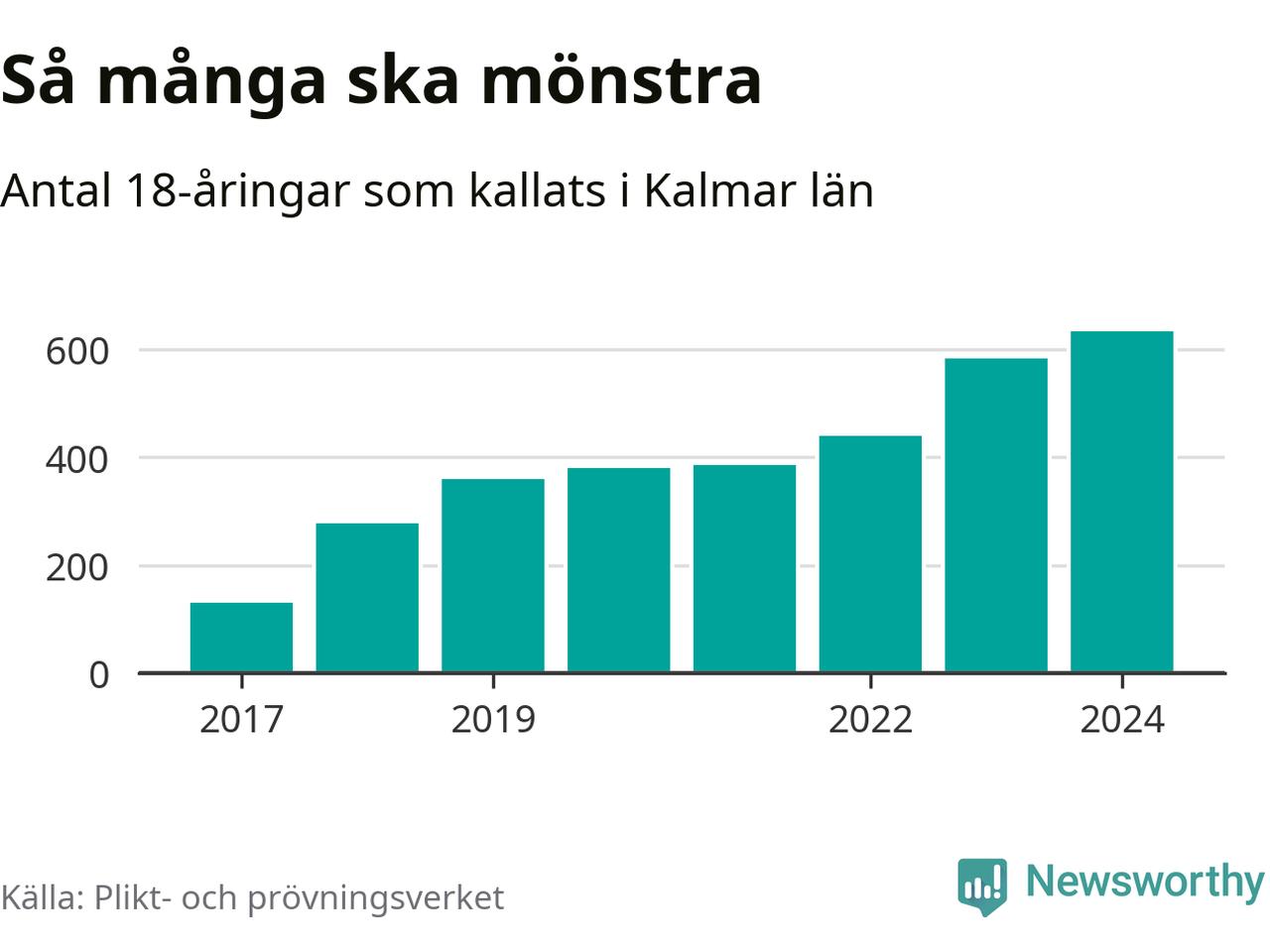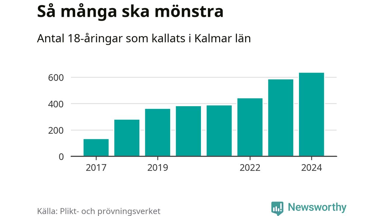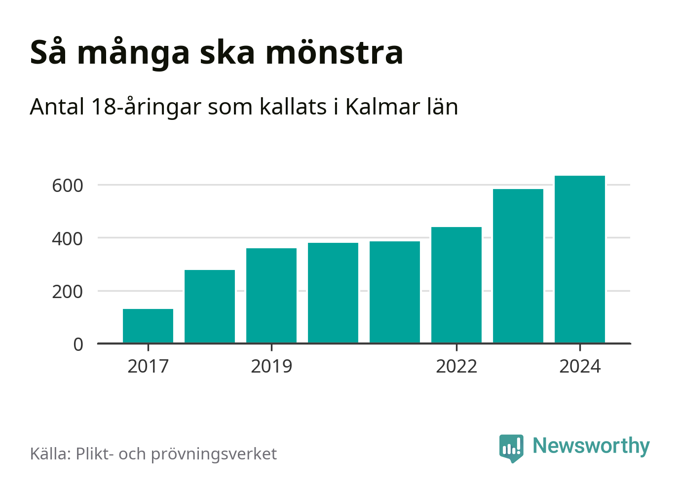 Antalet kallade i Kalmar län har ökat varje år sedan värnplikten infördes 2017 och jämfört med 2023 är det 50 fler i år. 2017 kallades som jämförelse 134 artonåringar från Kalmar län till mönstring. Det motsvarade ungefär 5 procent av årskullen född år 1999.
