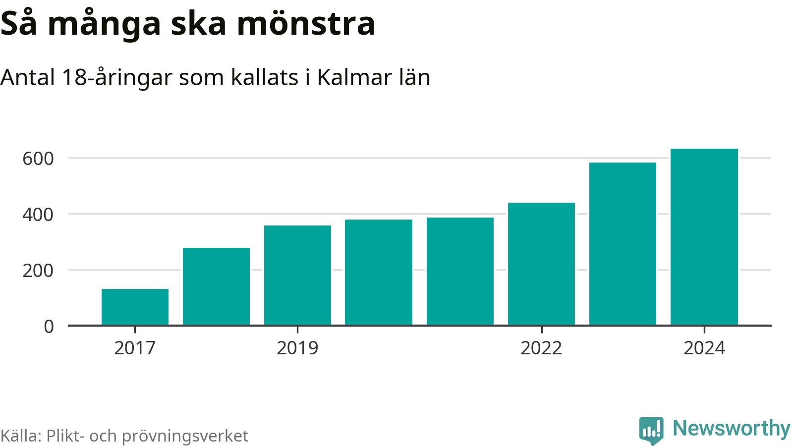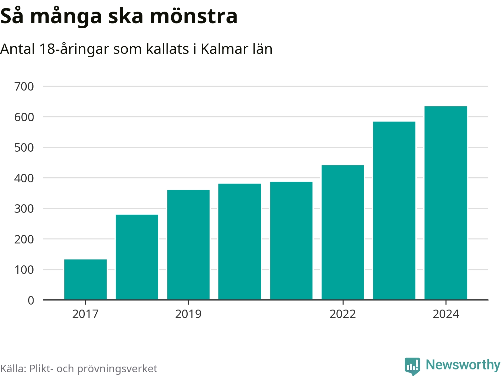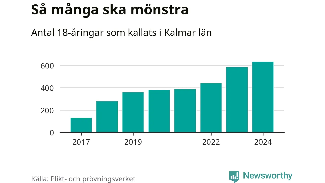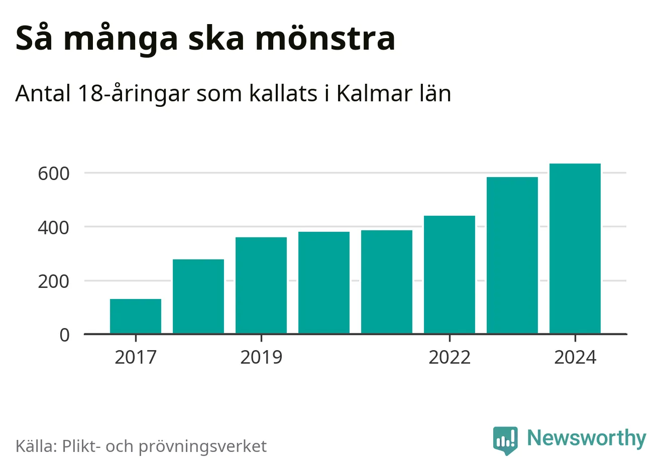 Antalet kallade i Kalmar län har ökat varje år sedan värnplikten infördes 2017 och jämfört med 2023 är det 50 fler i år. 2017 kallades som jämförelse 134 artonåringar från Kalmar län till mönstring. Det motsvarade ungefär 5 procent av årskullen född år 1999.
