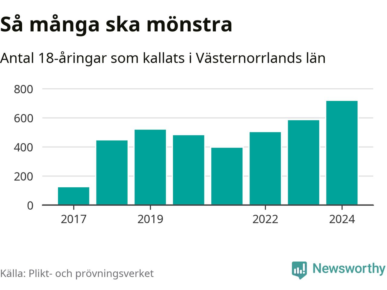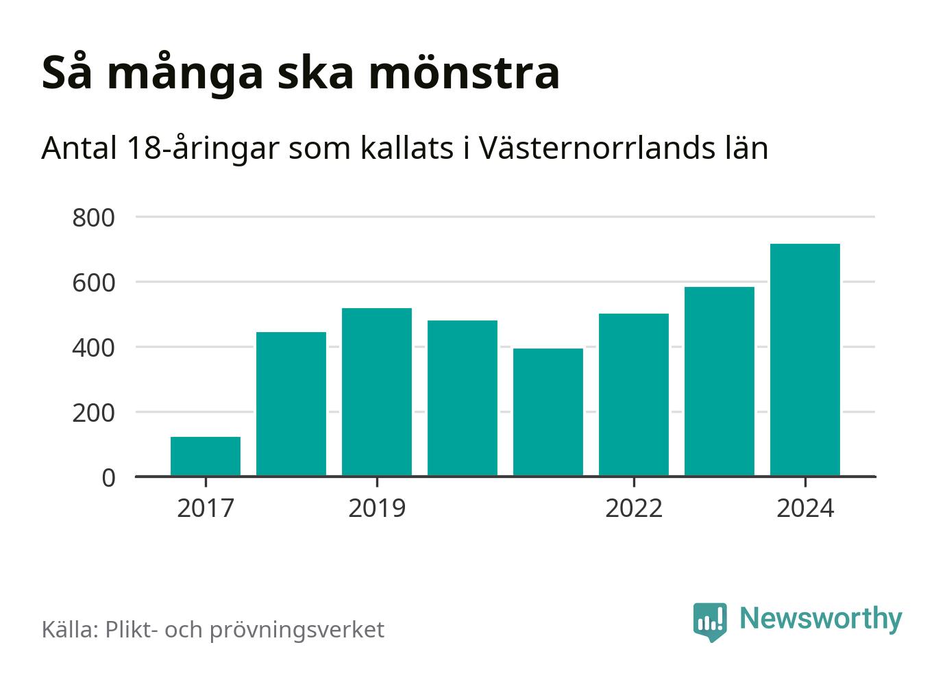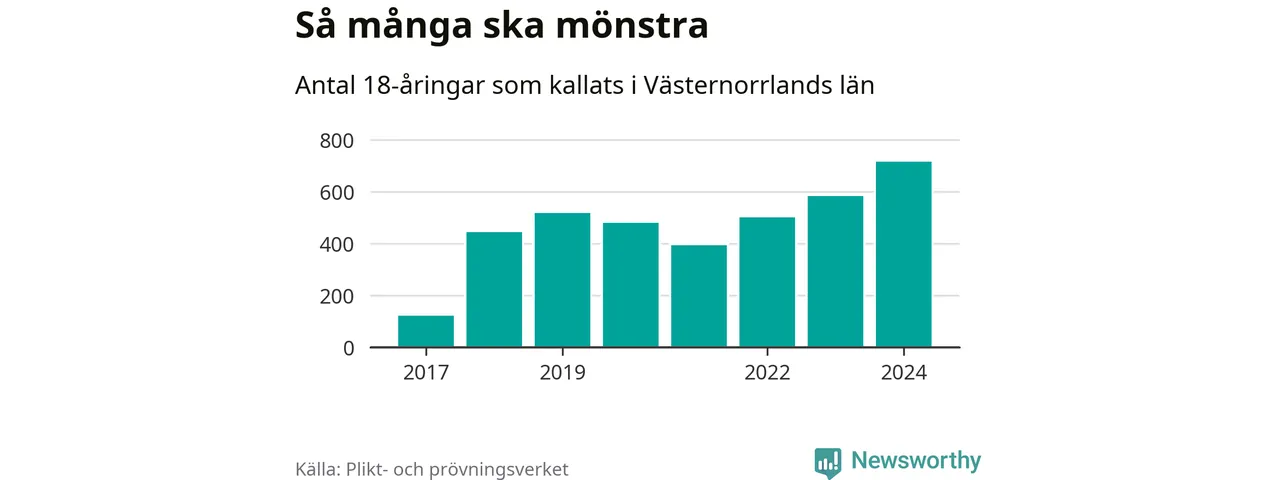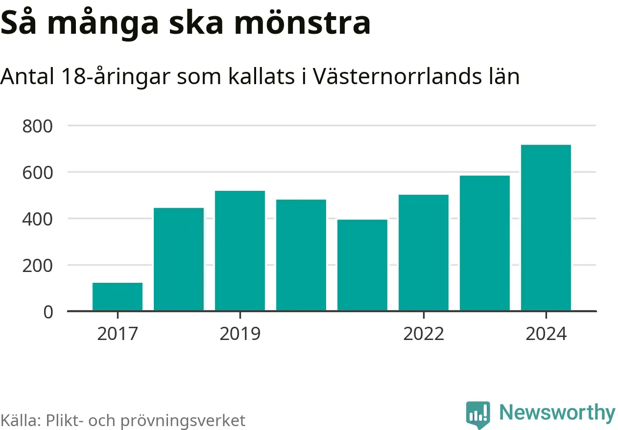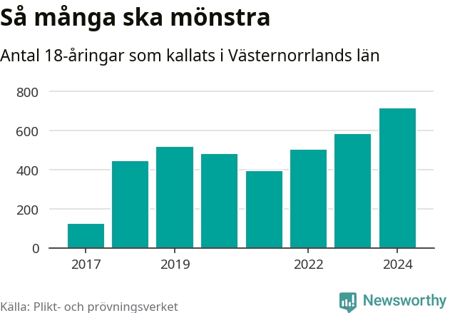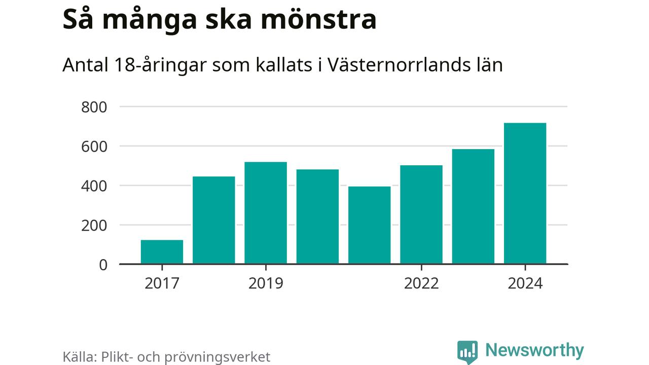 719 personer är det högsta antalet kallade i Västernorrland sedan värnplikten infördes 2017 och 132 mönstrande mer än 2023. 2017 kallades som jämförelse 126 artonåringar från Västernorrland till mönstring. Det motsvarade ungefär 5 procent av årskullen född år 1999.