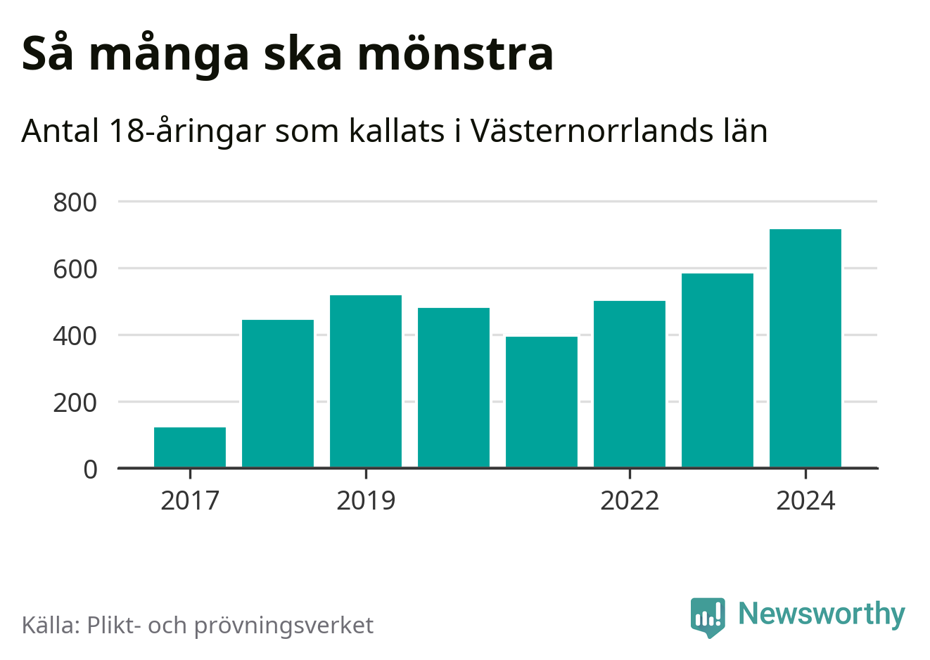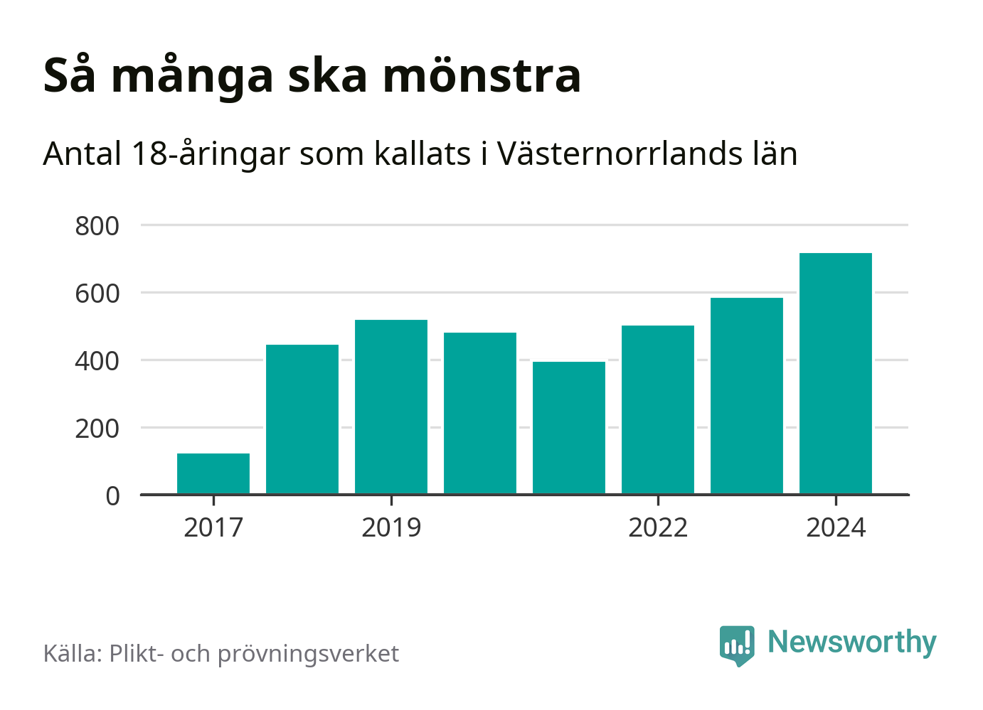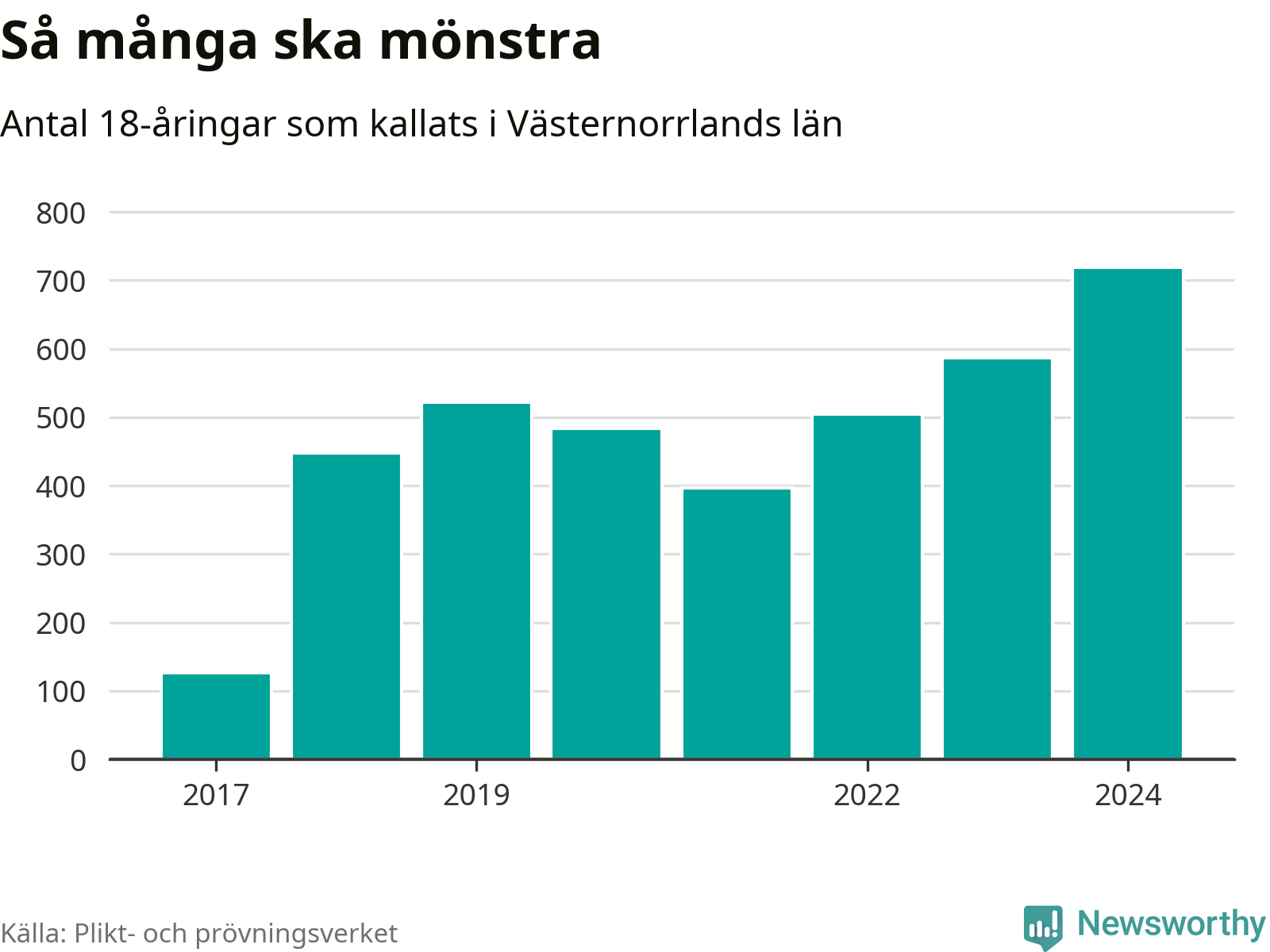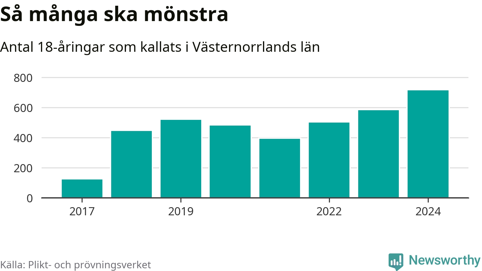 719 personer är det högsta antalet kallade i Västernorrland sedan värnplikten infördes 2017 och 132 mönstrande mer än 2023. 2017 kallades som jämförelse 126 artonåringar från Västernorrland till mönstring. Det motsvarade ungefär 5 procent av årskullen född år 1999.