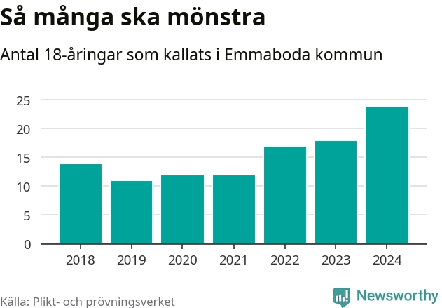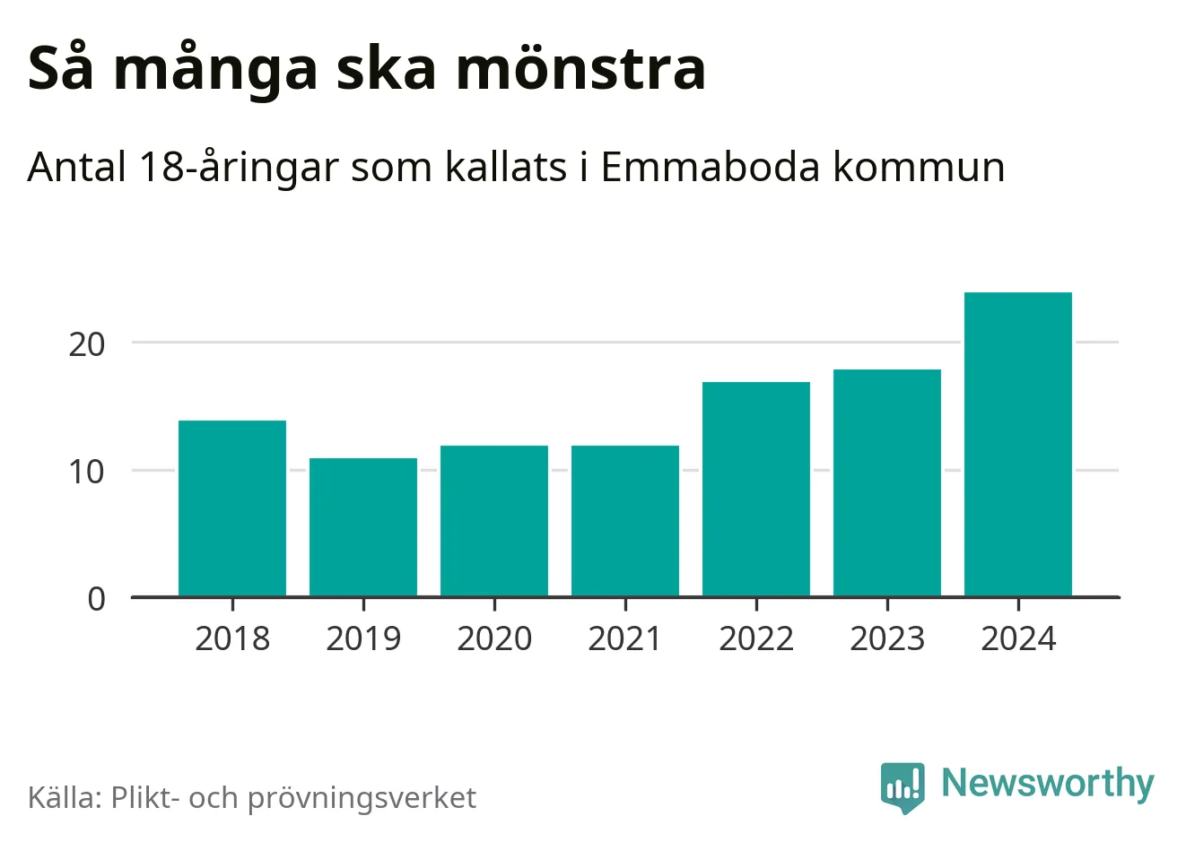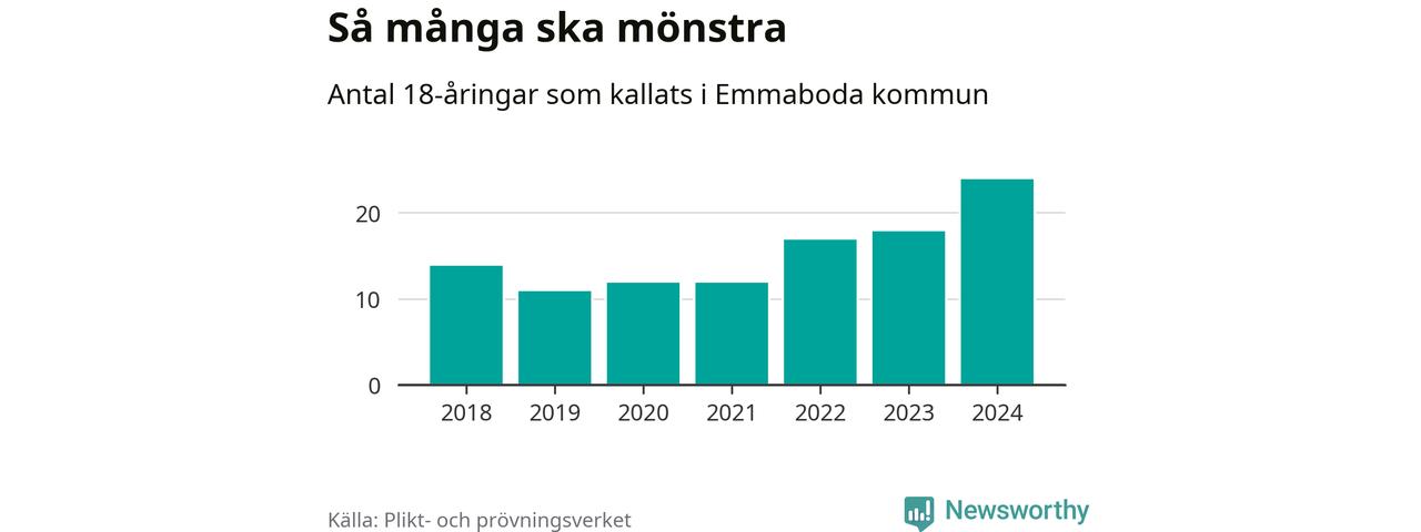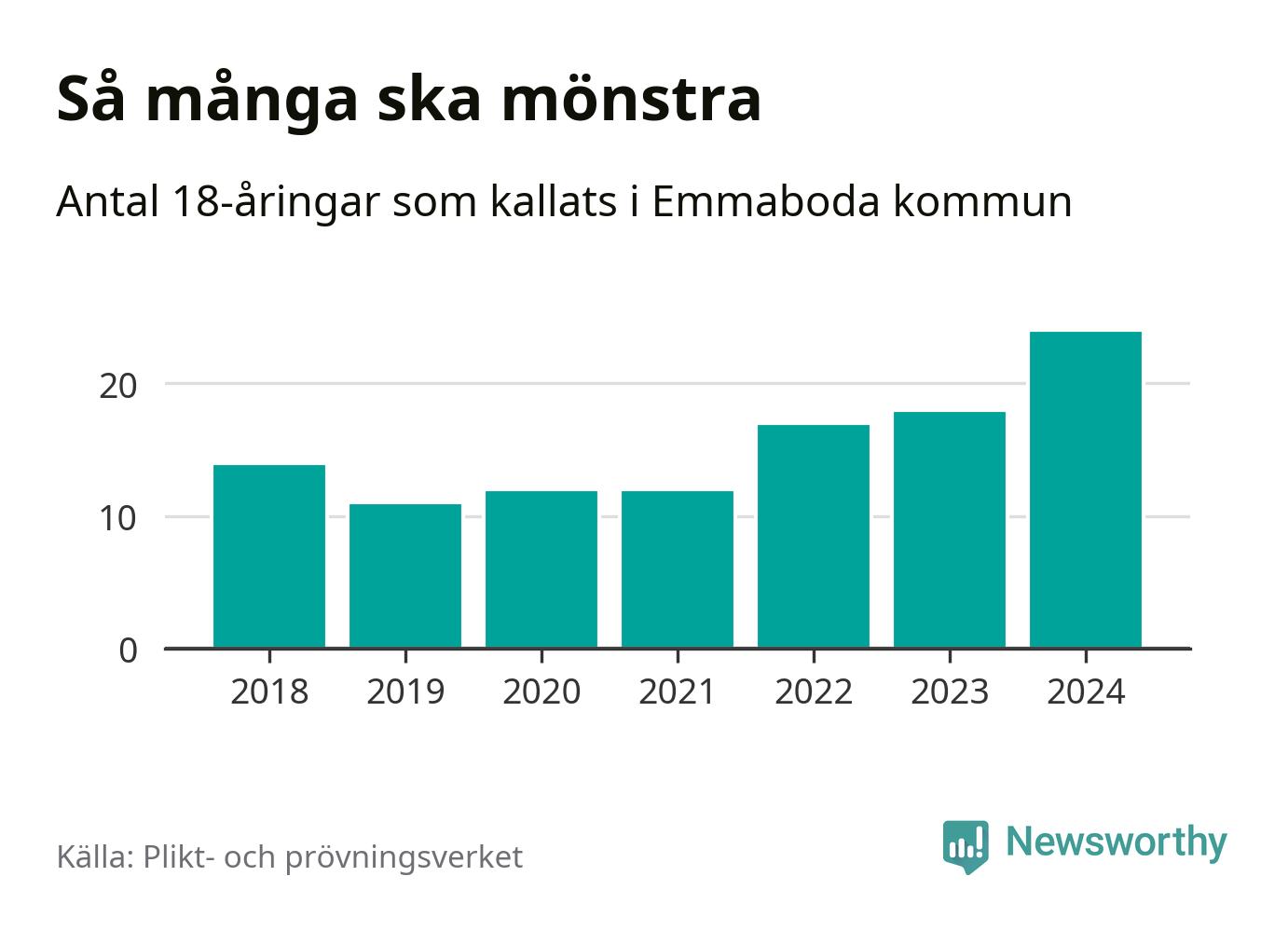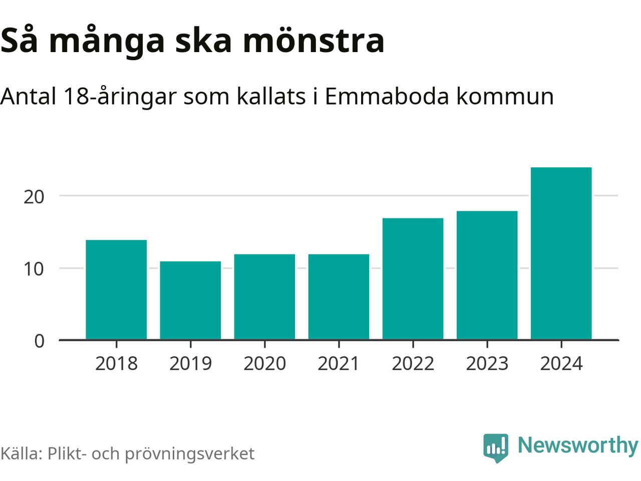 24 personer är det högsta antalet kallade i Emmaboda sedan 2018, som är första året med statistik på kommunnivå (värnplikten återinfördes 2017), och sex mönstrande mer än 2023. 2018 kallades som jämförelse 14 artonåringar från Emmaboda till mönstring. Det motsvarade ungefär 13 procent av årskullen född år 2000. Totalt från Kalmar län kallas 636 personer födda 2006 i år.