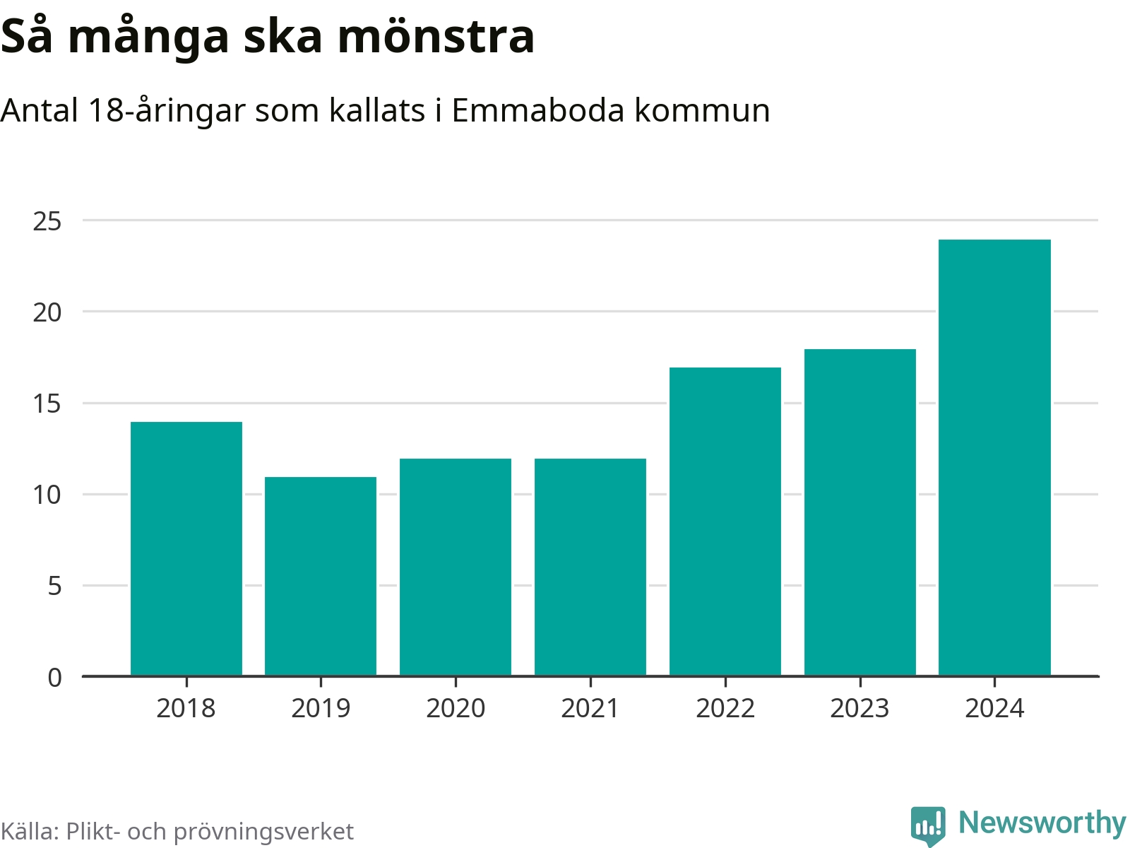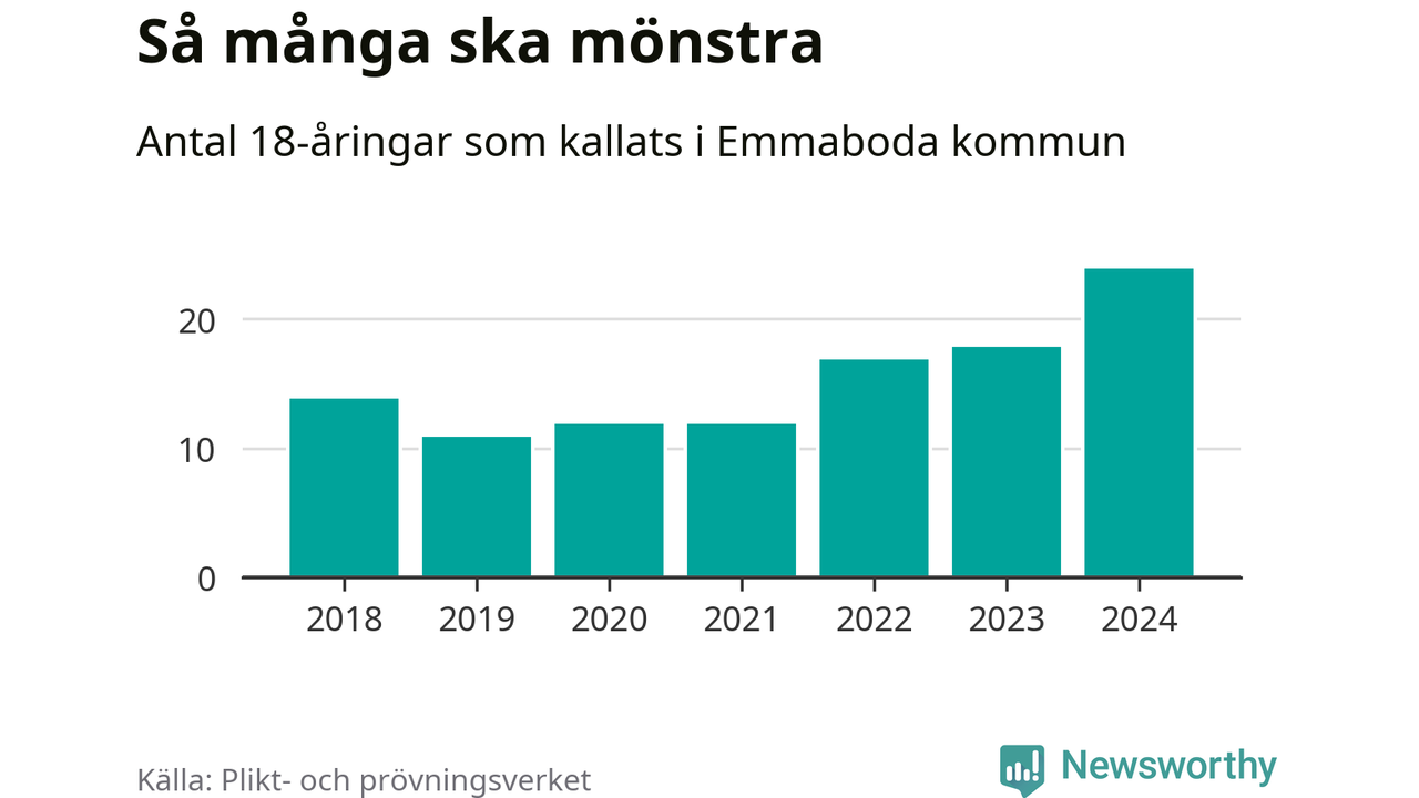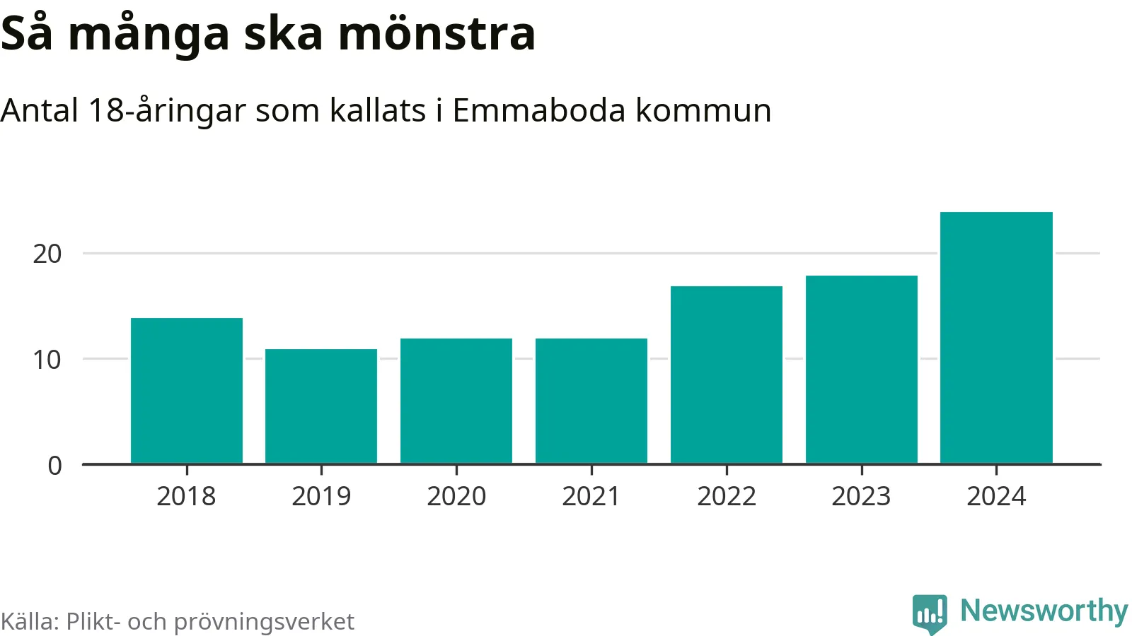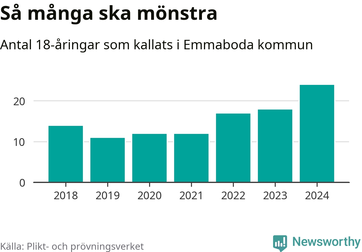 24 personer är det högsta antalet kallade i Emmaboda sedan 2018, som är första året med statistik på kommunnivå (värnplikten återinfördes 2017), och sex mönstrande mer än 2023. 2018 kallades som jämförelse 14 artonåringar från Emmaboda till mönstring. Det motsvarade ungefär 13 procent av årskullen född år 2000. Totalt från Kalmar län kallas 636 personer födda 2006 i år.