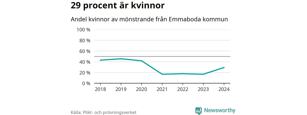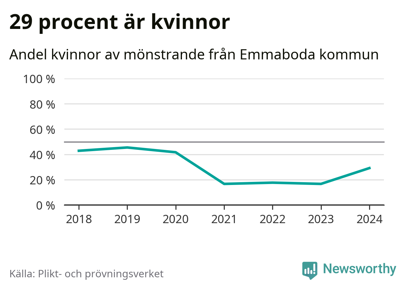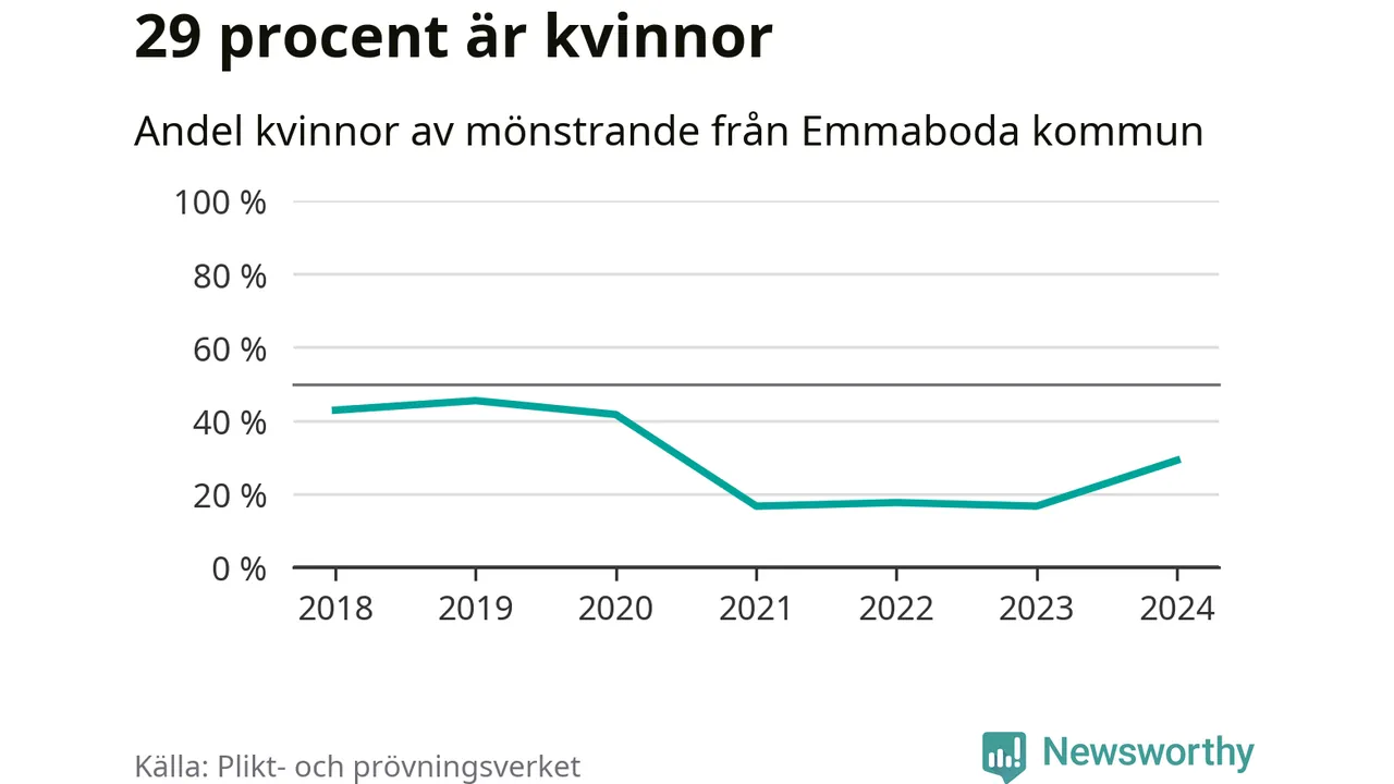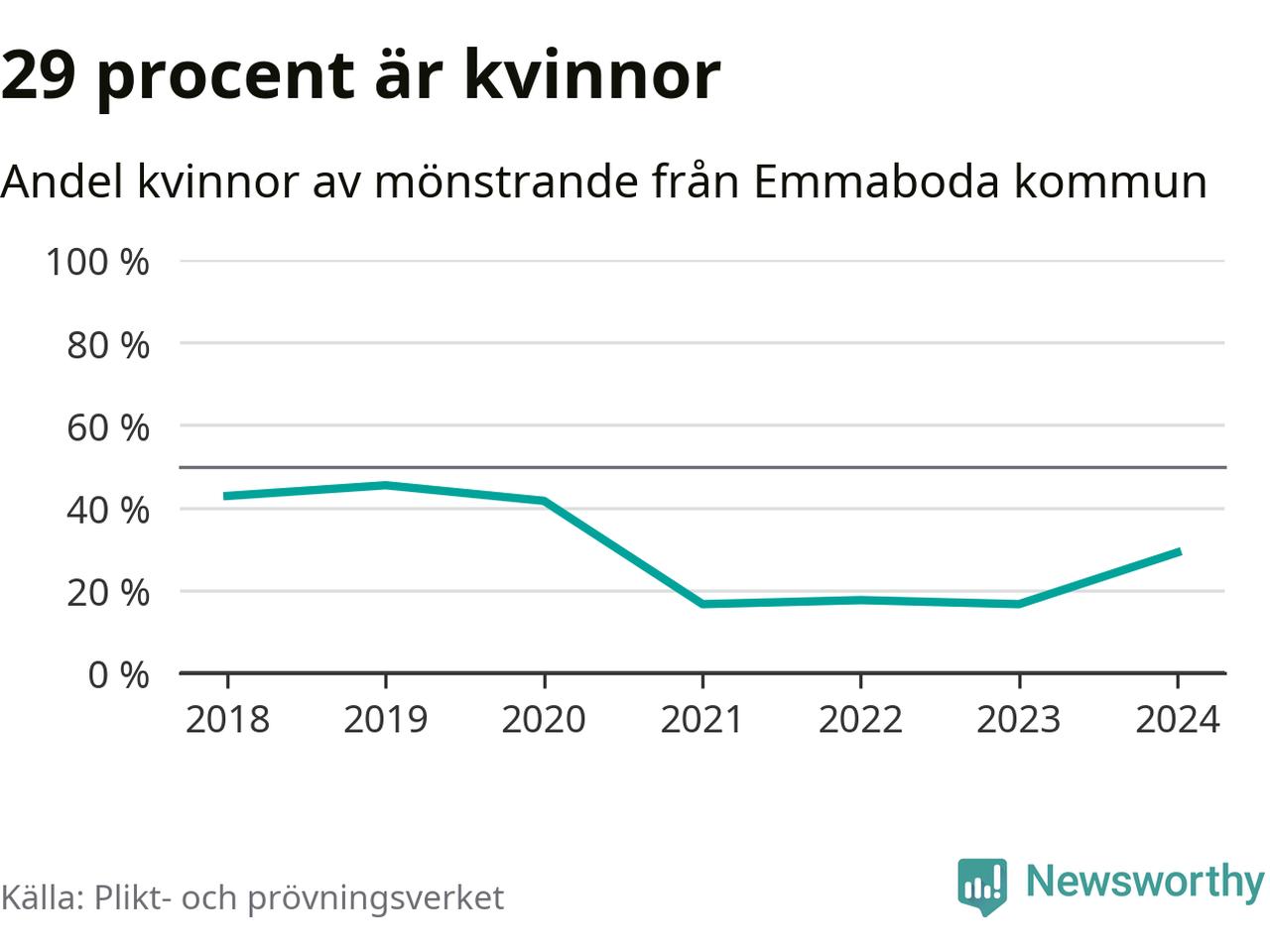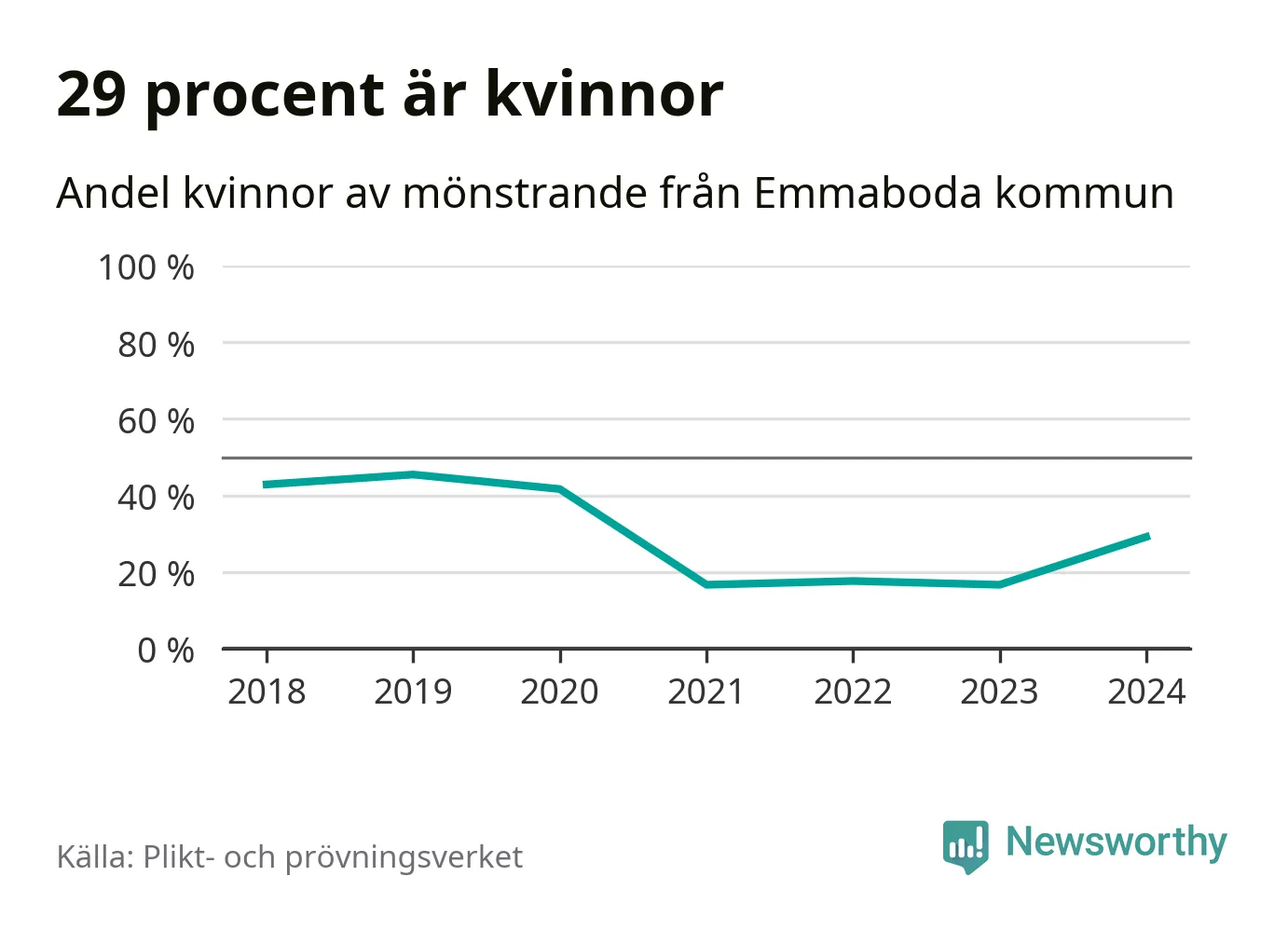 Sju av de som kallats till mönstring från Emmaboda är kvinnor, vilket motsvarar 29 procent av de mönstrande. I absoluta tal är det fler kvinnor än något år sedan värnplikten återinfördes, men 2019 var en större andel av de mönstrande från kommunen kvinnor (45 procent). I riket som helhet är 30 procent av de mönstrande tjejer.
