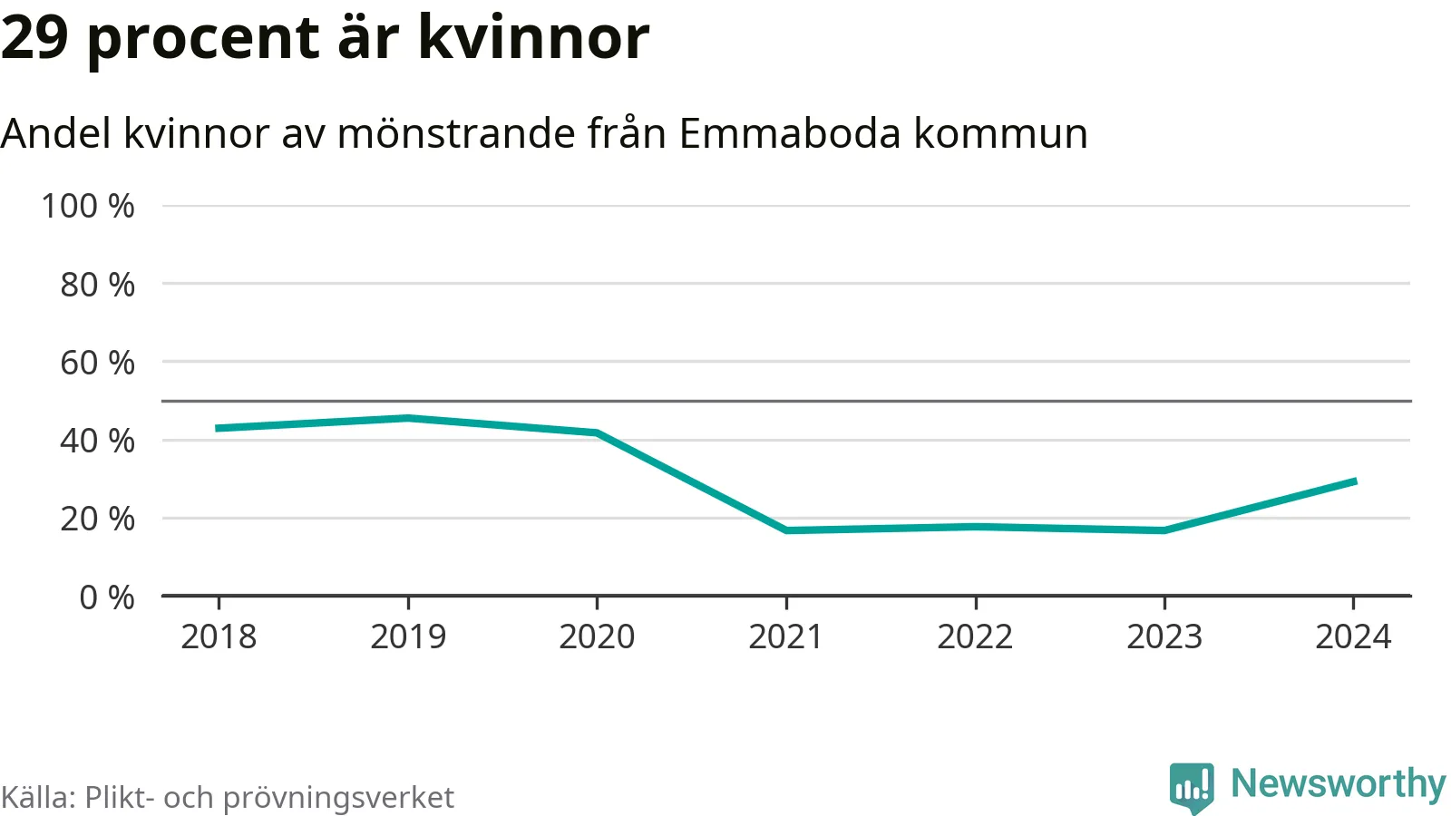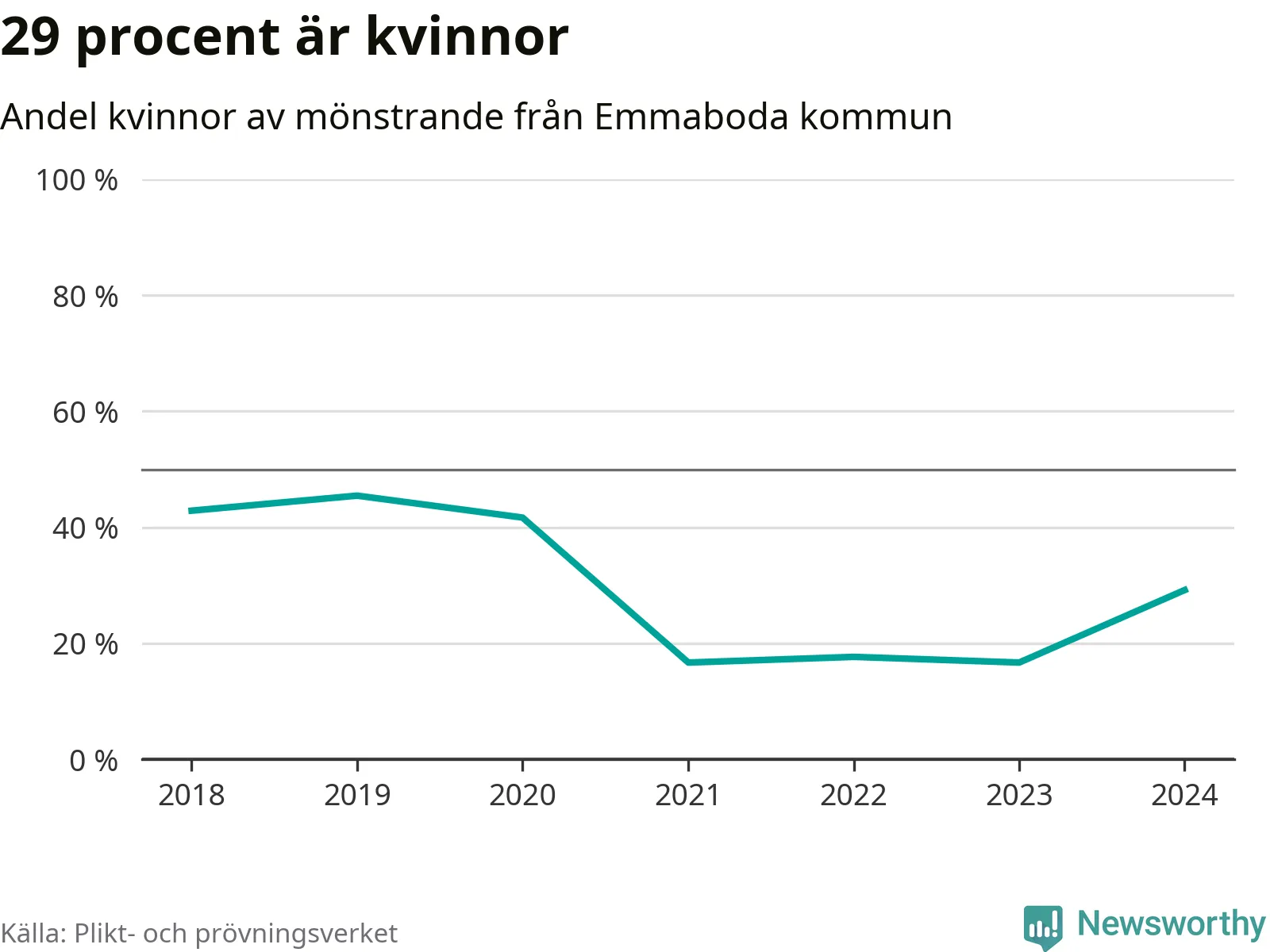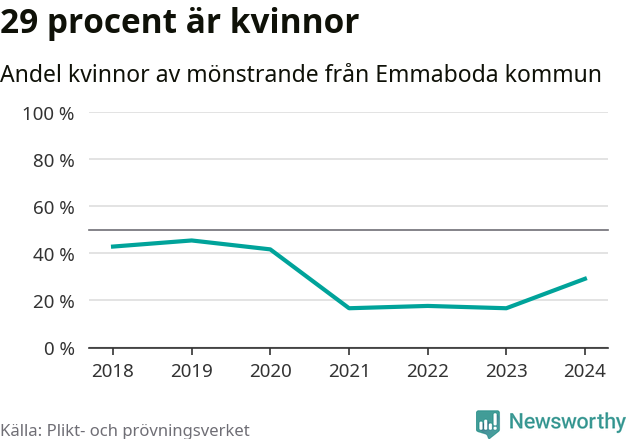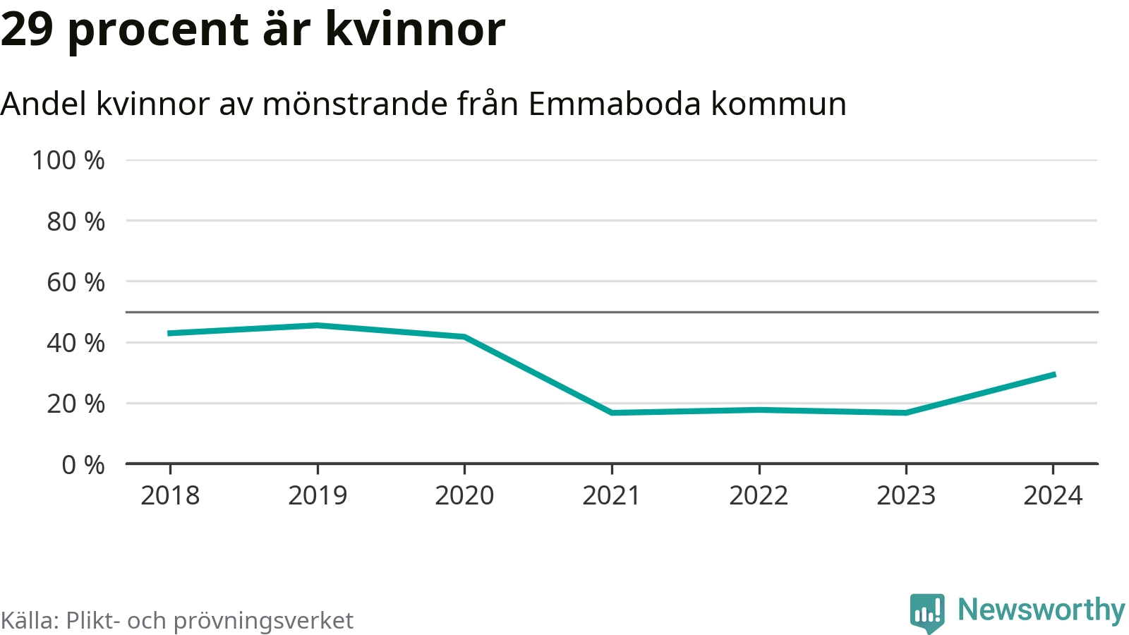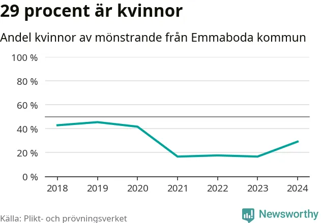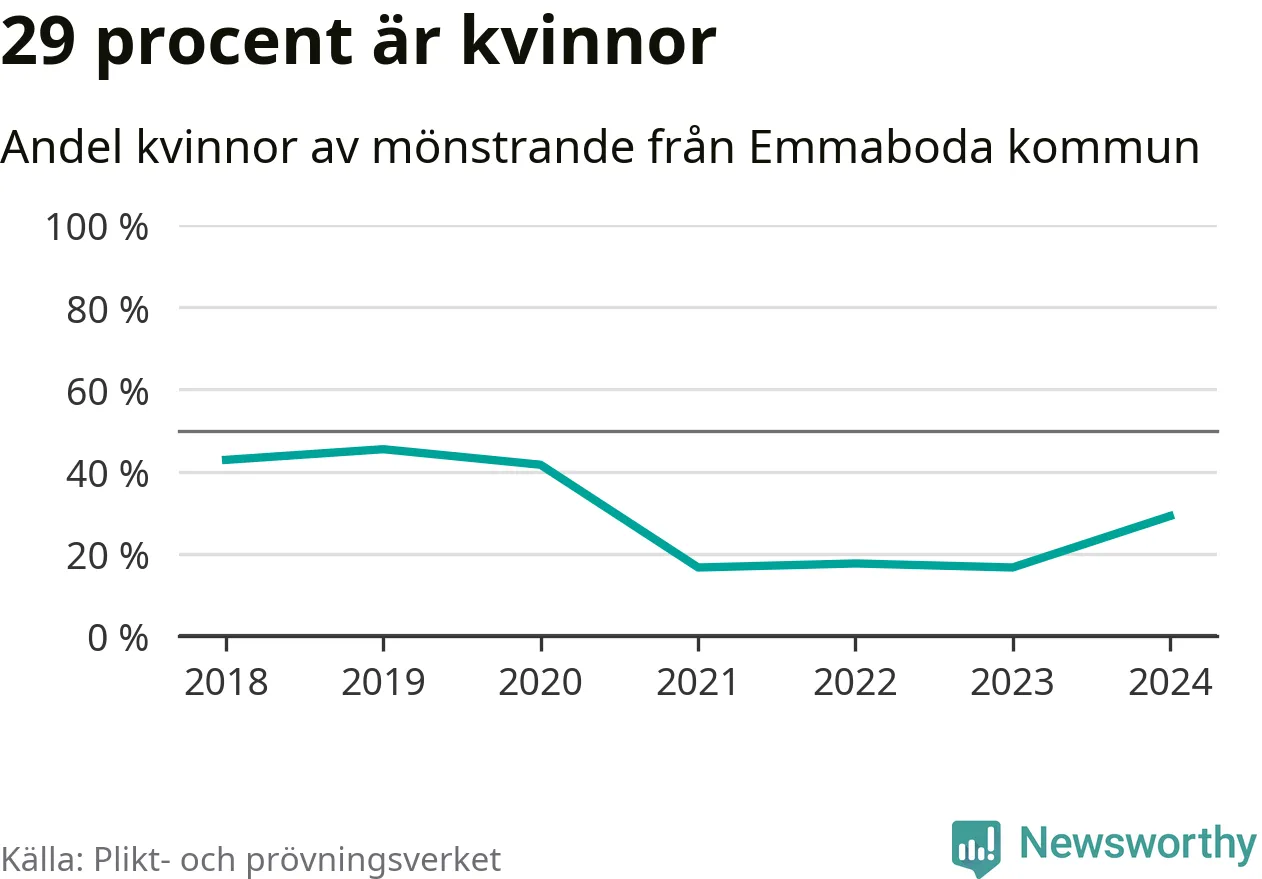 Sju av de som kallats till mönstring från Emmaboda är kvinnor, vilket motsvarar 29 procent av de mönstrande. I absoluta tal är det fler kvinnor än något år sedan värnplikten återinfördes, men 2019 var en större andel av de mönstrande från kommunen kvinnor (45 procent). I riket som helhet är 30 procent av de mönstrande tjejer.