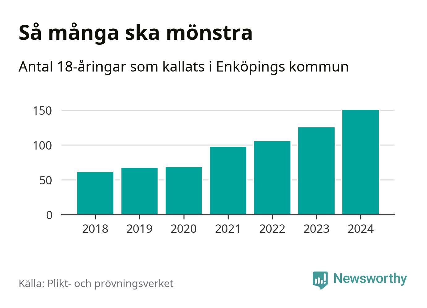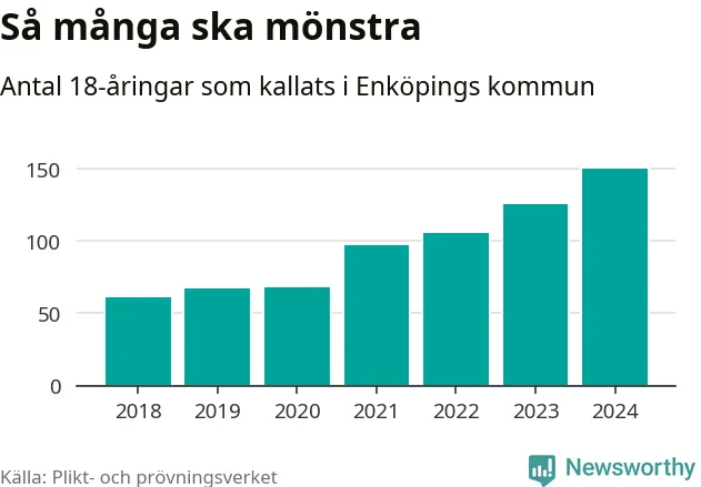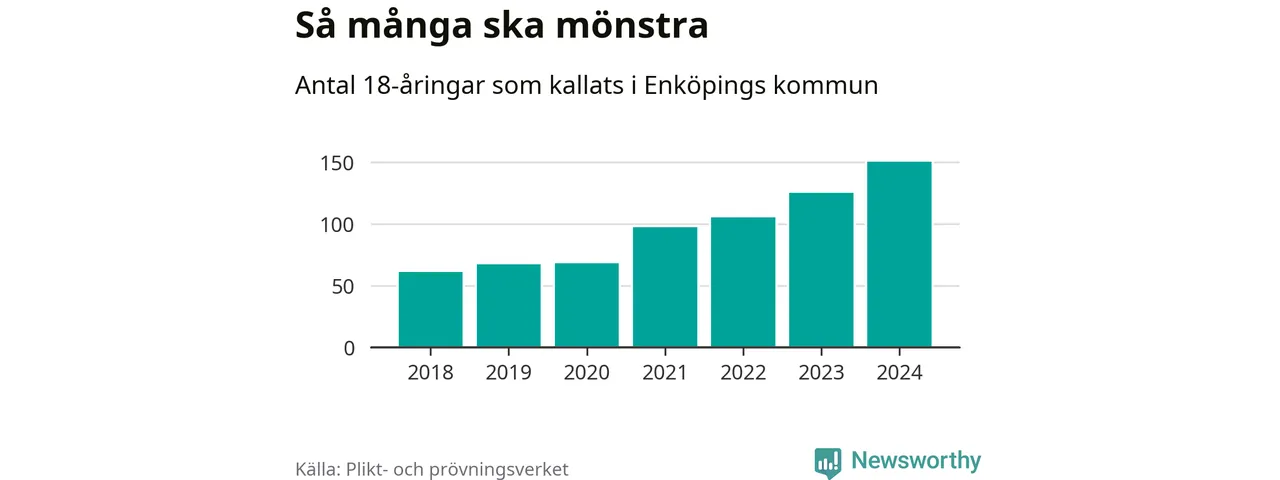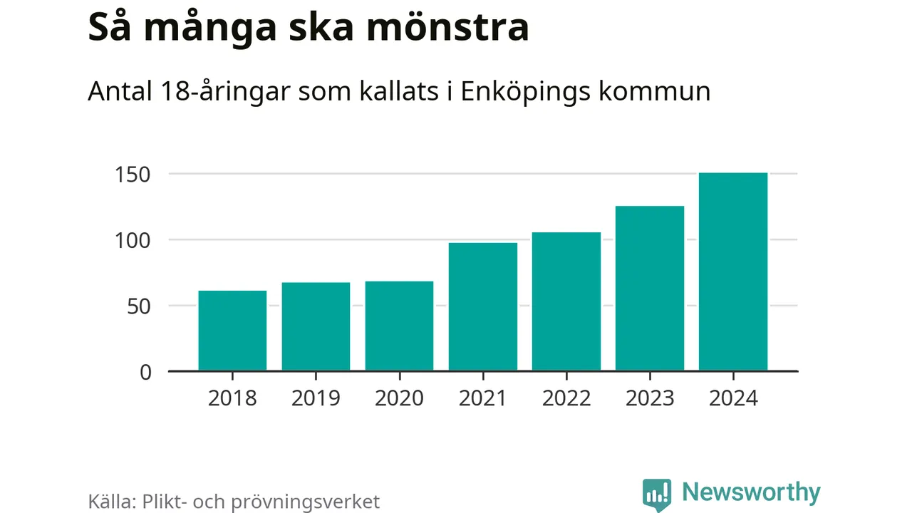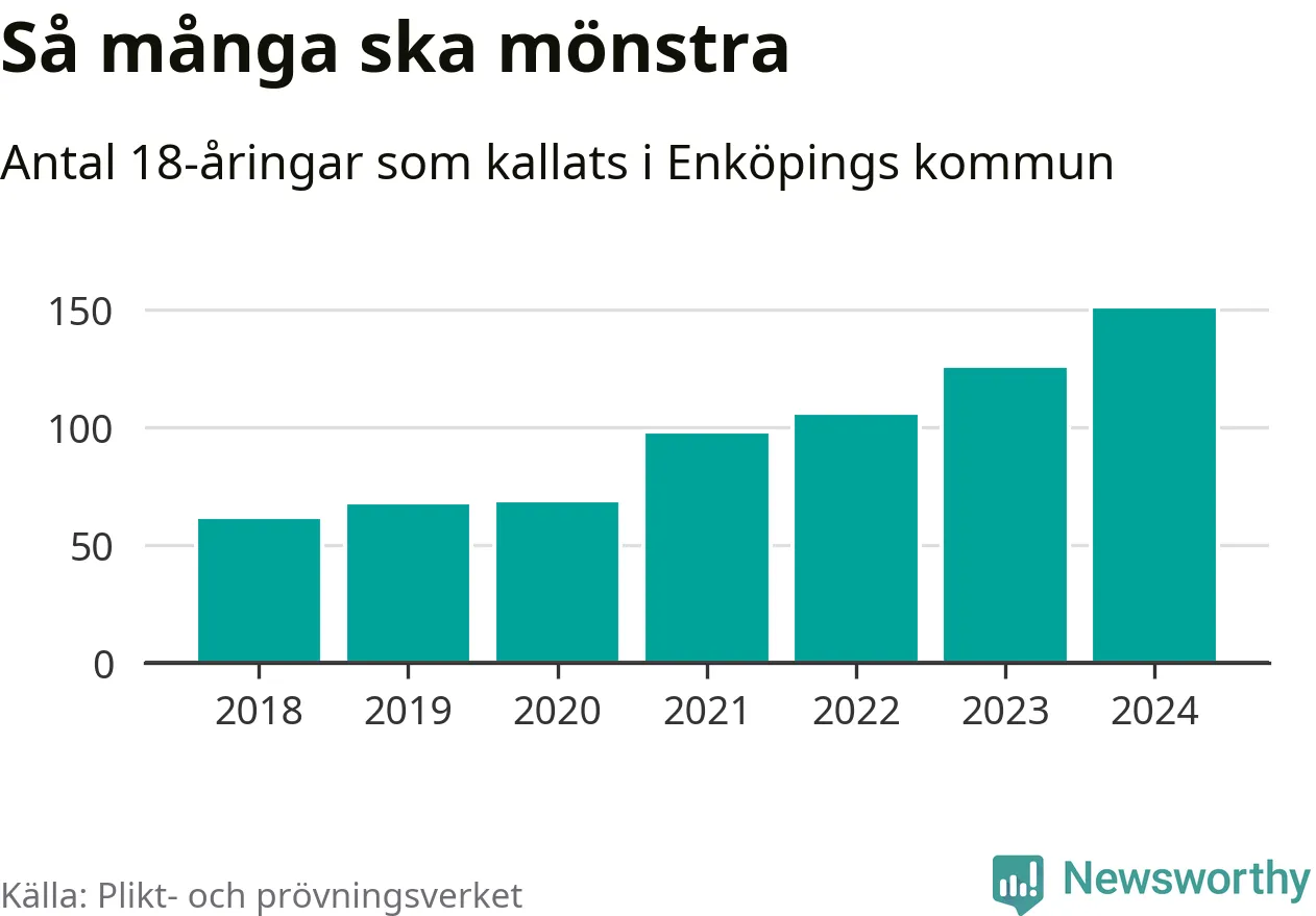 Antalet kallade i Enköping har ökat varje år sedan 2018, som är första året med statistik på kommunnivå (värnplikten återinfördes 2017), och jämfört med 2023 är det 25 fler i år. 2018 kallades som jämförelse 62 artonåringar från Enköping till mönstring. Det motsvarade ungefär 13 procent av årskullen född år 2000. Totalt från Uppsala län kallas 1 131 personer födda 2006 i år.