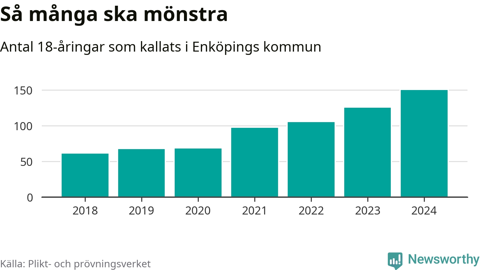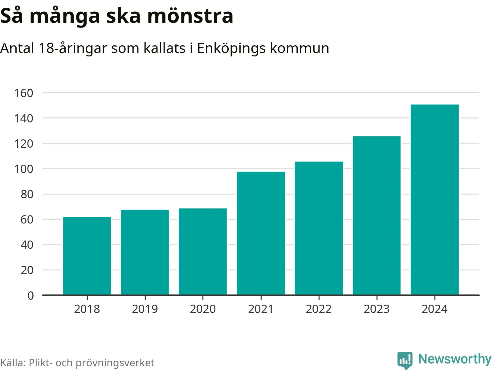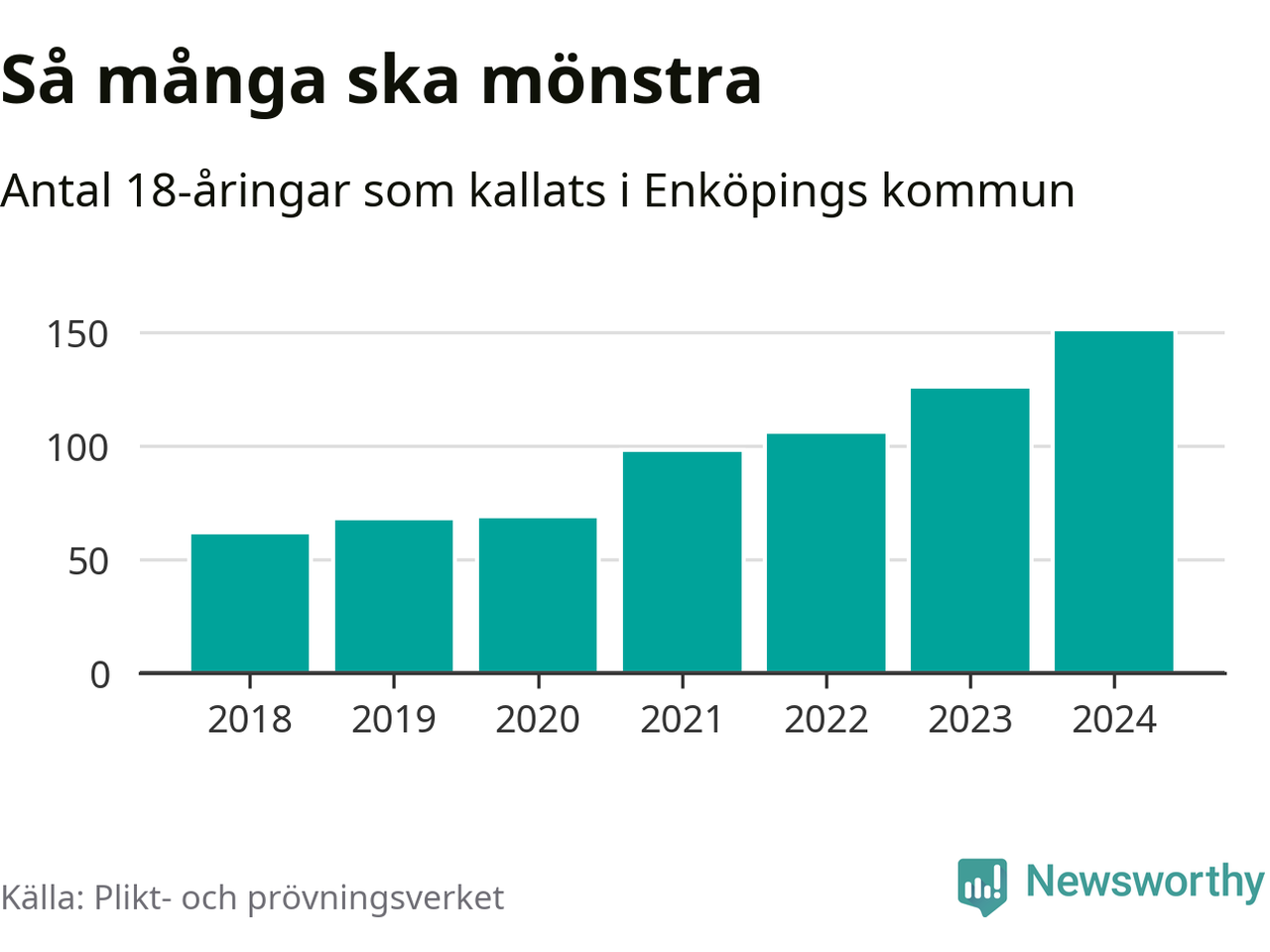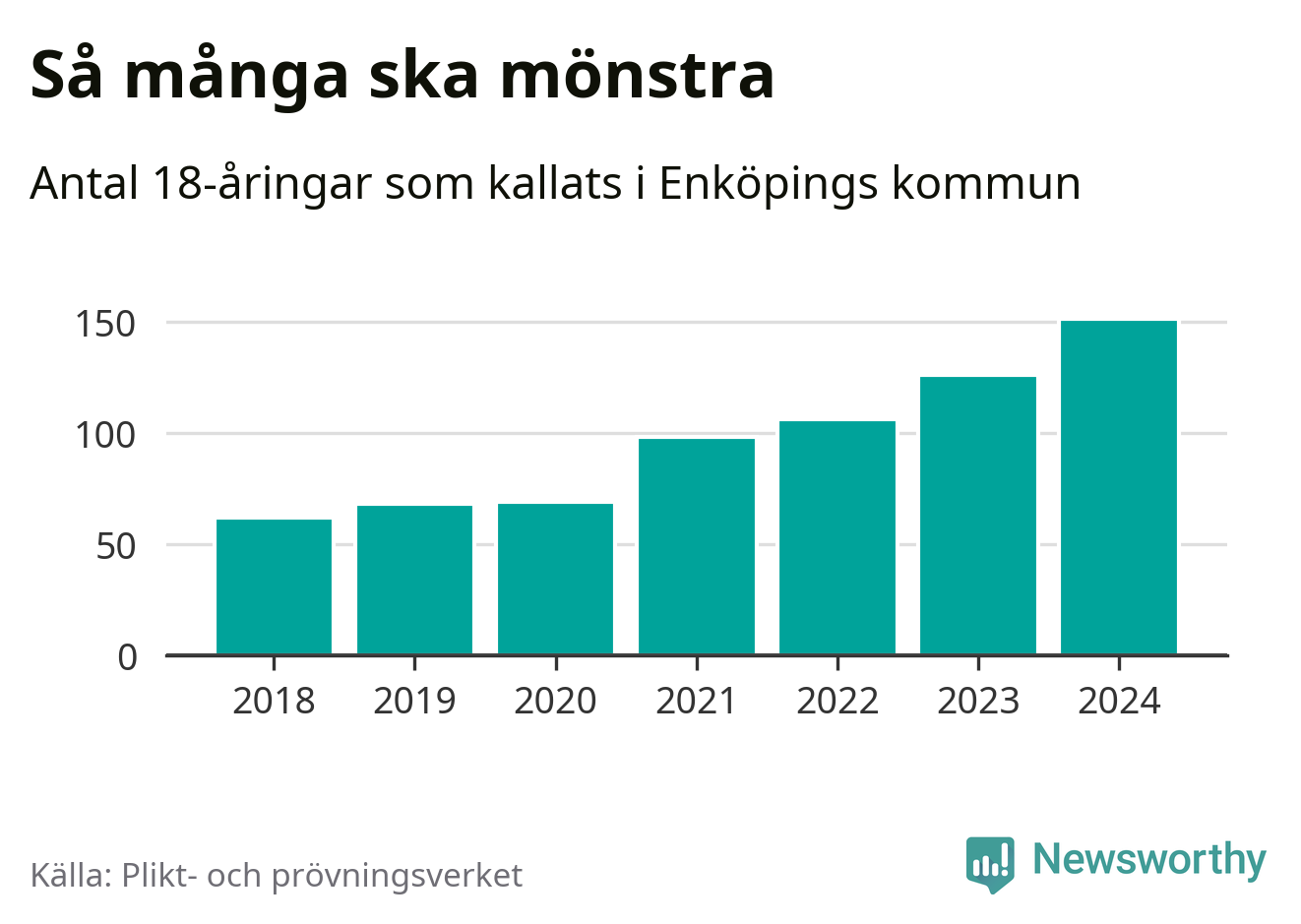 Antalet kallade i Enköping har ökat varje år sedan 2018, som är första året med statistik på kommunnivå (värnplikten återinfördes 2017), och jämfört med 2023 är det 25 fler i år. 2018 kallades som jämförelse 62 artonåringar från Enköping till mönstring. Det motsvarade ungefär 13 procent av årskullen född år 2000. Totalt från Uppsala län kallas 1 131 personer födda 2006 i år.
