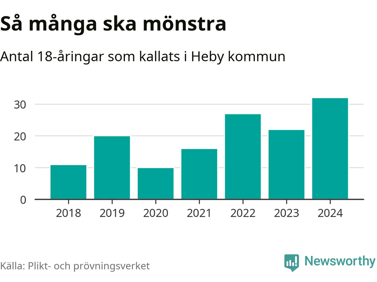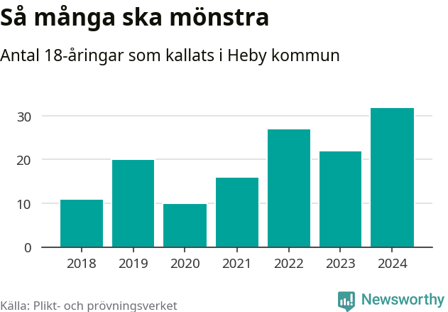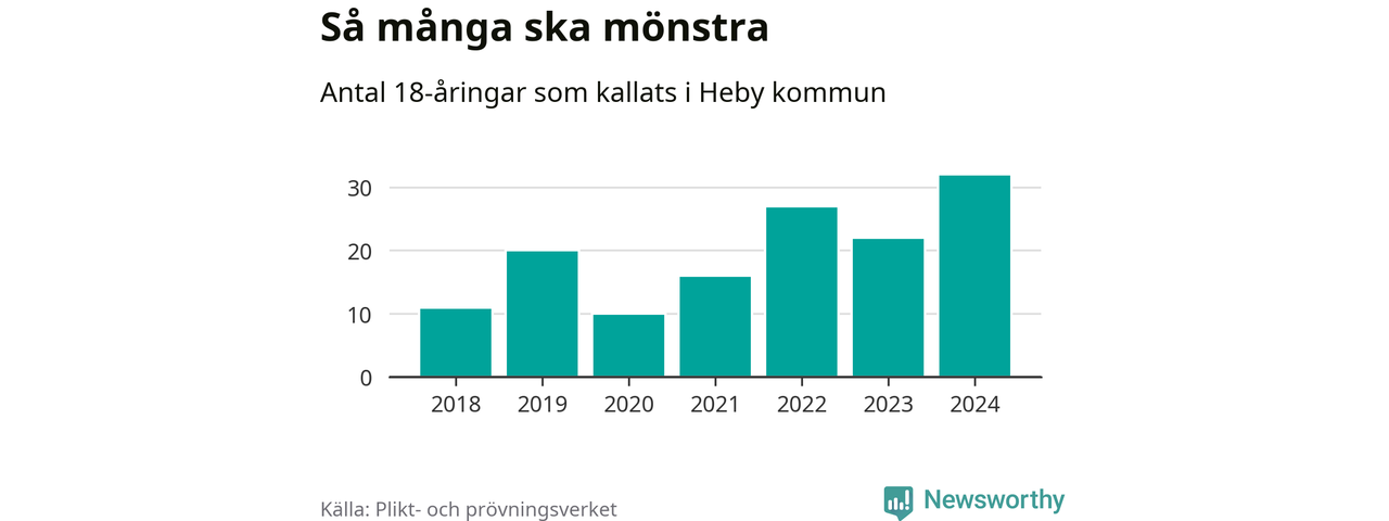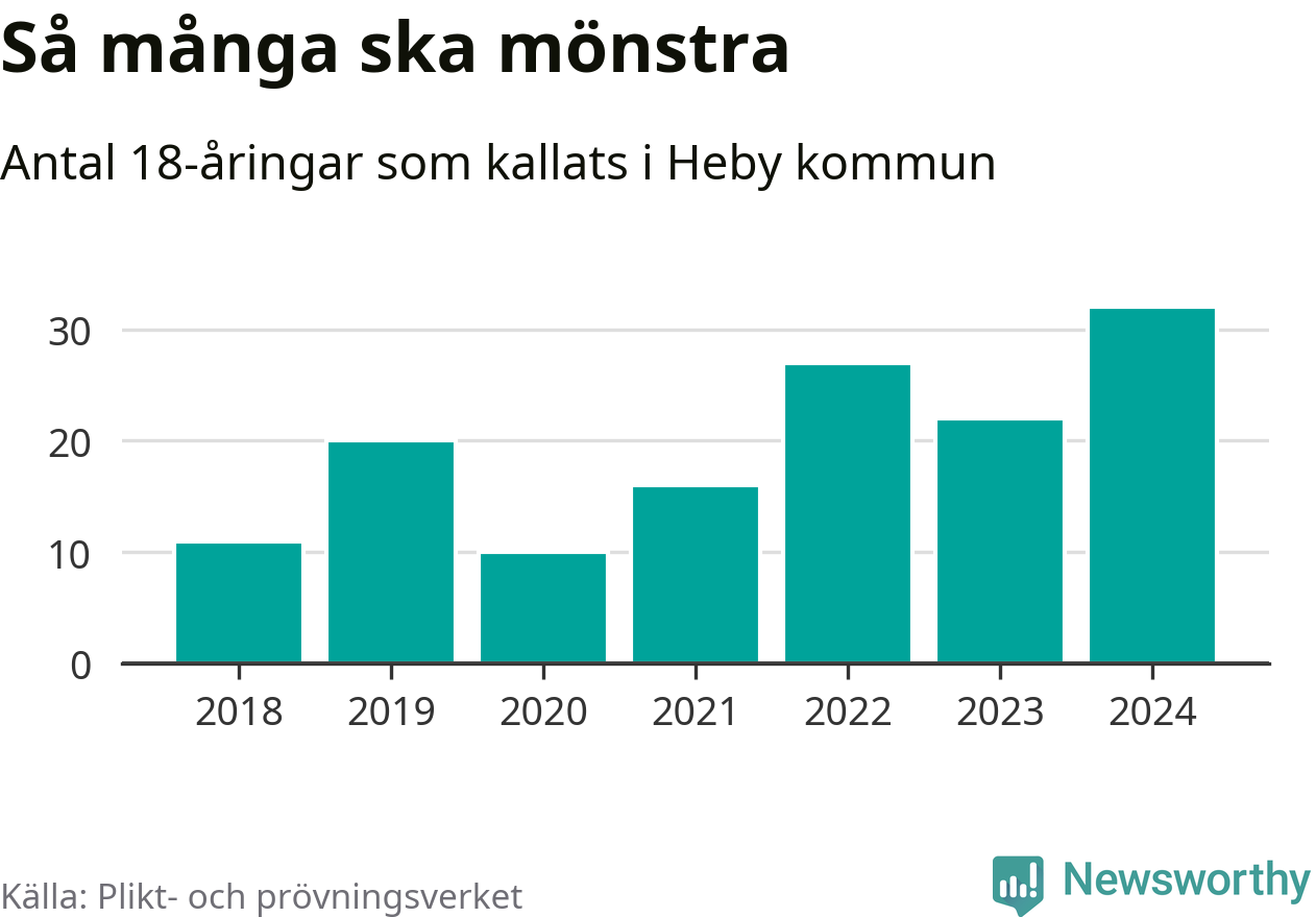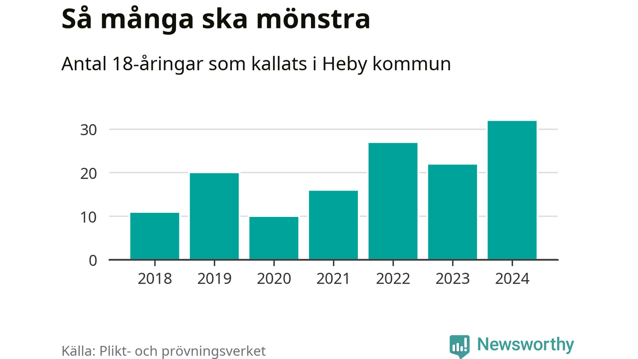 32 personer är det högsta antalet kallade i Heby sedan 2018, som är första året med statistik på kommunnivå (värnplikten återinfördes 2017), och tio mönstrande mer än 2023. 2018 kallades som jämförelse elva 18-åringar från Heby till mönstring. Det motsvarade ungefär 7 procent av årskullen född år 2000. Totalt från Uppsala län kallas 1 131 personer födda 2006 i år.