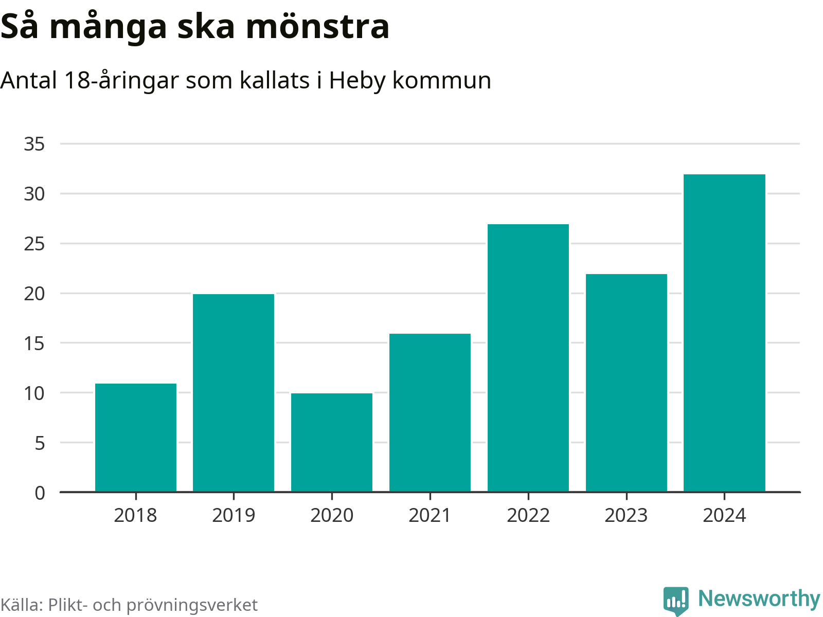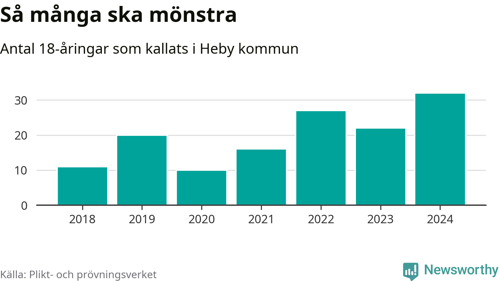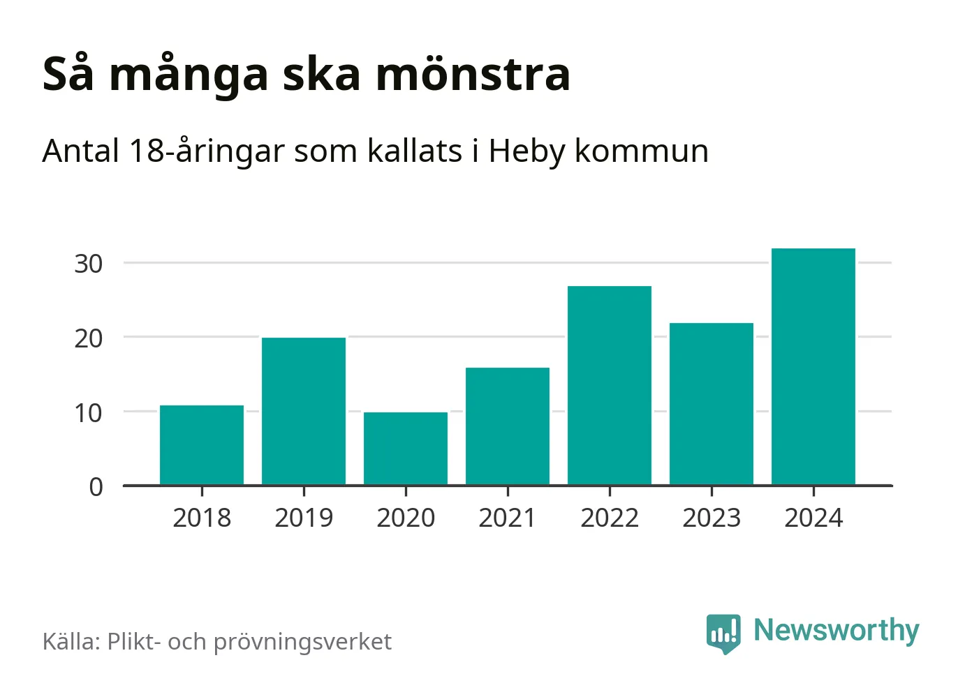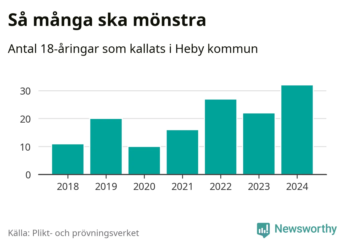 32 personer är det högsta antalet kallade i Heby sedan 2018, som är första året med statistik på kommunnivå (värnplikten återinfördes 2017), och tio mönstrande mer än 2023. 2018 kallades som jämförelse elva 18-åringar från Heby till mönstring. Det motsvarade ungefär 7 procent av årskullen född år 2000. Totalt från Uppsala län kallas 1 131 personer födda 2006 i år.