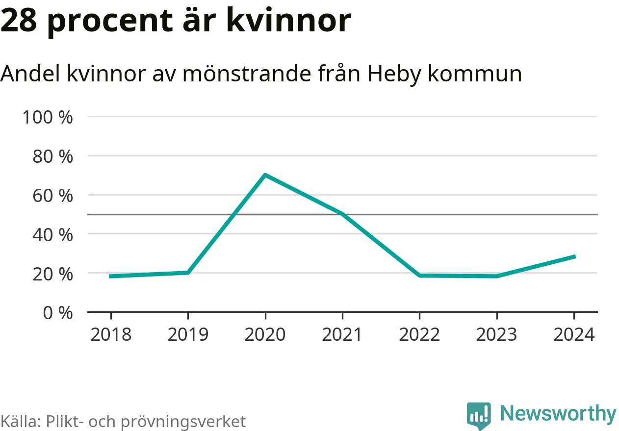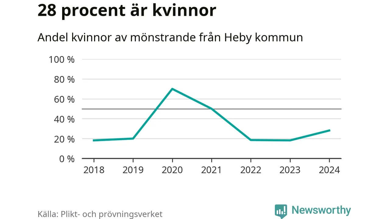Nio av de som kallats till mönstring från Heby är kvinnor, vilket motsvarar 28 procent av de mönstrande. I absoluta tal är det fler kvinnor än något år sedan värnplikten återinfördes, men 2020 var en större andel av de mönstrande från kommunen kvinnor (70 procent). I riket som helhet är 30 procent av de mönstrande tjejer.