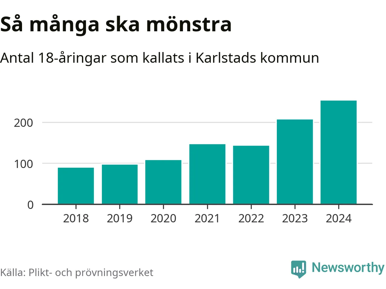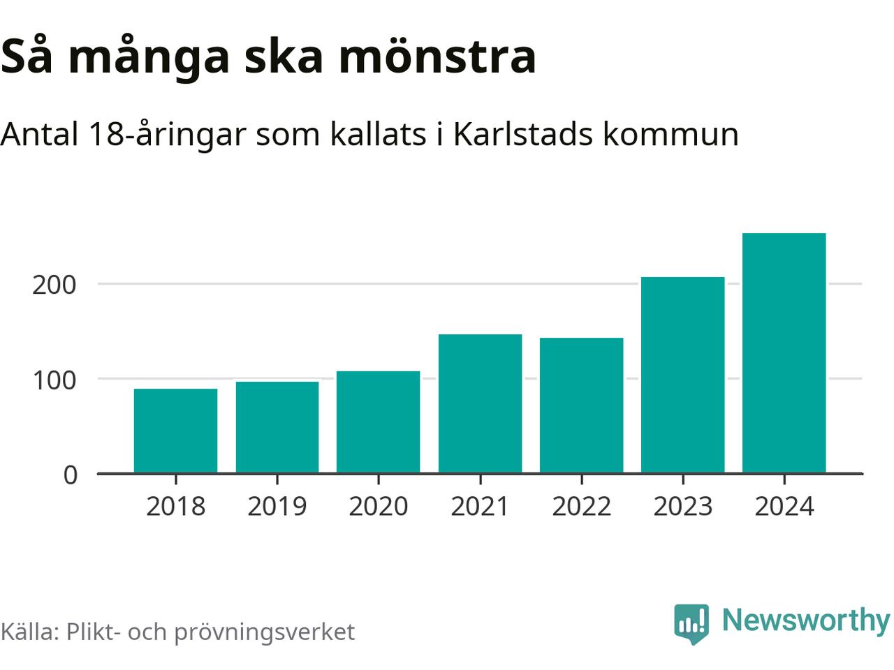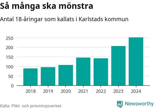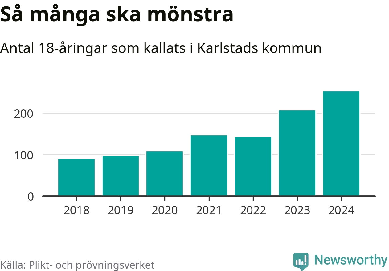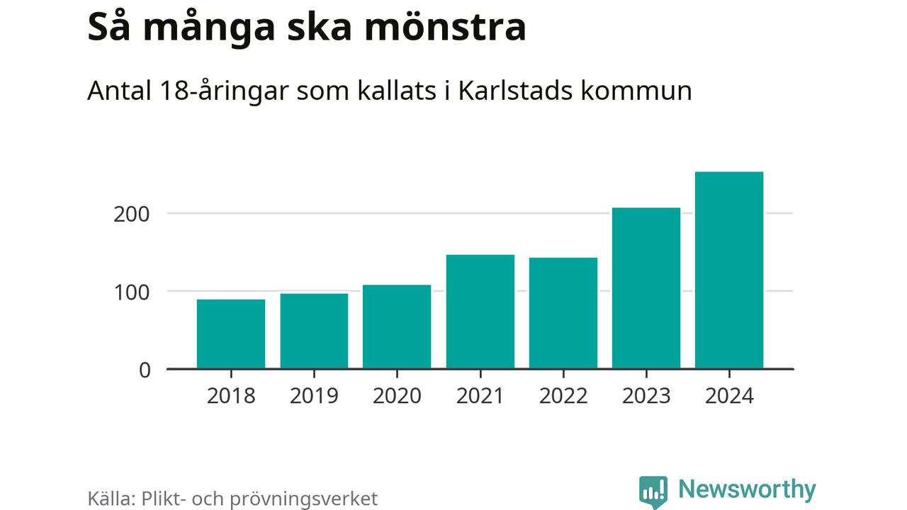 254 personer är det högsta antalet kallade i Karlstad sedan 2018, som är första året med statistik på kommunnivå (värnplikten återinfördes 2017), och 46 mönstrande mer än 2023. 2018 kallades som jämförelse 91 artonåringar från Karlstad till mönstring. Det motsvarade ungefär 10 procent av årskullen född år 2000. Totalt från Värmlands län kallas 705 personer födda 2006 i år.
