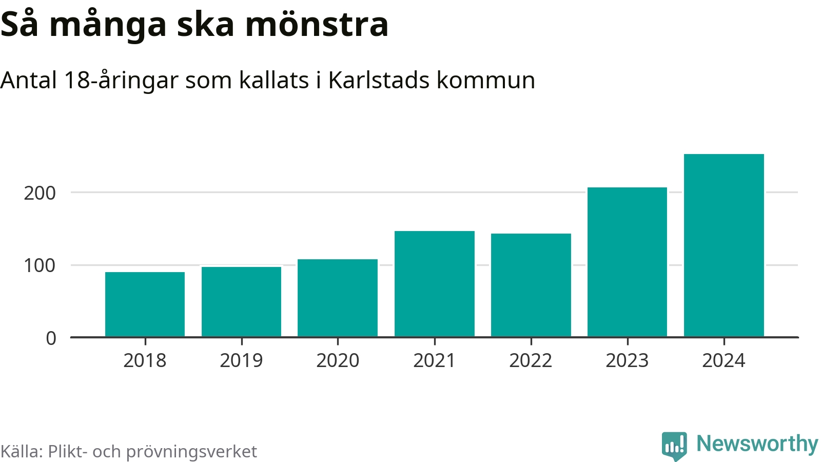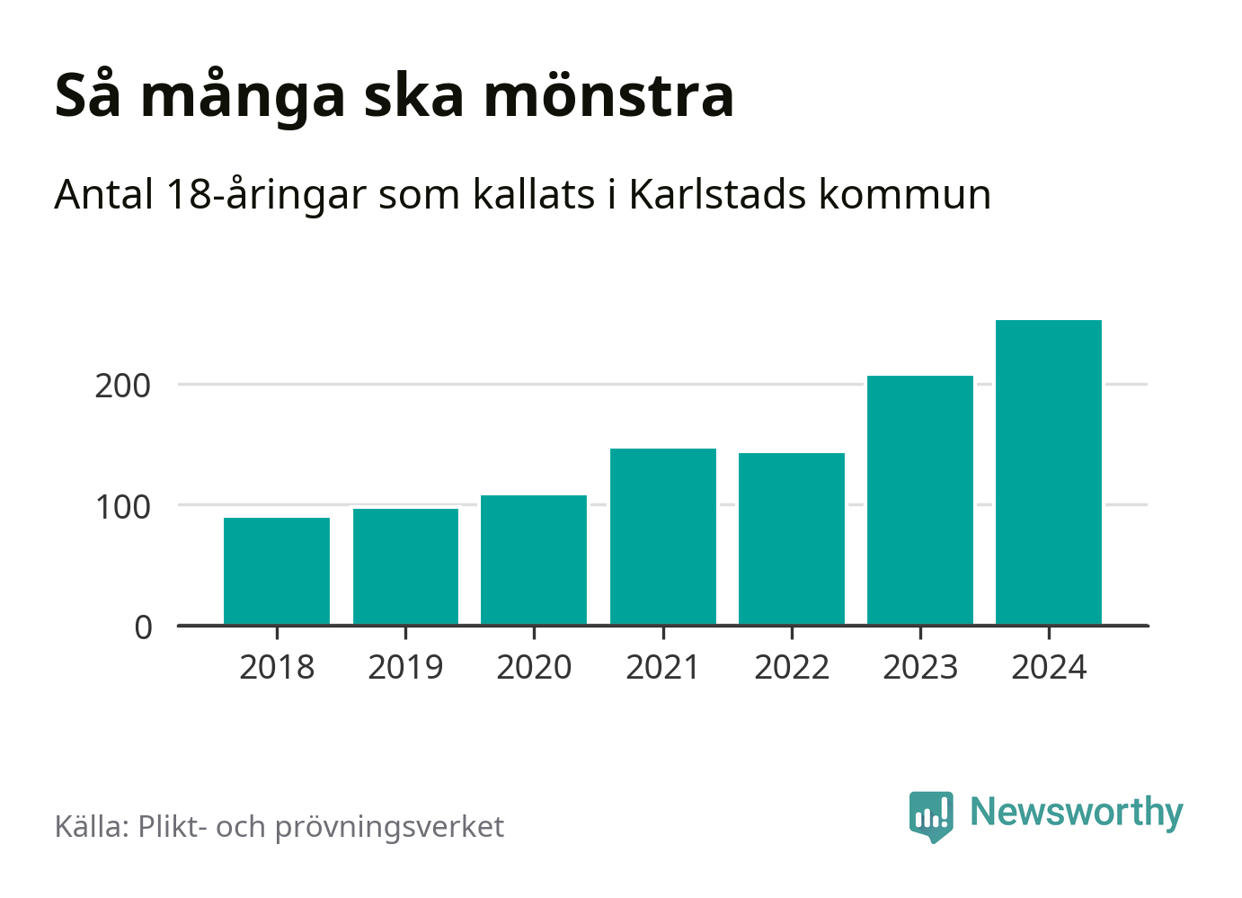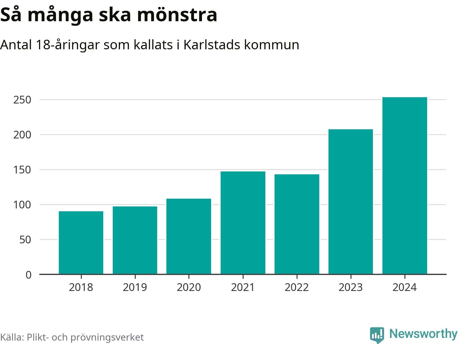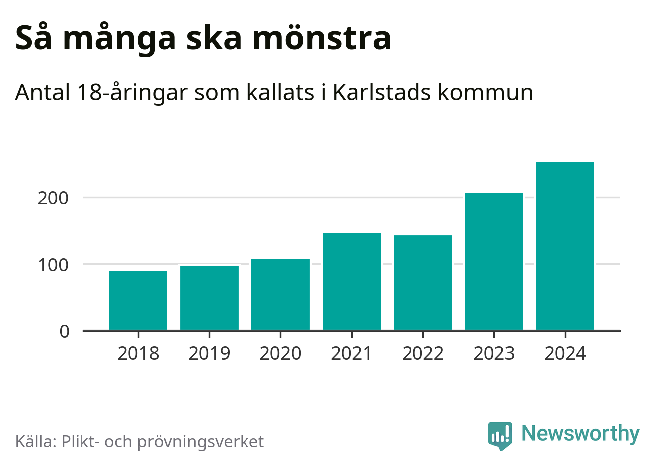 254 personer är det högsta antalet kallade i Karlstad sedan 2018, som är första året med statistik på kommunnivå (värnplikten återinfördes 2017), och 46 mönstrande mer än 2023. 2018 kallades som jämförelse 91 artonåringar från Karlstad till mönstring. Det motsvarade ungefär 10 procent av årskullen född år 2000. Totalt från Värmlands län kallas 705 personer födda 2006 i år.