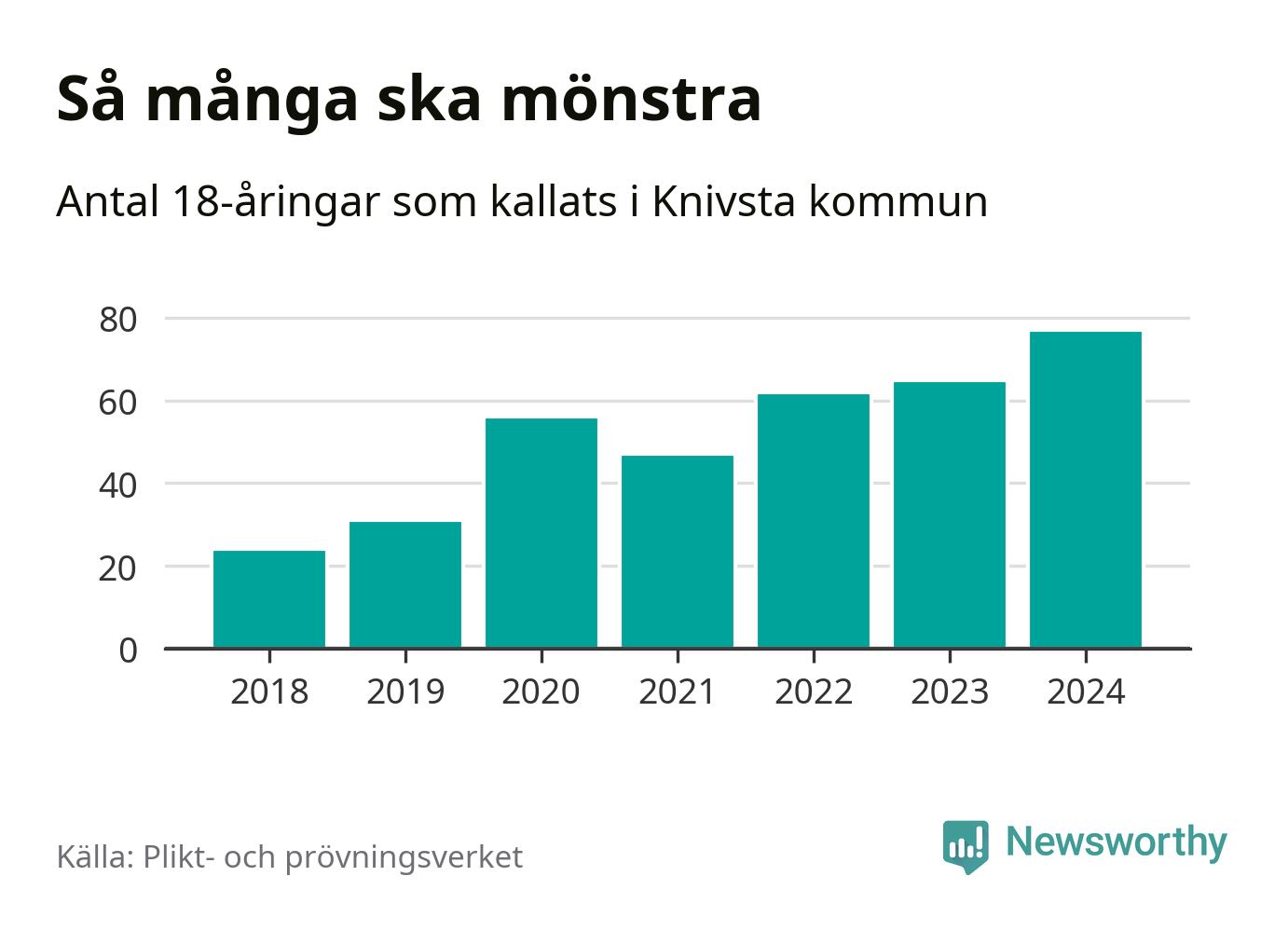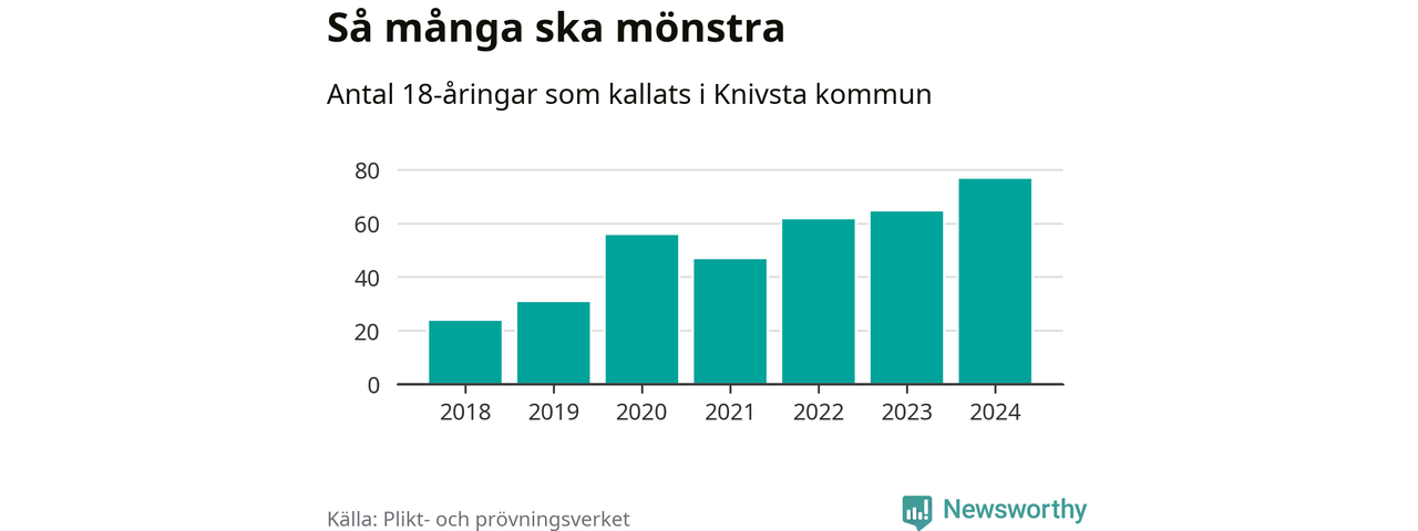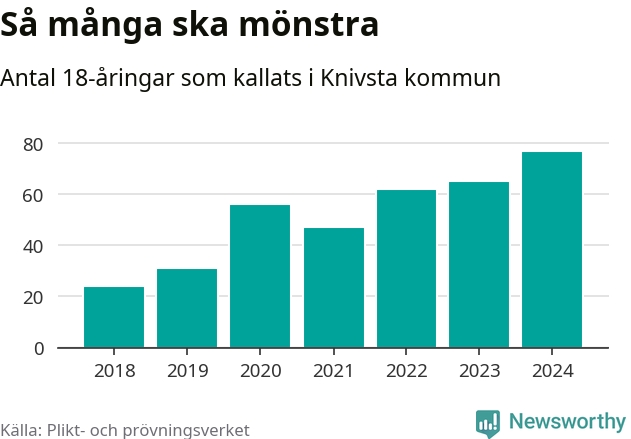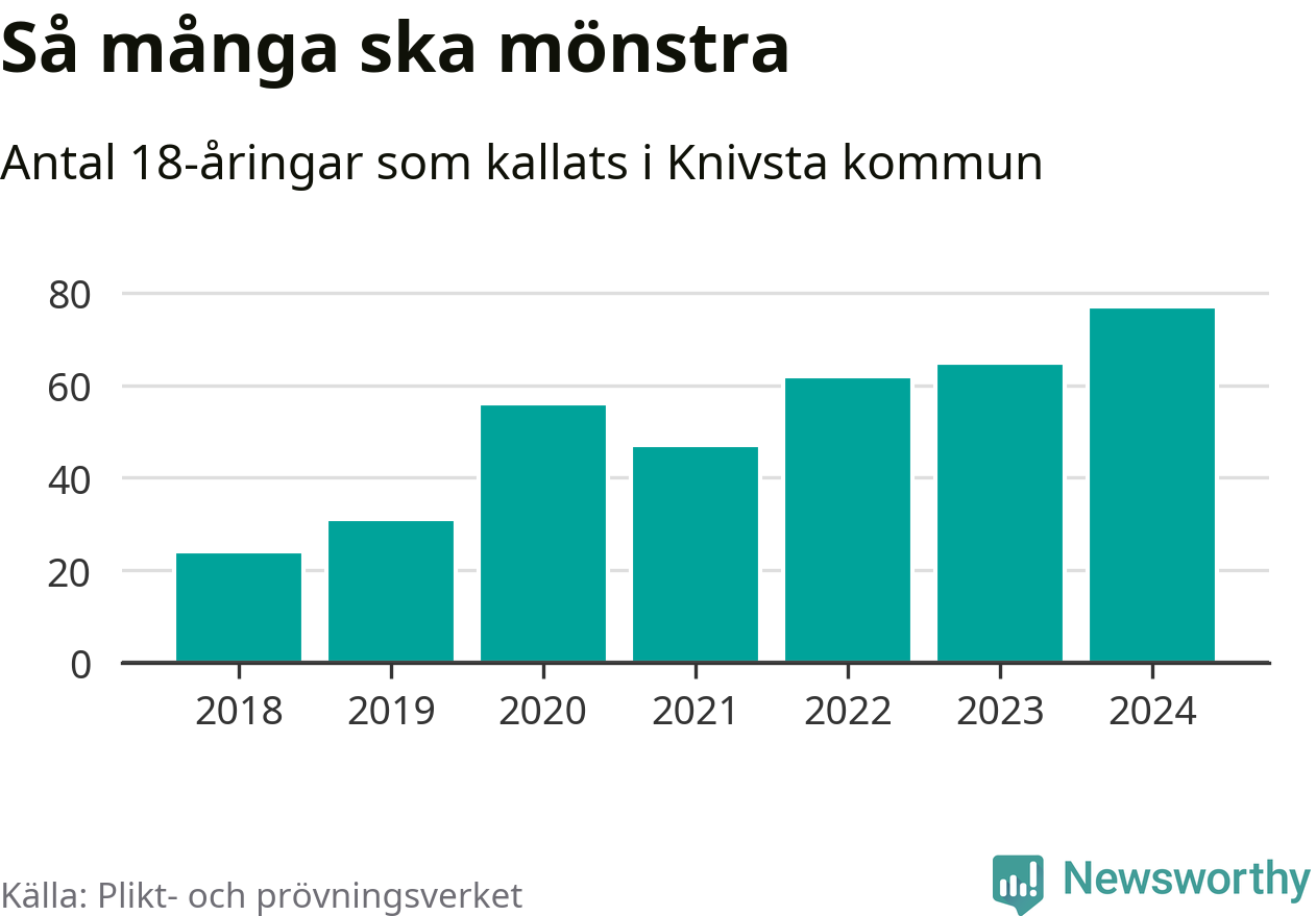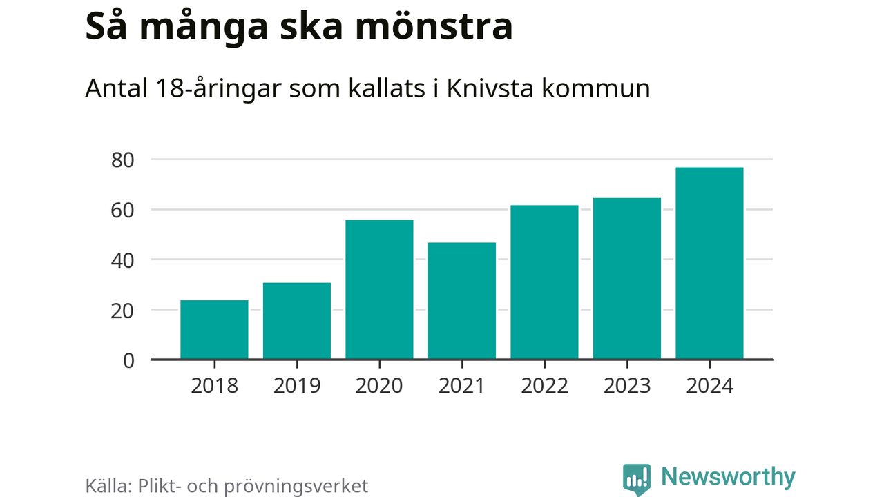 77 personer är det högsta antalet kallade i Knivsta sedan 2018, som är första året med statistik på kommunnivå (värnplikten återinfördes 2017), och tolv mönstrande mer än 2023. 2018 kallades som jämförelse 24 artonåringar från Knivsta till mönstring. Det motsvarade ungefär 11 procent av årskullen född år 2000. Totalt från Uppsala län kallas 1 131 personer födda 2006 i år.
