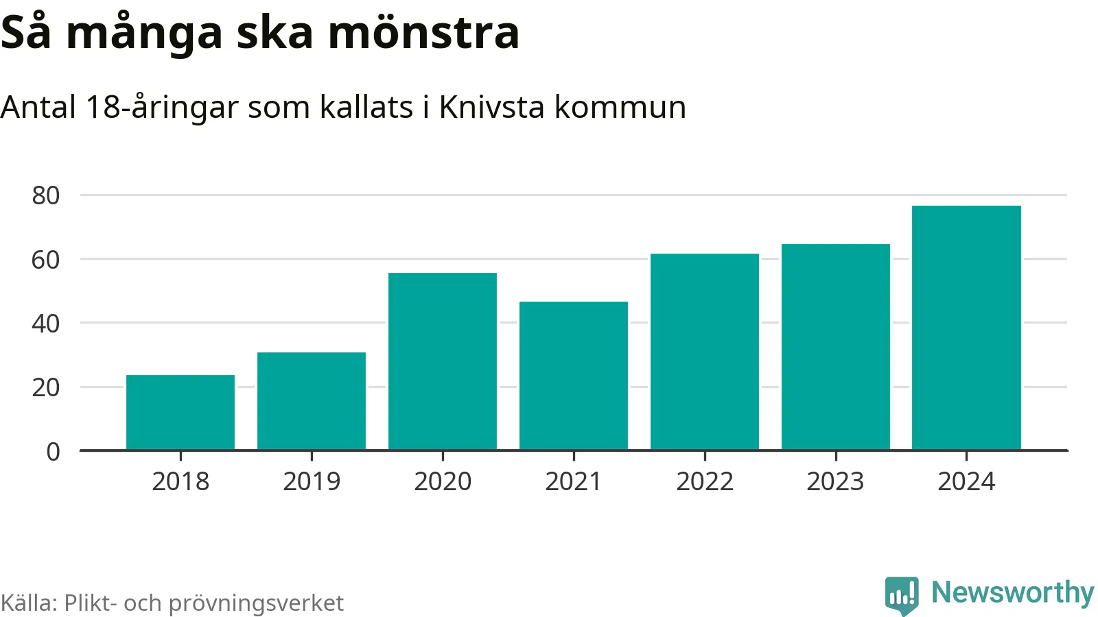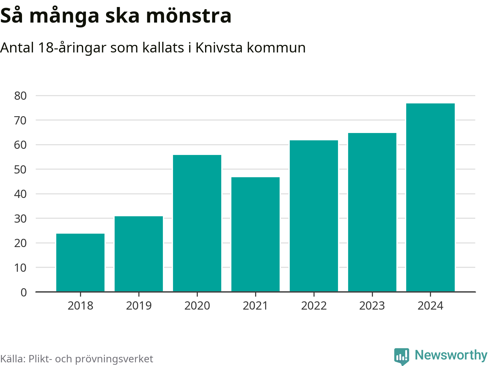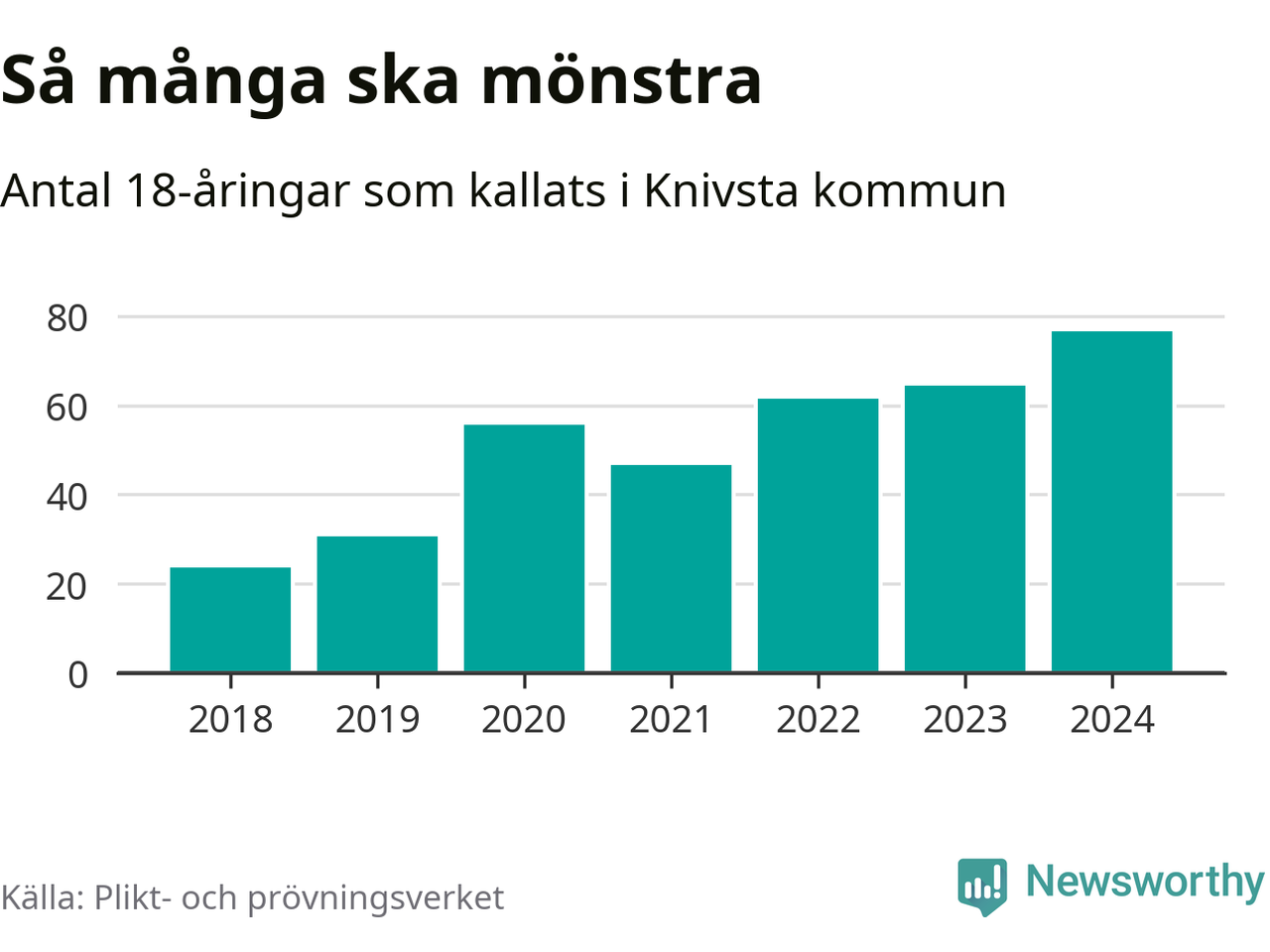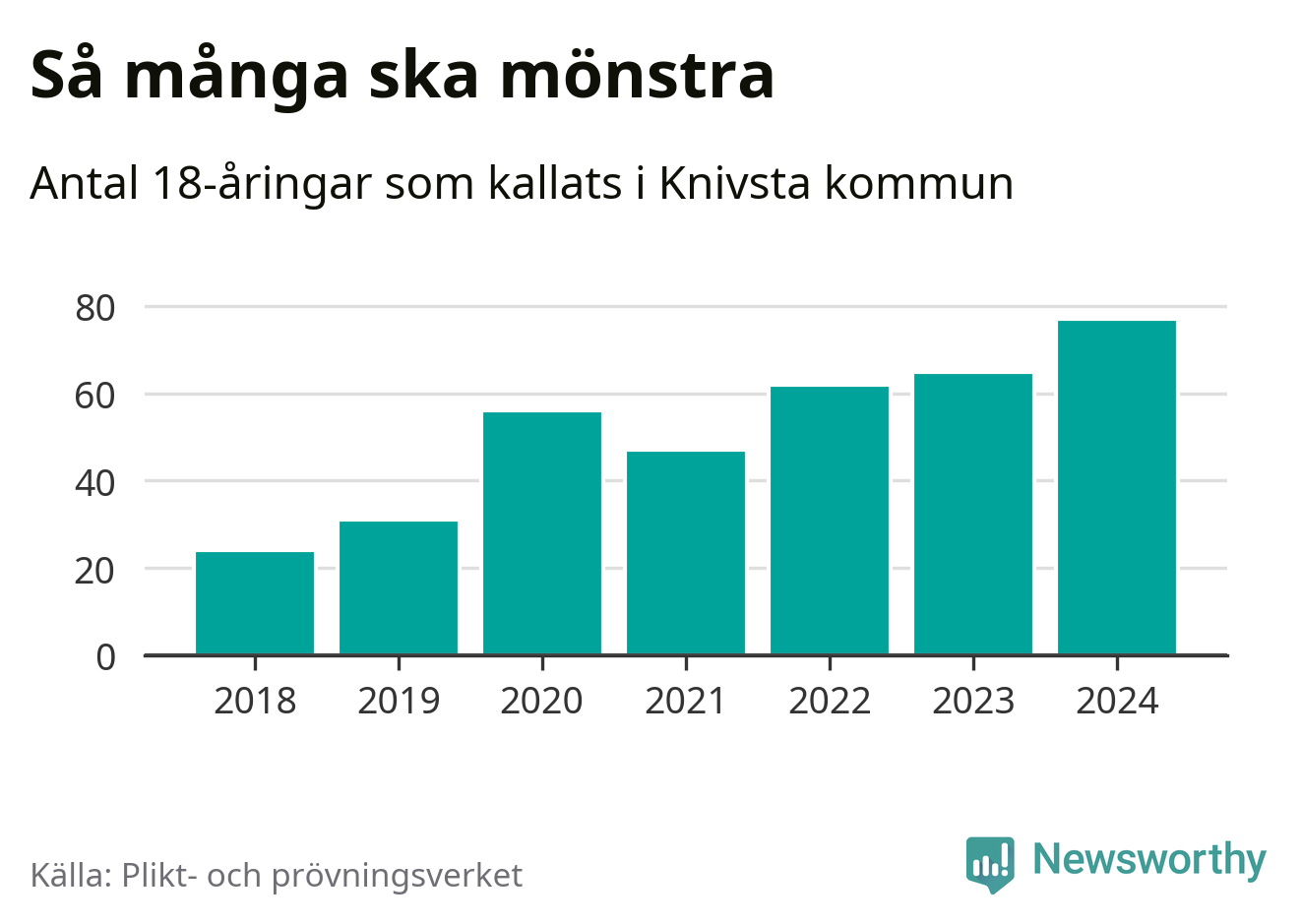 77 personer är det högsta antalet kallade i Knivsta sedan 2018, som är första året med statistik på kommunnivå (värnplikten återinfördes 2017), och tolv mönstrande mer än 2023. 2018 kallades som jämförelse 24 artonåringar från Knivsta till mönstring. Det motsvarade ungefär 11 procent av årskullen född år 2000. Totalt från Uppsala län kallas 1 131 personer födda 2006 i år.