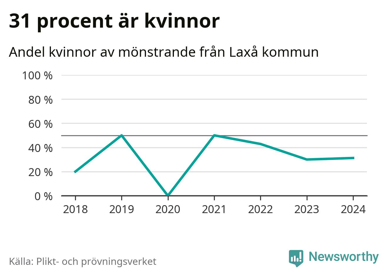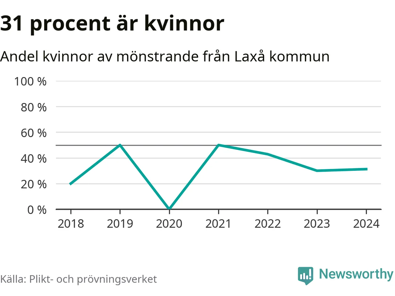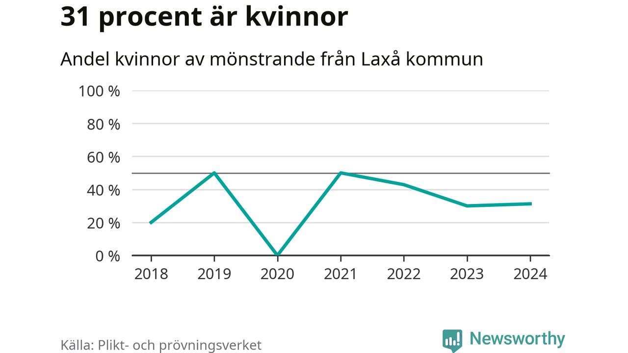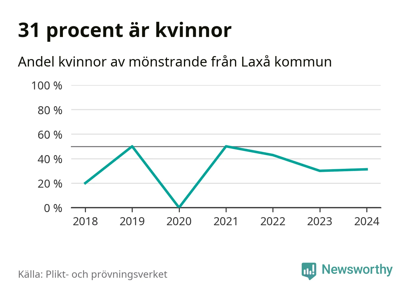 Fem av de som kallats till mönstring från Laxå är kvinnor, vilket motsvarar 31 procent av de mönstrande. I absoluta tal är det fler kvinnor än något år sedan värnplikten återinfördes, men 2021 och 2019 var en större andel av de mönstrande från kommunen kvinnor (50 procent). I riket som helhet är 30 procent av de mönstrande tjejer.