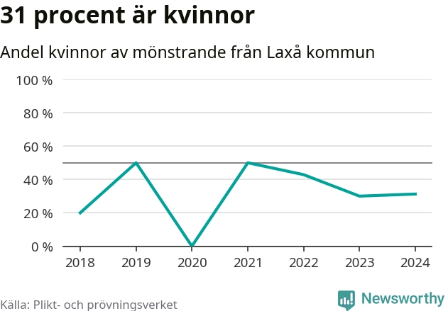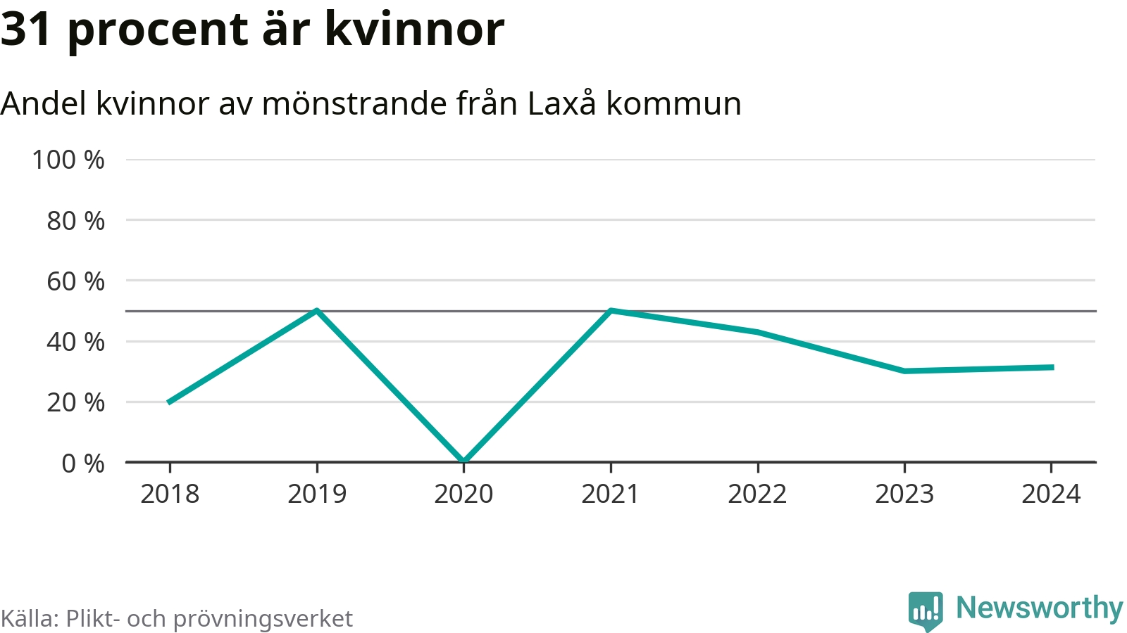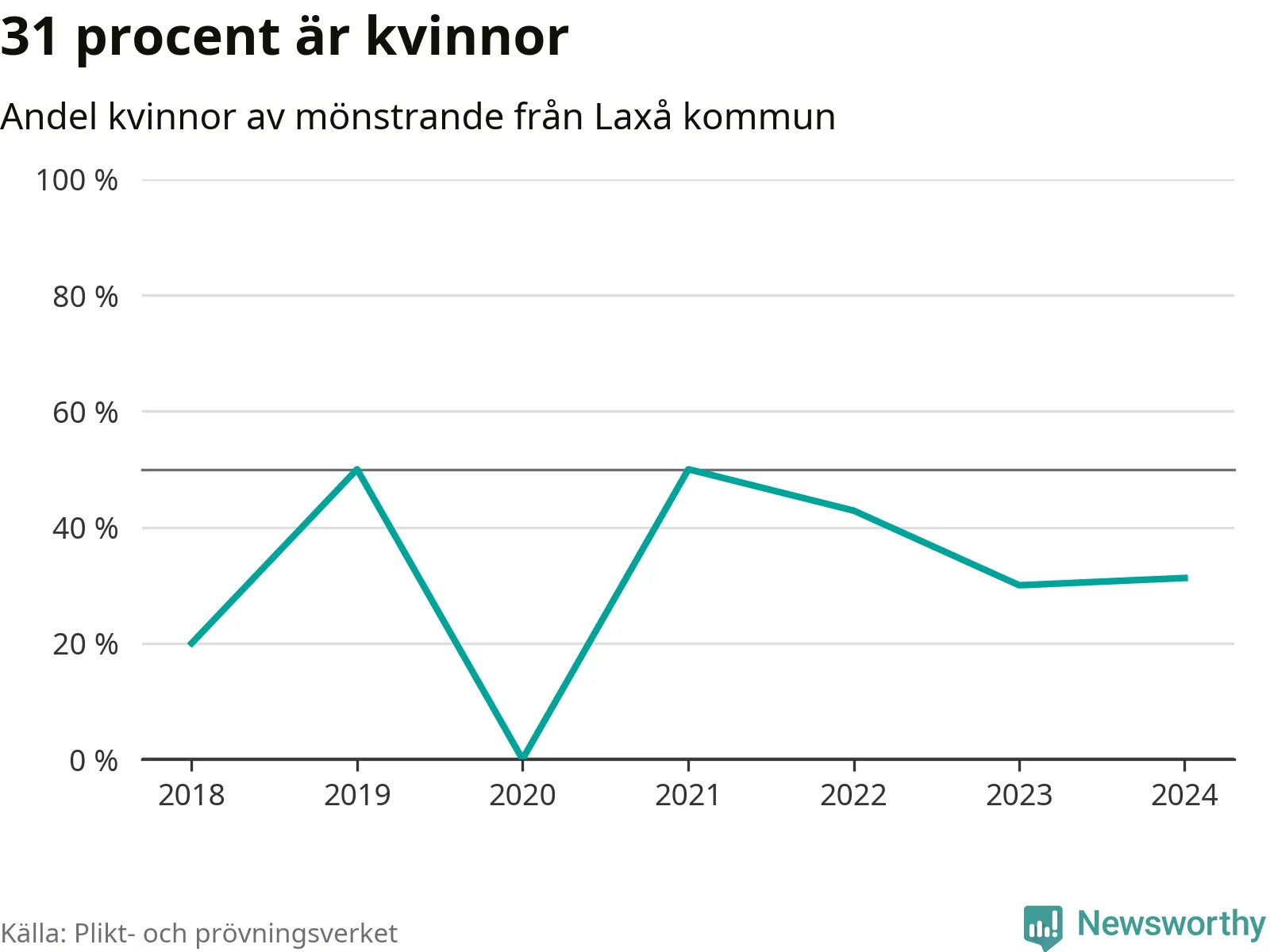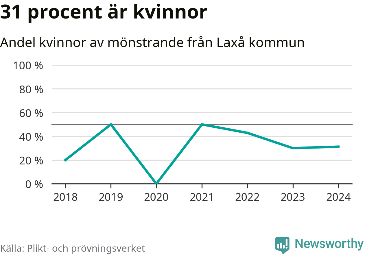 Fem av de som kallats till mönstring från Laxå är kvinnor, vilket motsvarar 31 procent av de mönstrande. I absoluta tal är det fler kvinnor än något år sedan värnplikten återinfördes, men 2021 och 2019 var en större andel av de mönstrande från kommunen kvinnor (50 procent). I riket som helhet är 30 procent av de mönstrande tjejer.