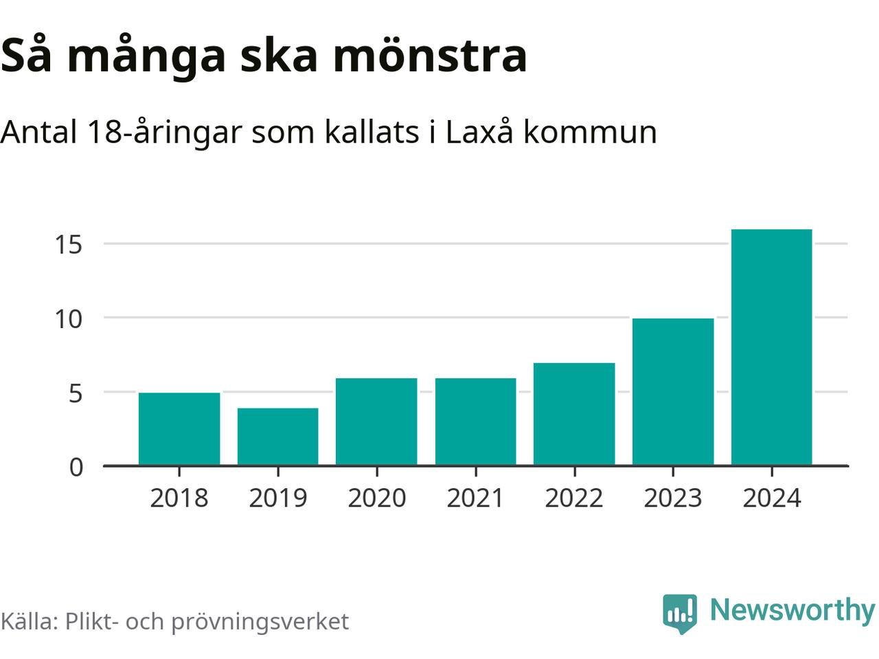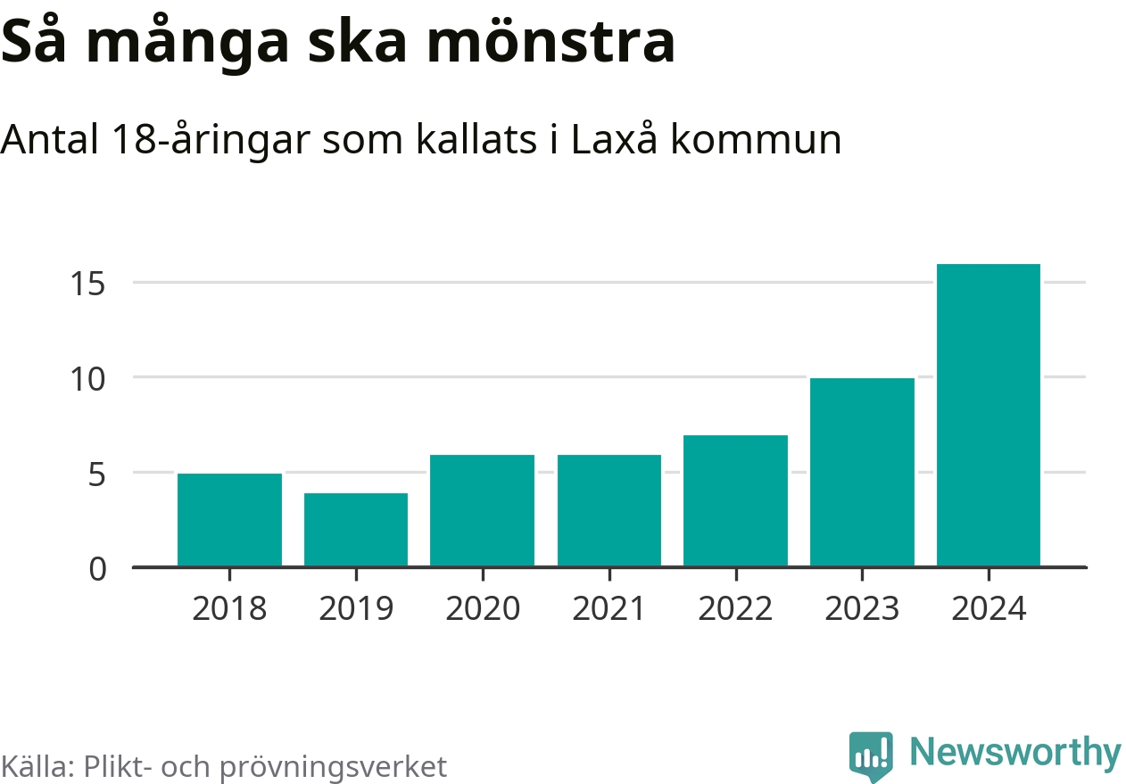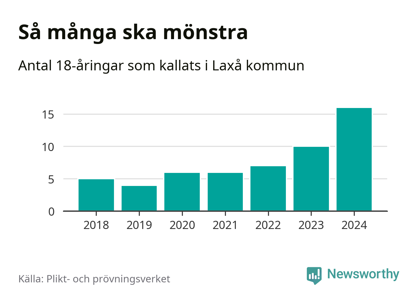 16 personer är det högsta antalet kallade i Laxå sedan 2018, som är första året med statistik på kommunnivå (värnplikten återinfördes 2017), och sex mönstrande mer än 2023. 2018 kallades som jämförelse fem 18-åringar från Laxå till mönstring. Det motsvarade ungefär 8 procent av årskullen född år 2000. Totalt från Örebro län kallas 786 personer födda 2006 i år.