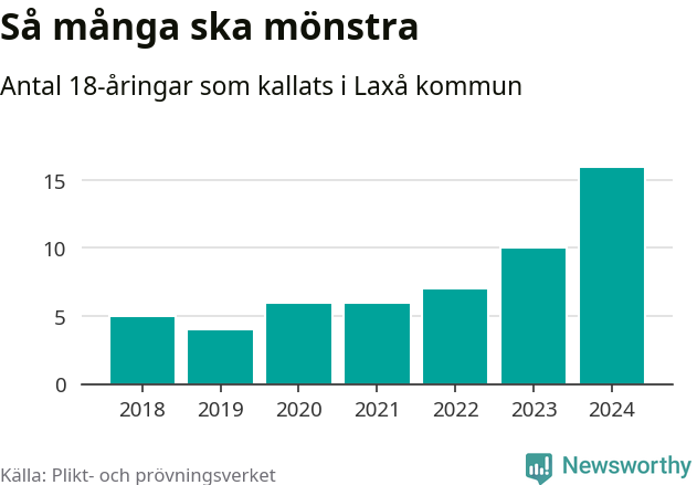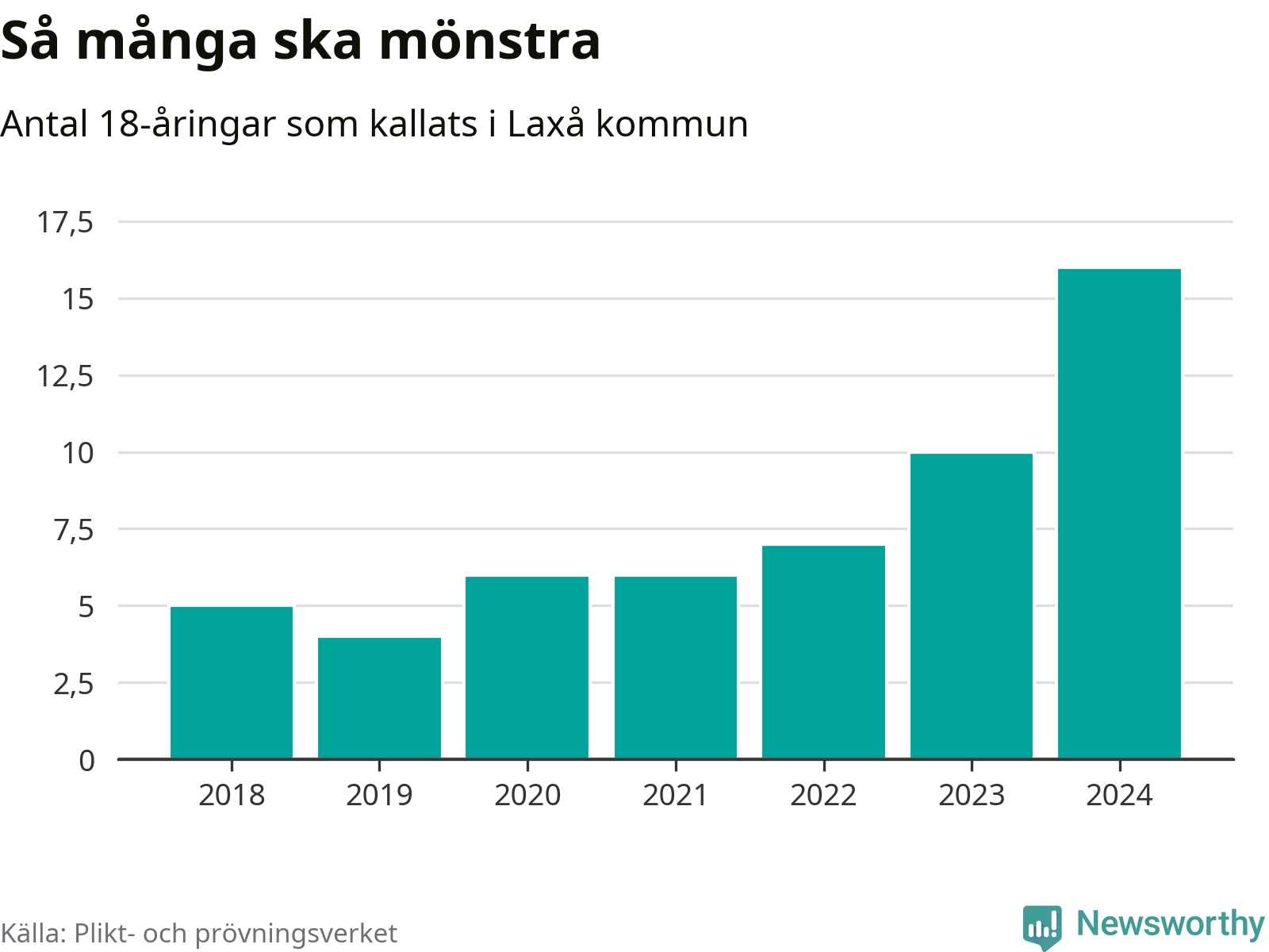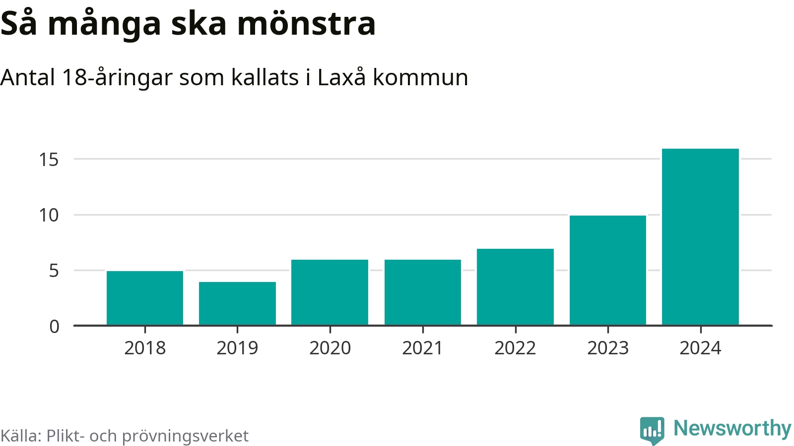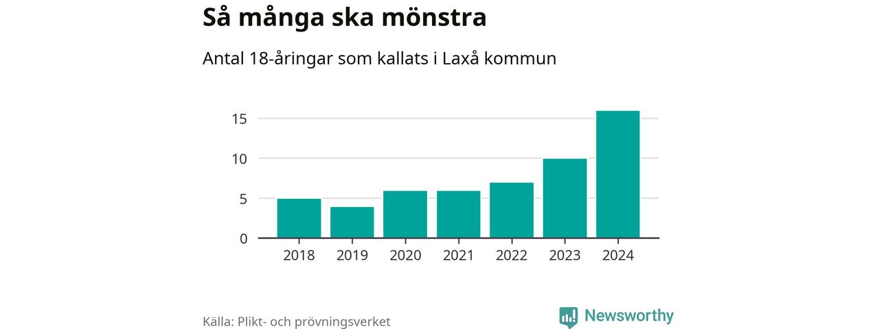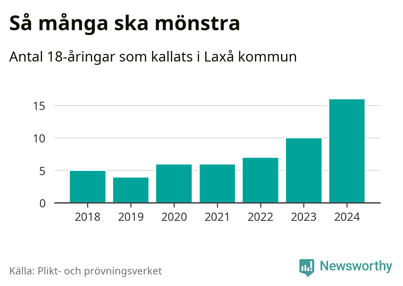16 personer är det högsta antalet kallade i Laxå sedan 2018, som är första året med statistik på kommunnivå (värnplikten återinfördes 2017), och sex mönstrande mer än 2023. 2018 kallades som jämförelse fem 18-åringar från Laxå till mönstring. Det motsvarade ungefär 8 procent av årskullen född år 2000. Totalt från Örebro län kallas 786 personer födda 2006 i år.