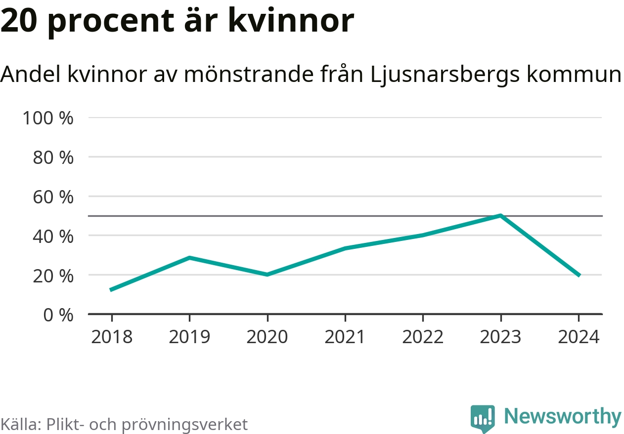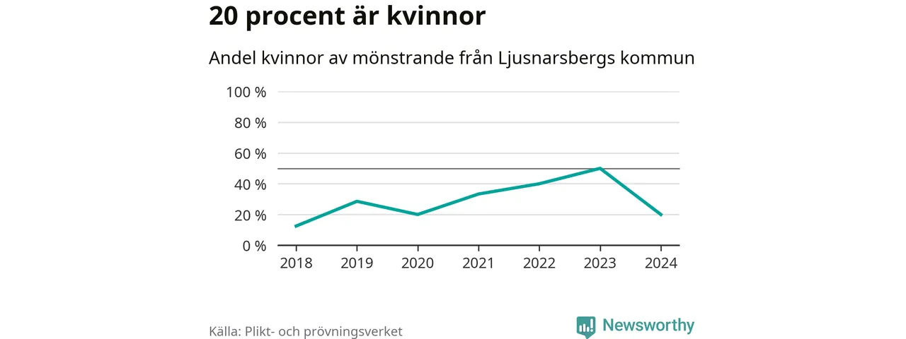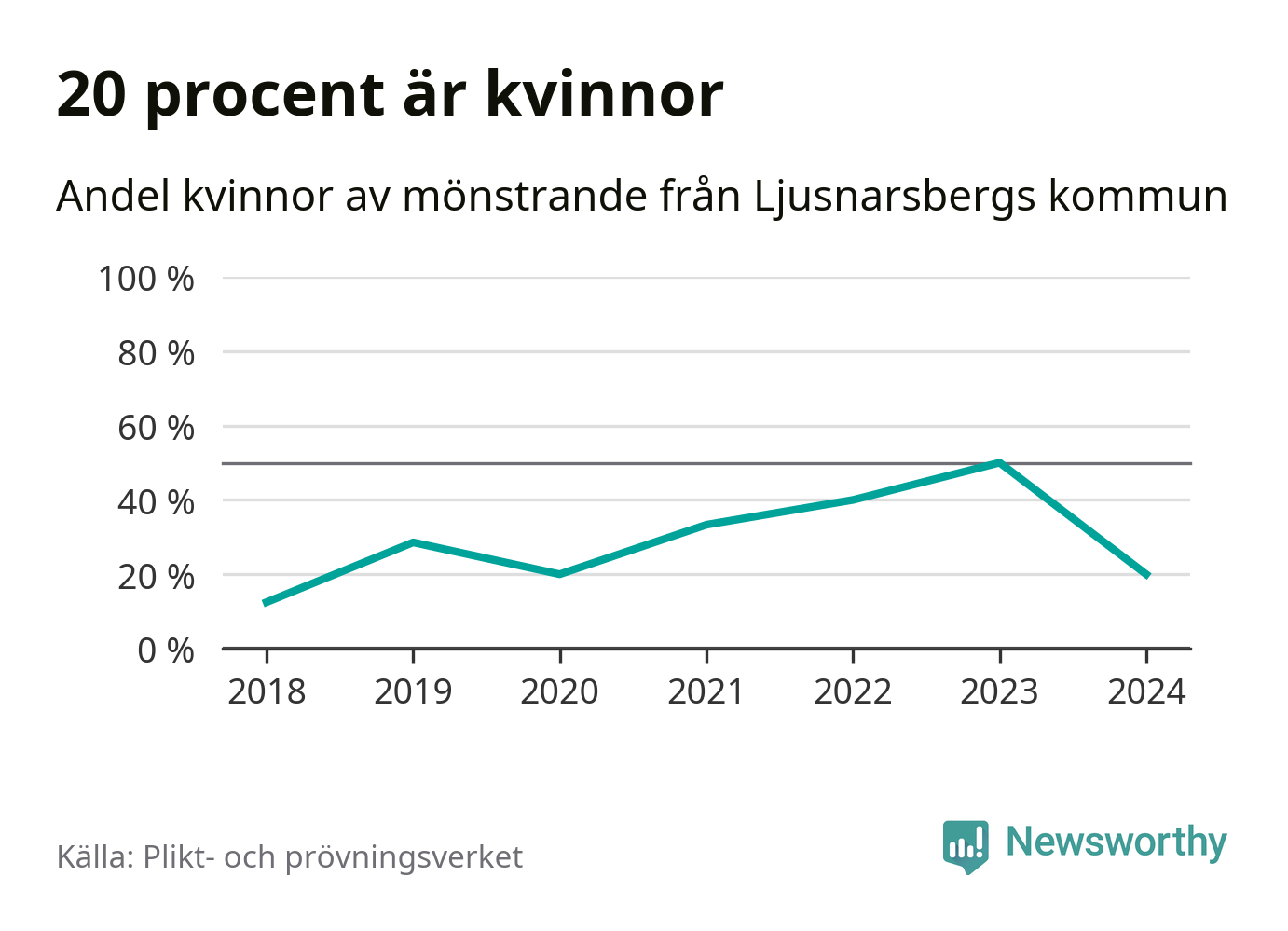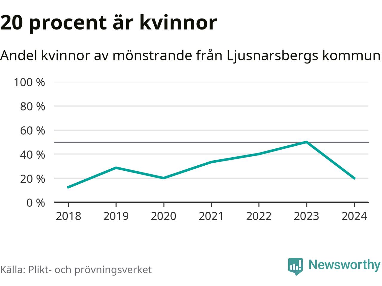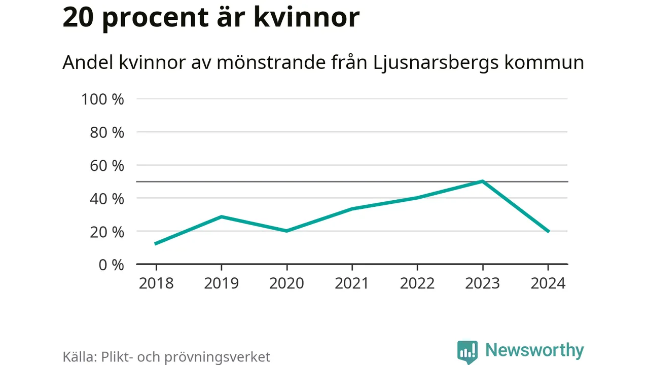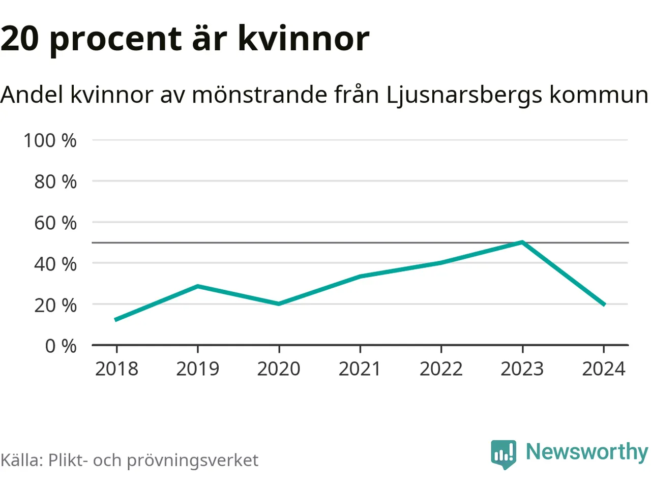 En av de som kallats till mönstring från Ljusnarsberg är kvinna. Som mest har fyra kvinnor kallats från kommunen (2023). I riket som helhet är 30 procent av de mönstrande tjejer.